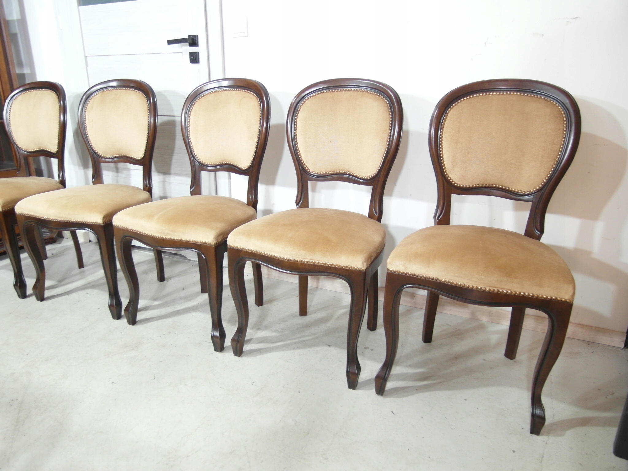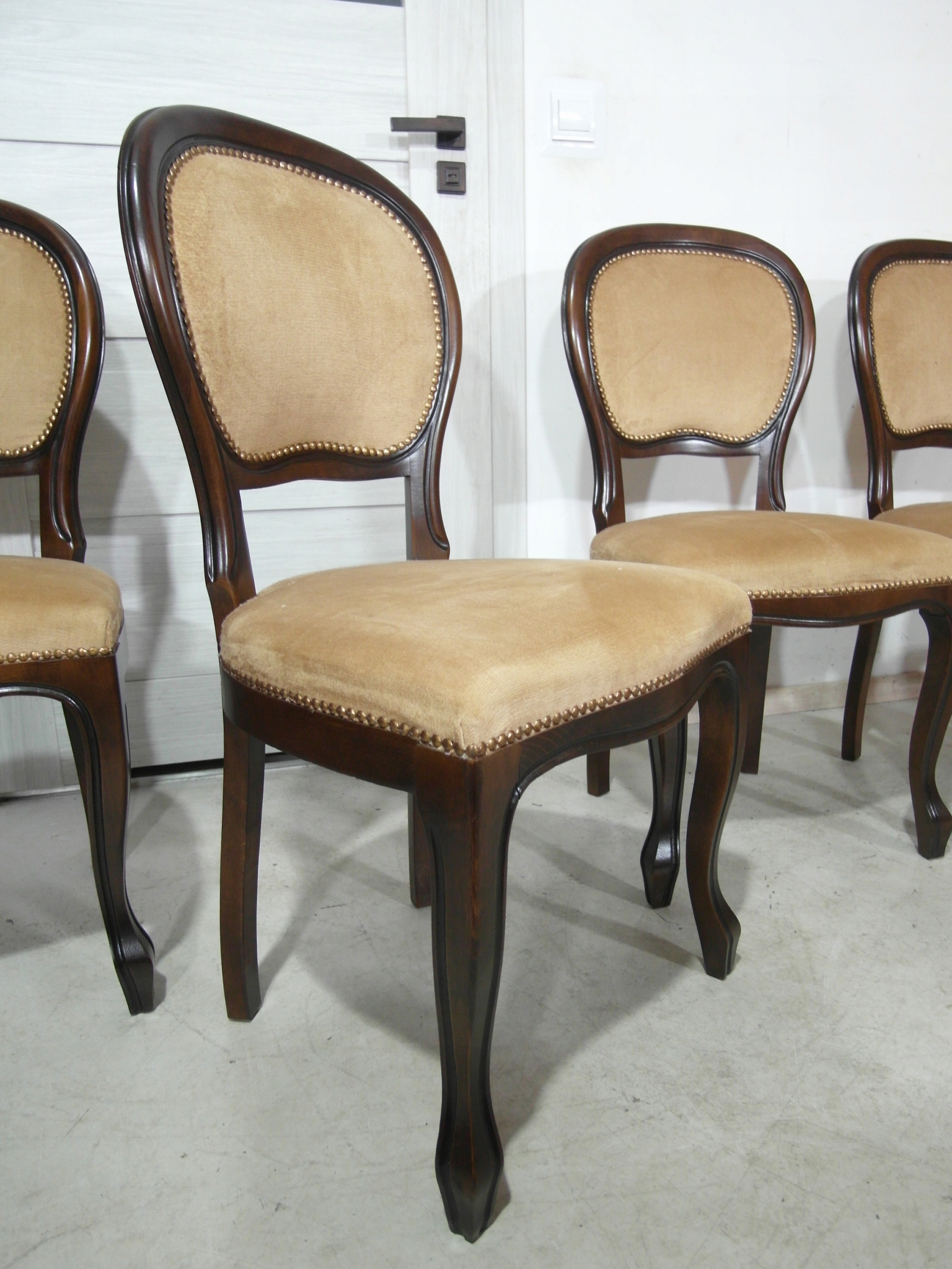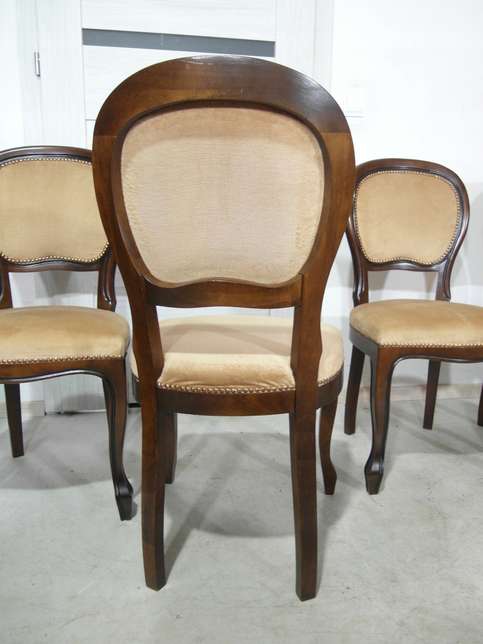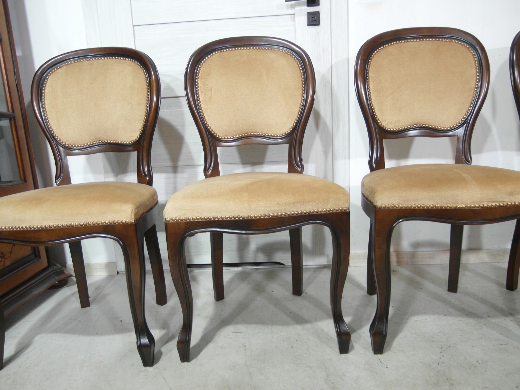 Opis: 4 krzesła w idealnym stanie , siedziska pokryte materiałem – materiał bez uszkodzeń