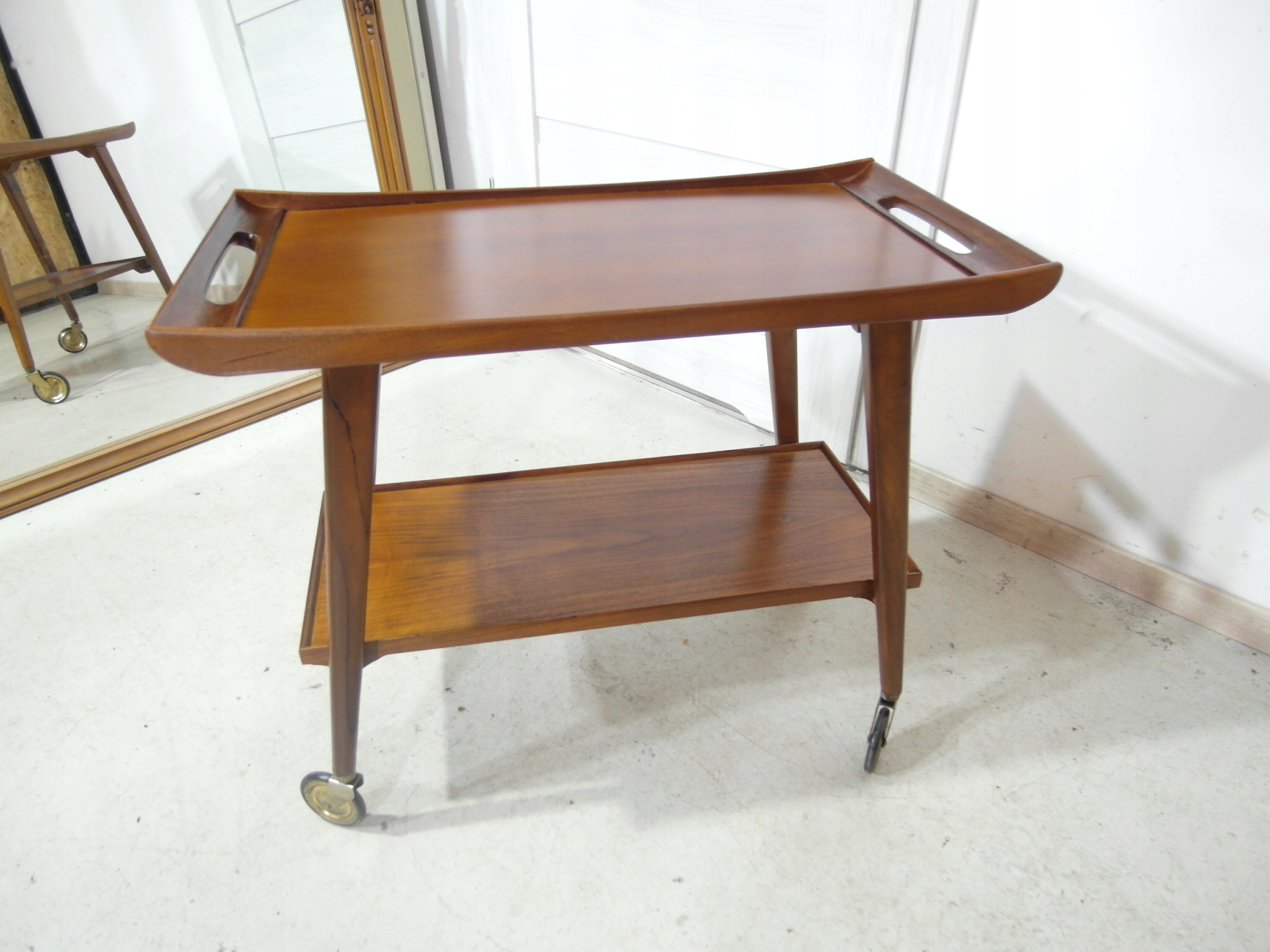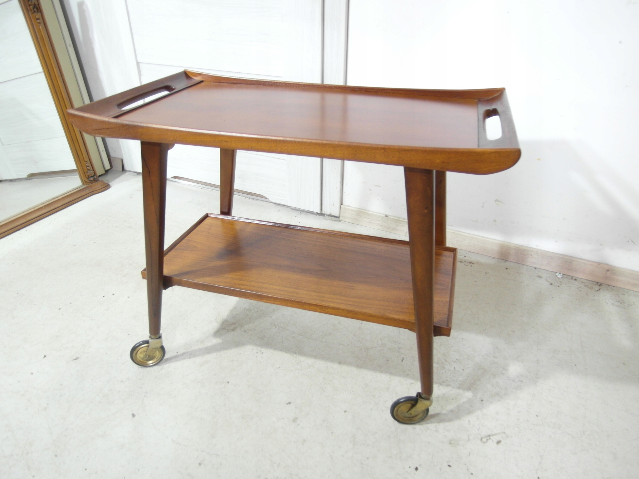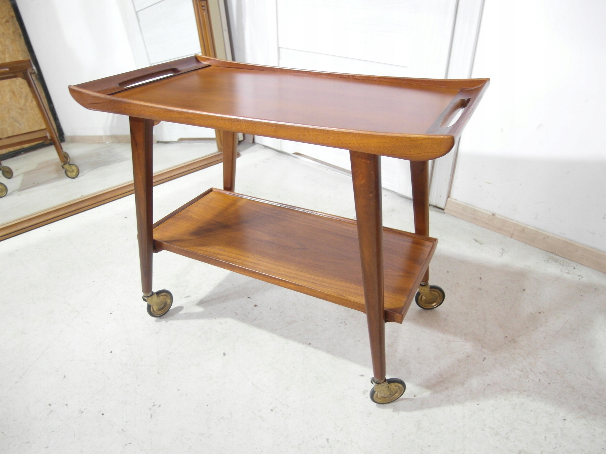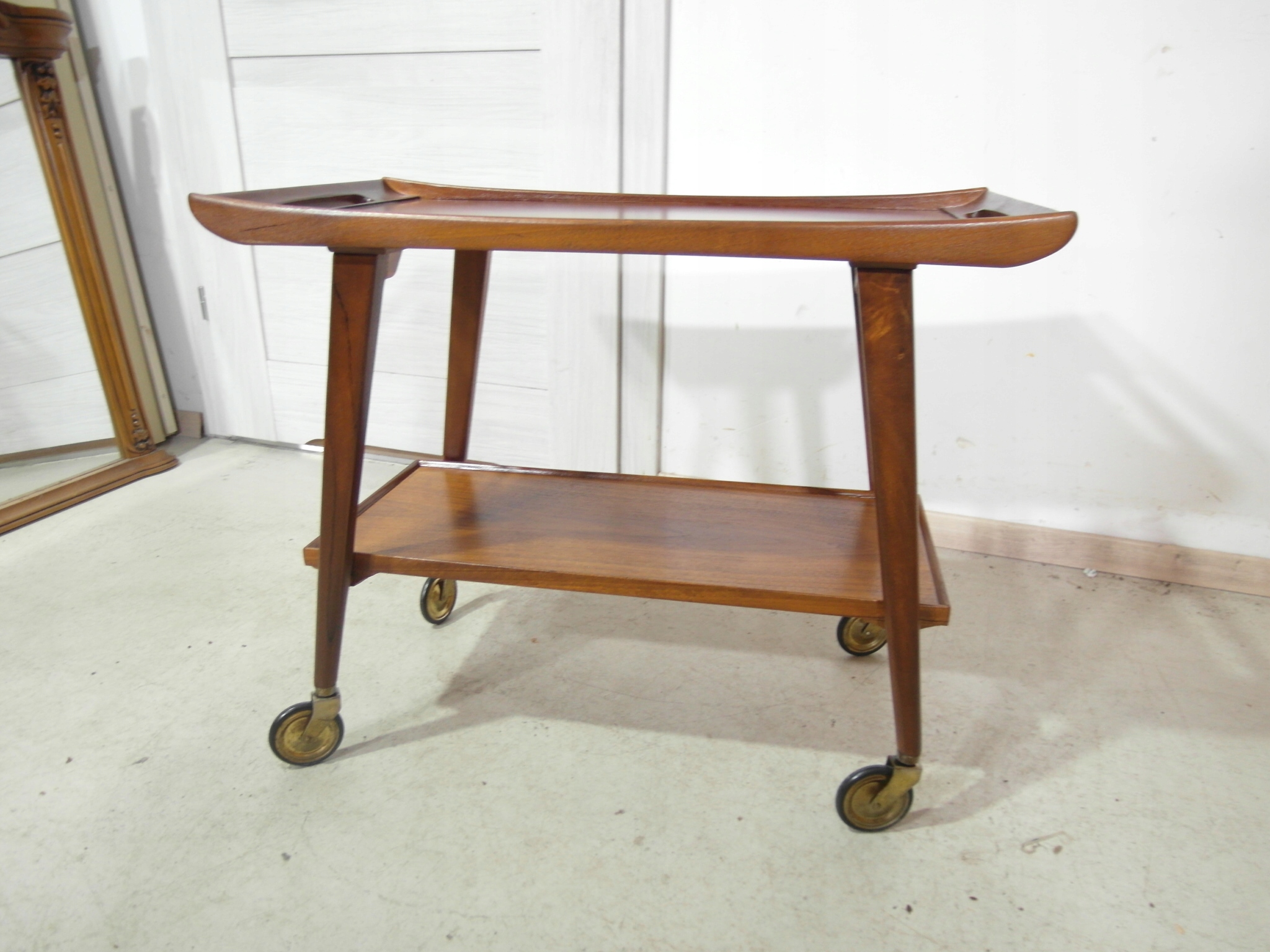 Opis: prostokątny stolik na kółkach, drewniany , stabilny, bardzo ładny , slicznie fornirowany