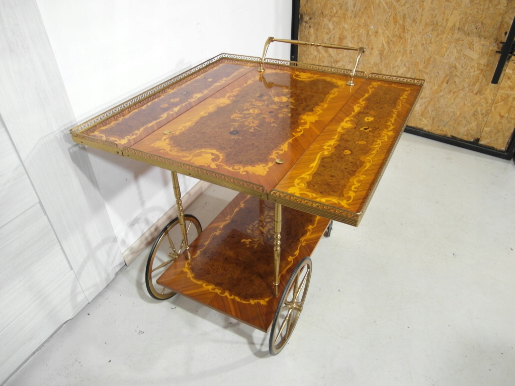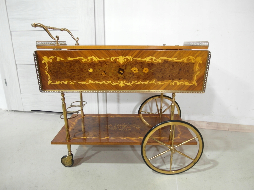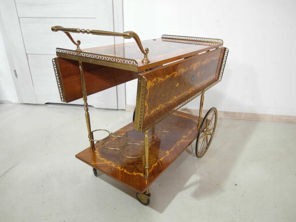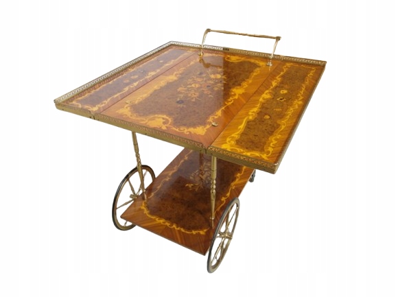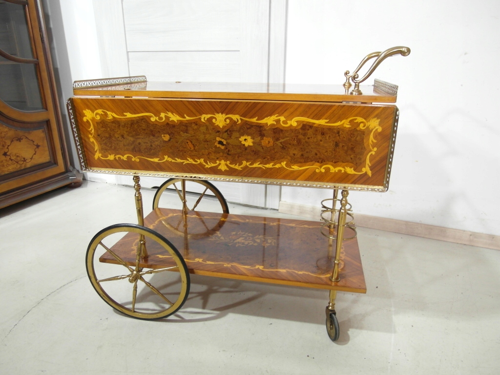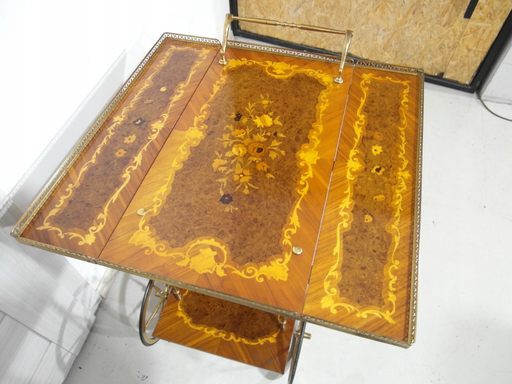Opis: stolik okrągły ,na smukłych zgrabnych nóżkach , bardzo ładny i proporcjonalny kształt, posiada przeszkloną dolna cześć zamykana drzwiczkami , blat wykończony aluminiową blachą