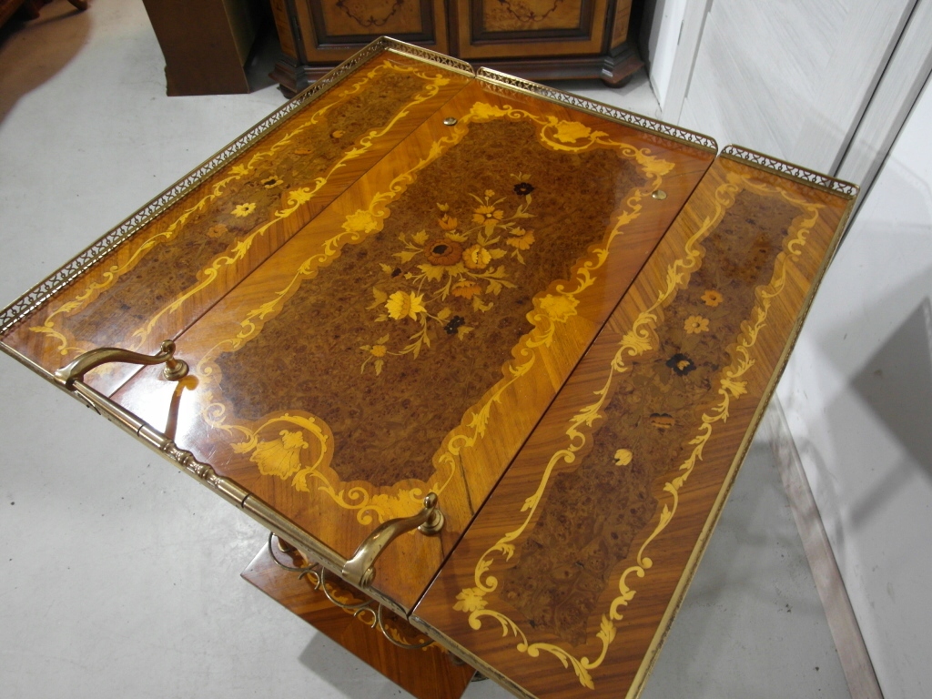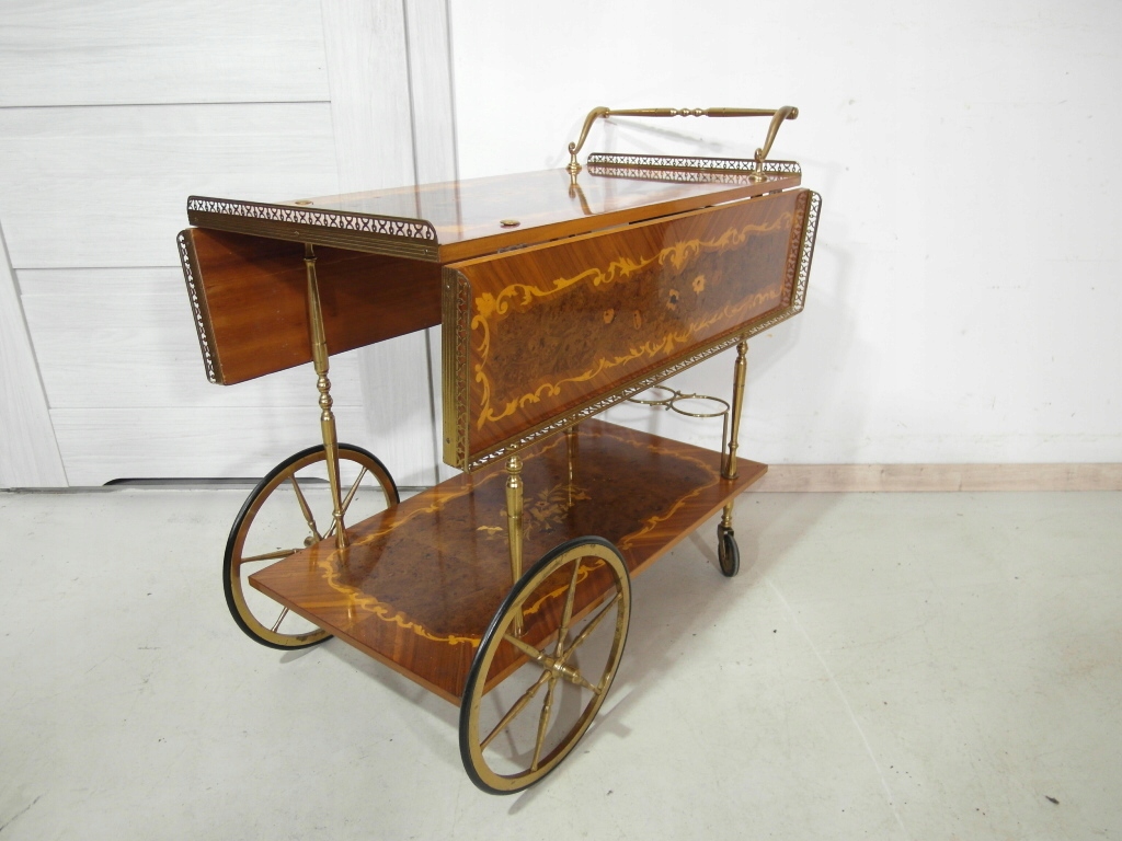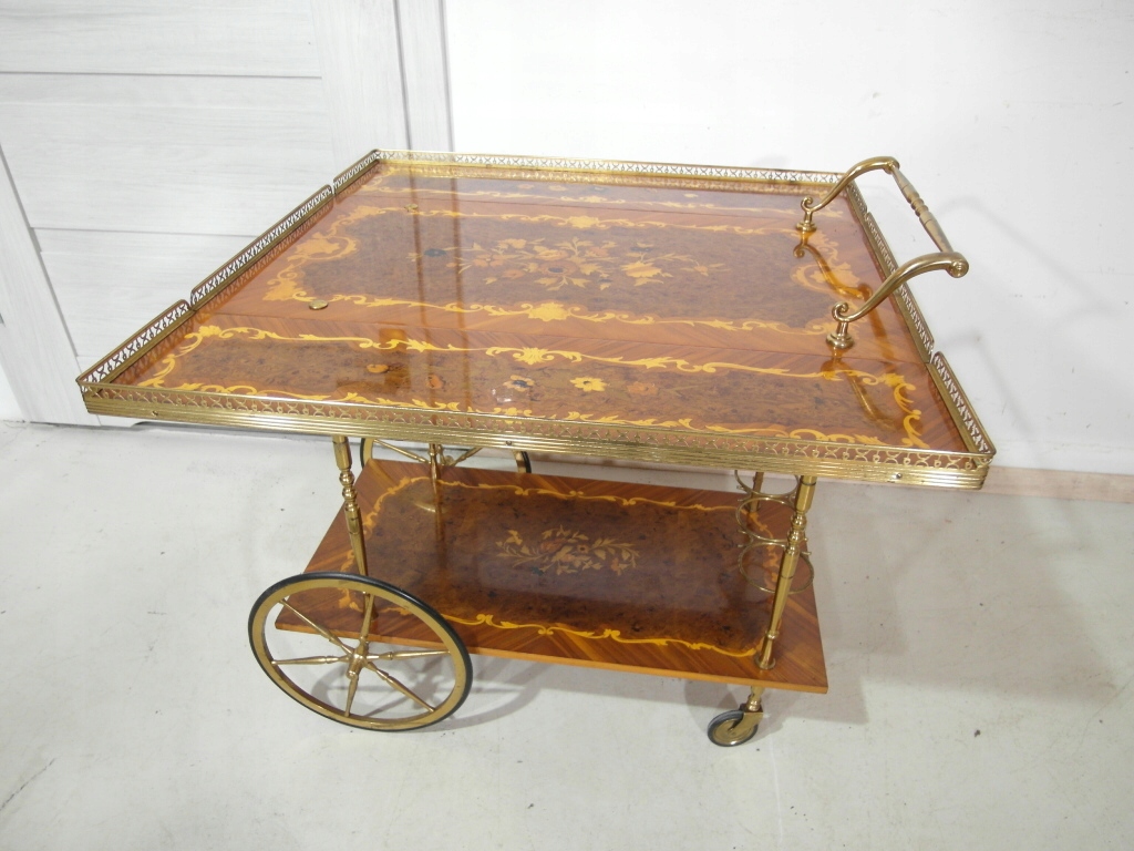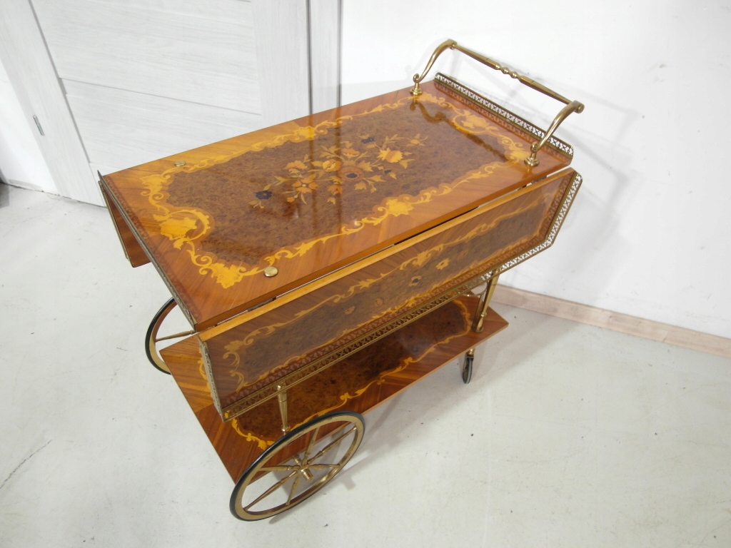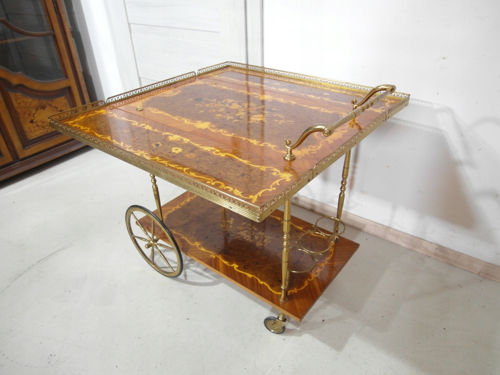 Opis: stolik okrągły ,na smukłych zgrabnych nóżkach , bardzo ładny i proporcjonalny kształt, posiada przeszkloną dolna cześć zamykana drzwiczkami , blat wykończony aluminiową blachą