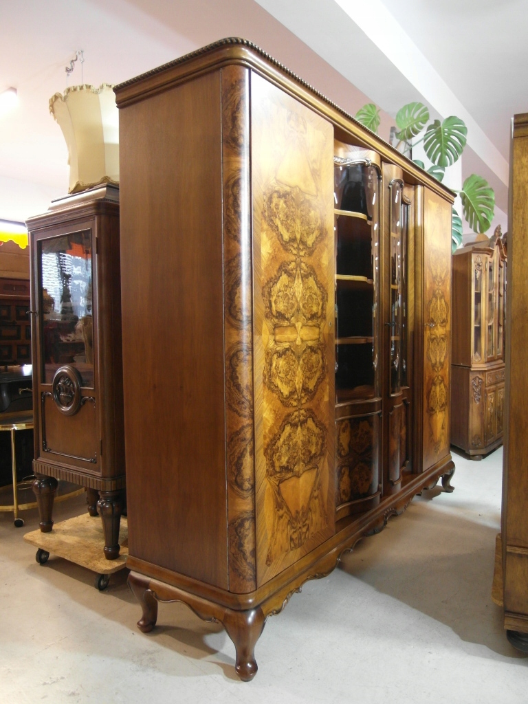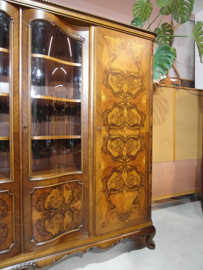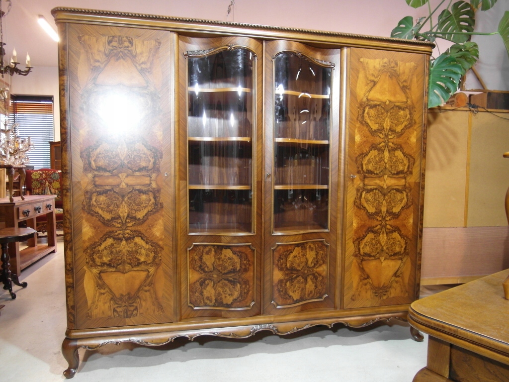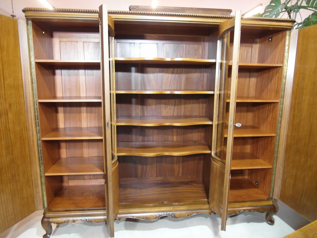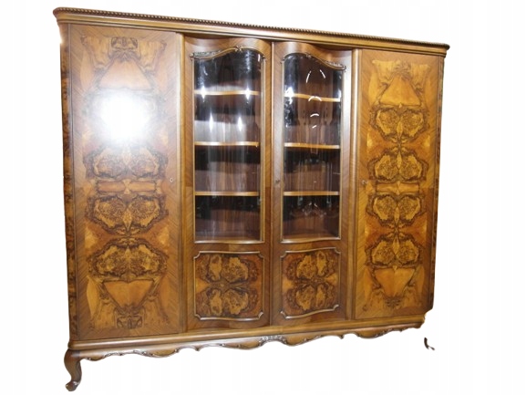 Opis: biblioteka z półkami przeszklona ZAMYKANA NA KLUCZ , W ŚRODKU PÓŁKI , kompletna , wszystko sprawne , oryginalne okucia,