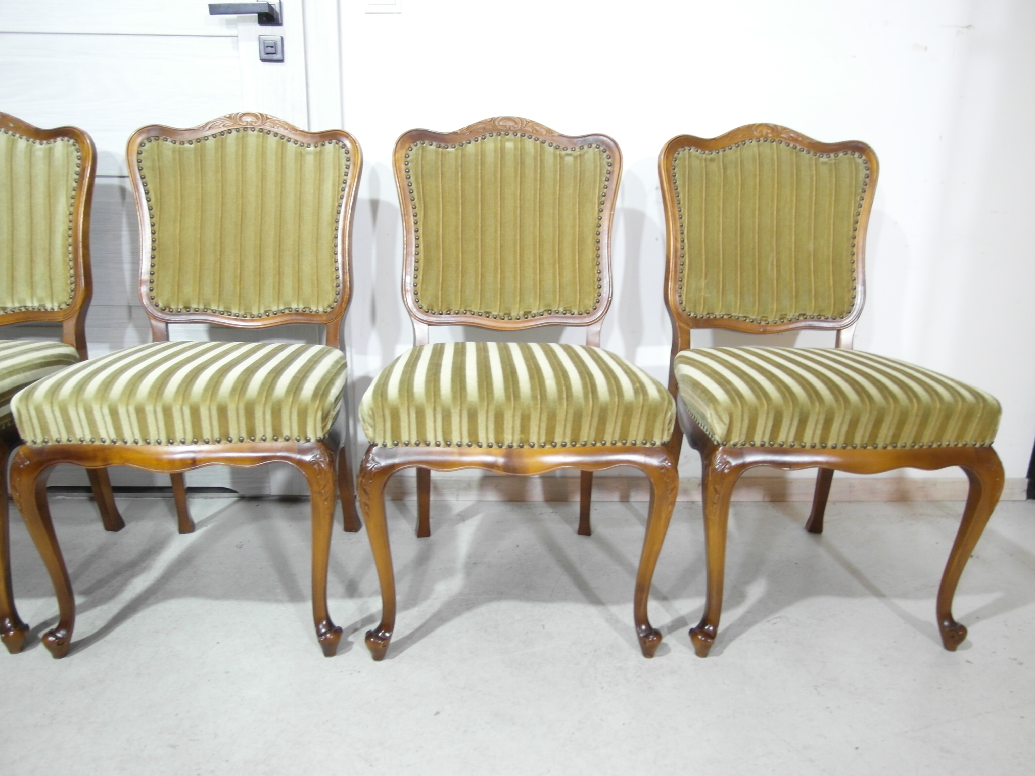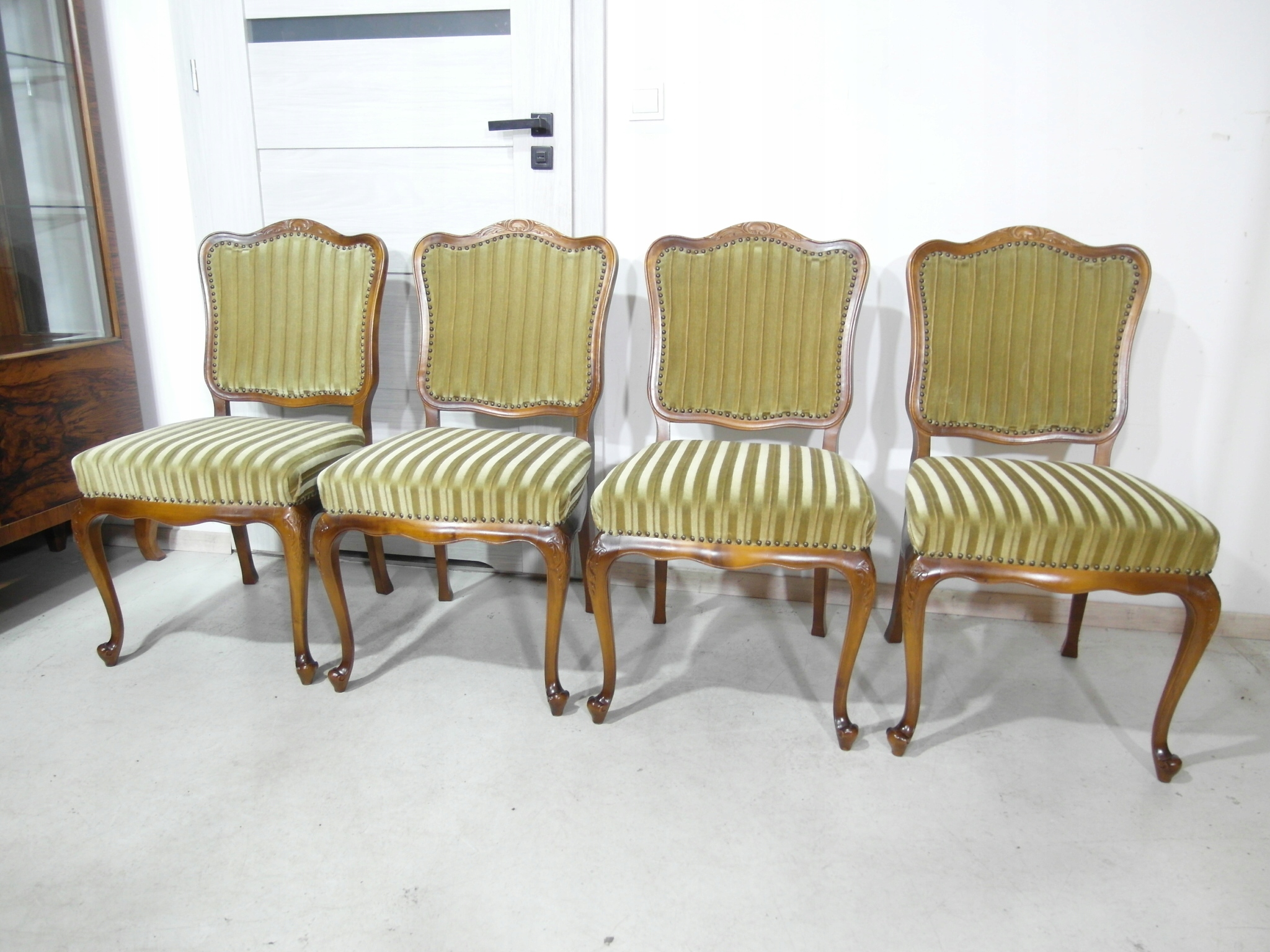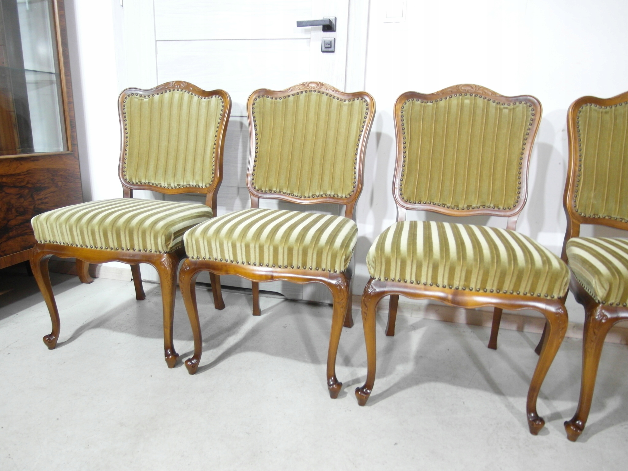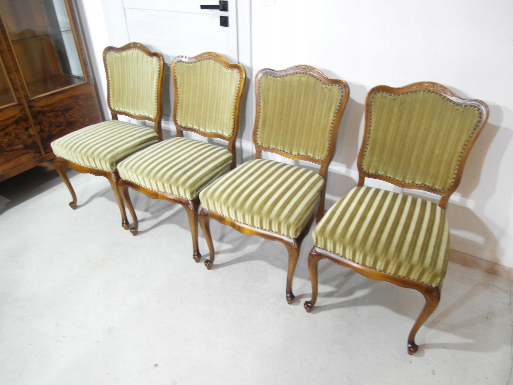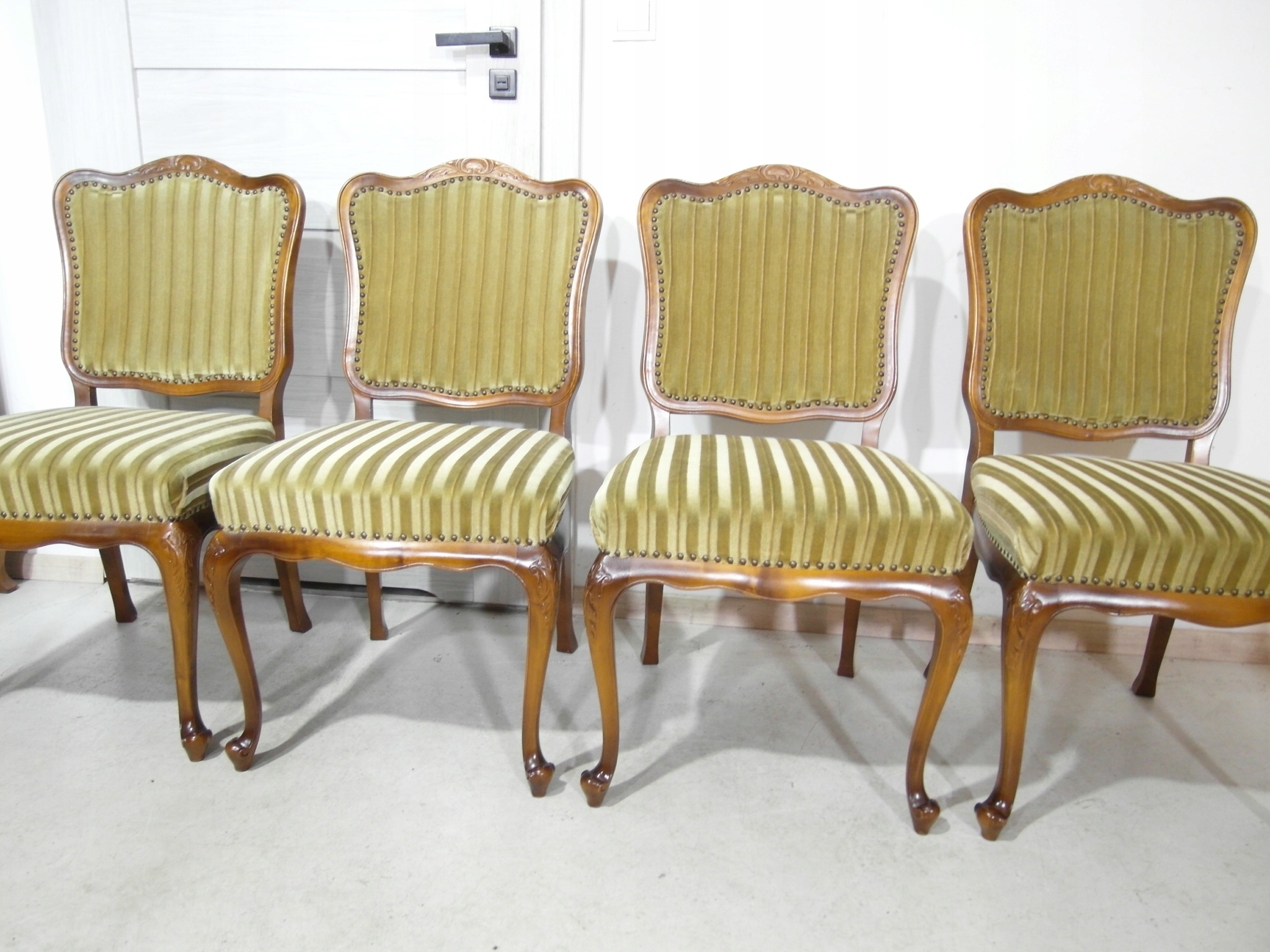 komplet 4 krzeseł , w super stanie , z drewna , materiał obszyci owy w super stanie żadnych uszkodzeń