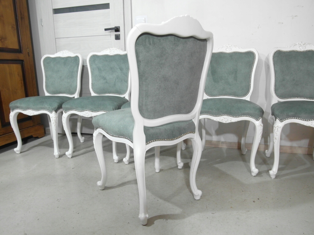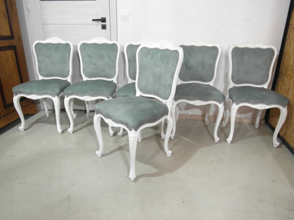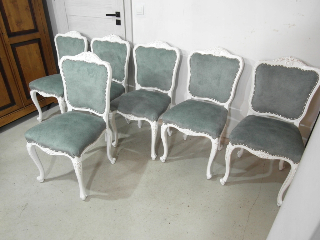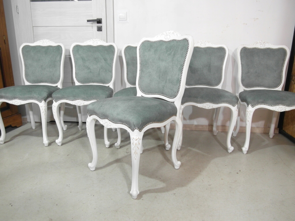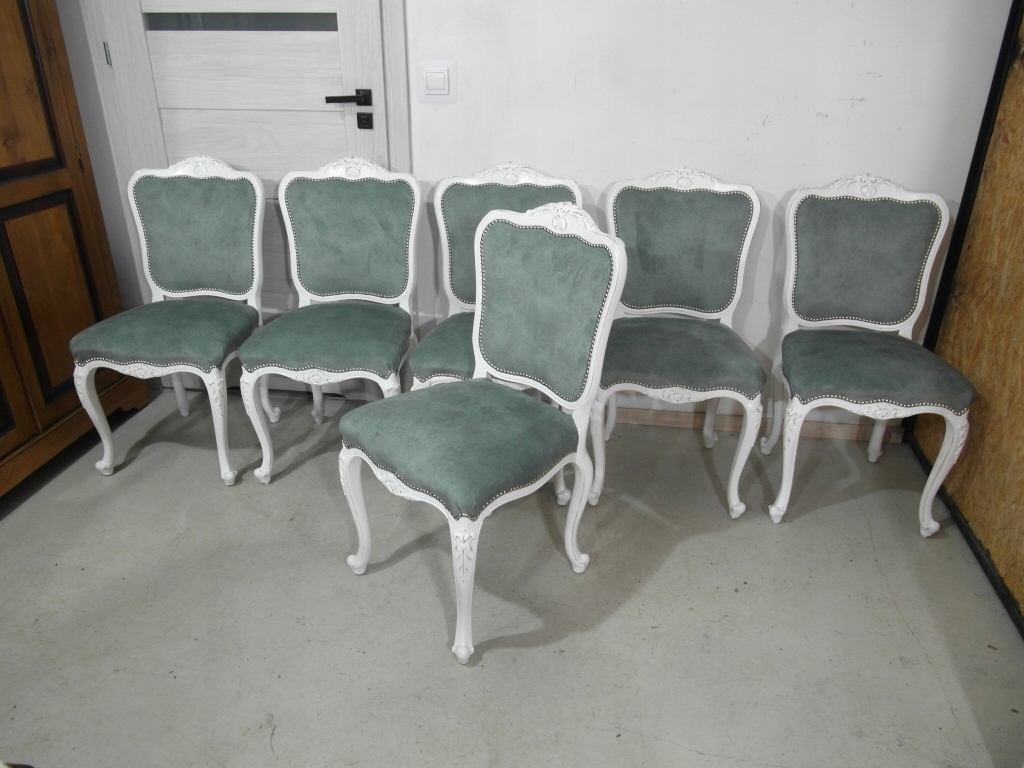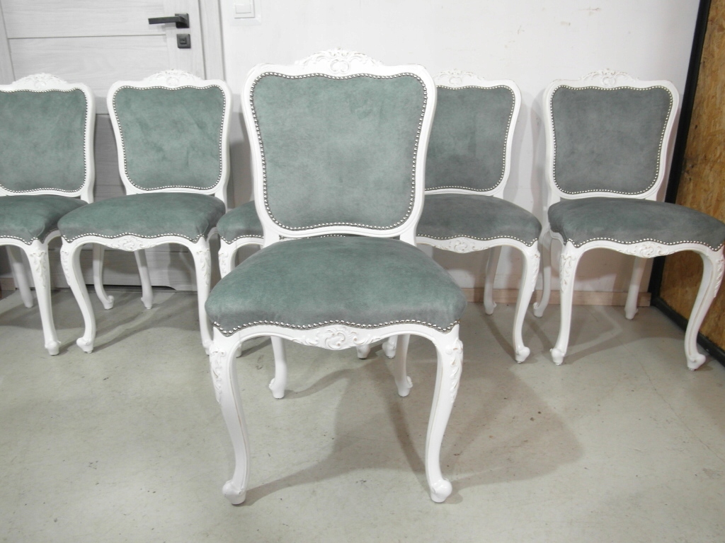 komplet 6 krzeseł , w super stanie krzesła po renowacji na nowo pomalowane na biało z przecierką , materiał obszyciowy nowy