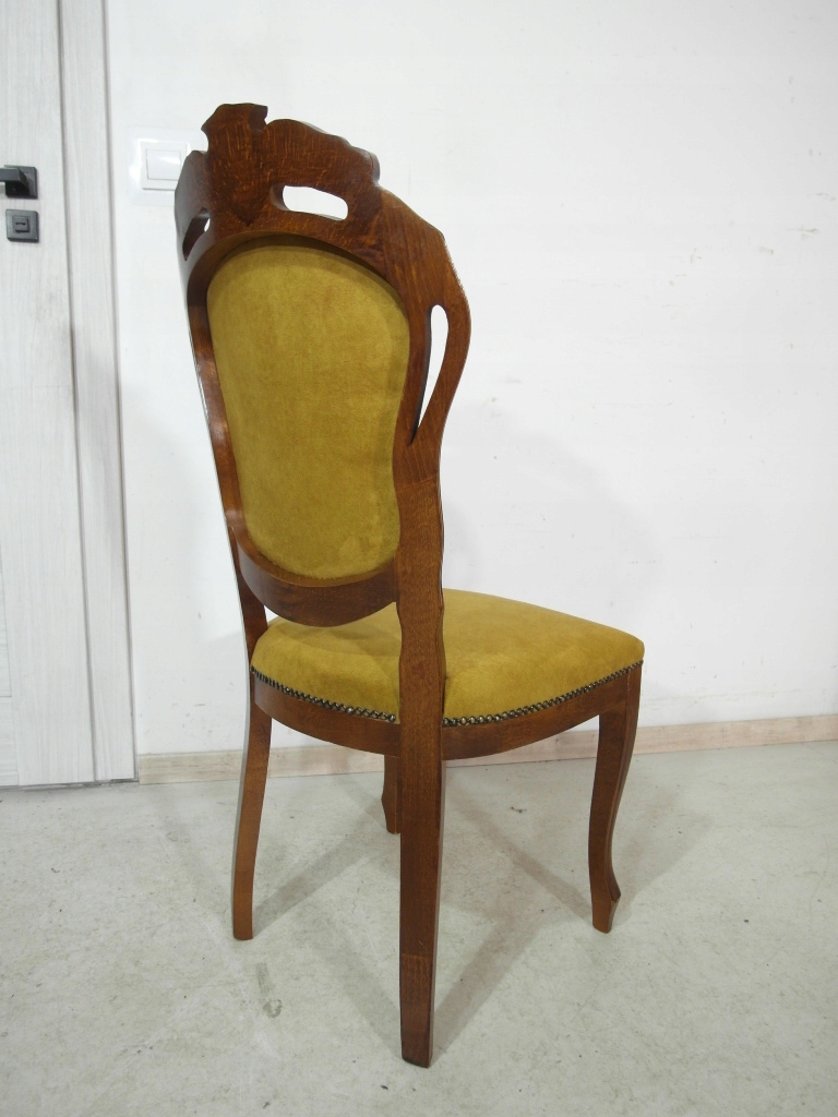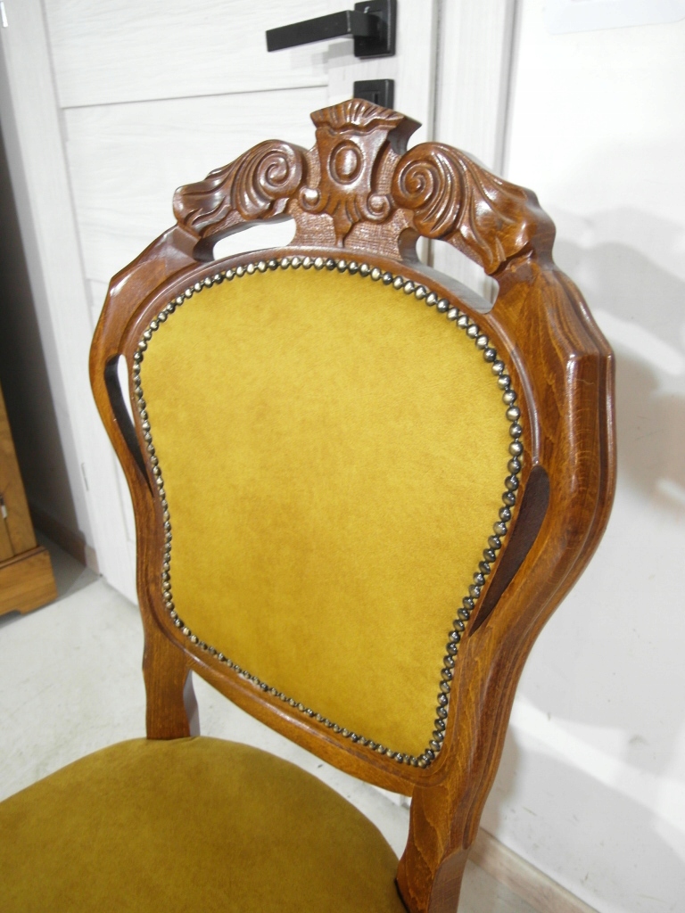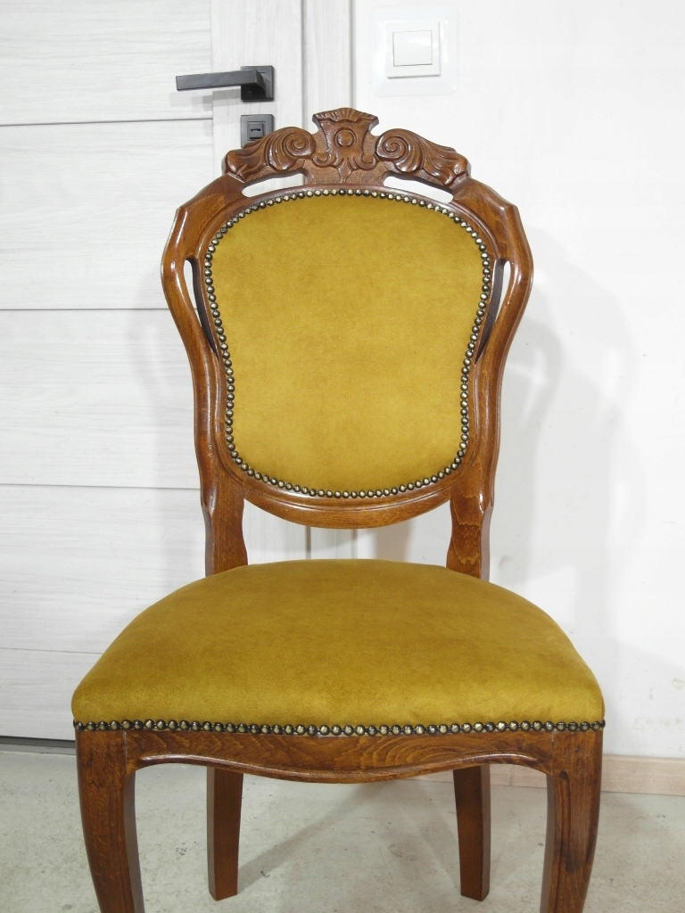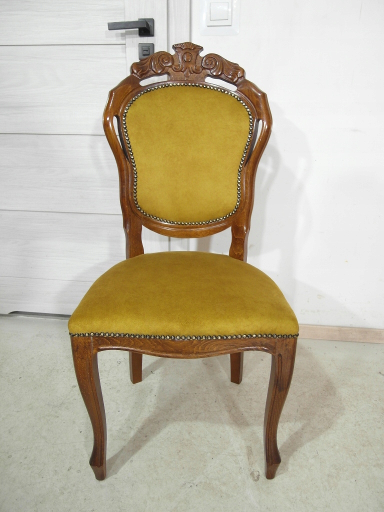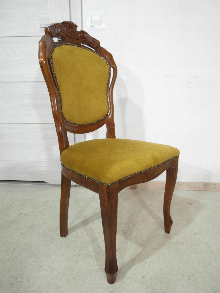 Opis: krzesło w idealnym stanie , siedzisko pokryte materiałem – materiał nowy, drewno po renowacji