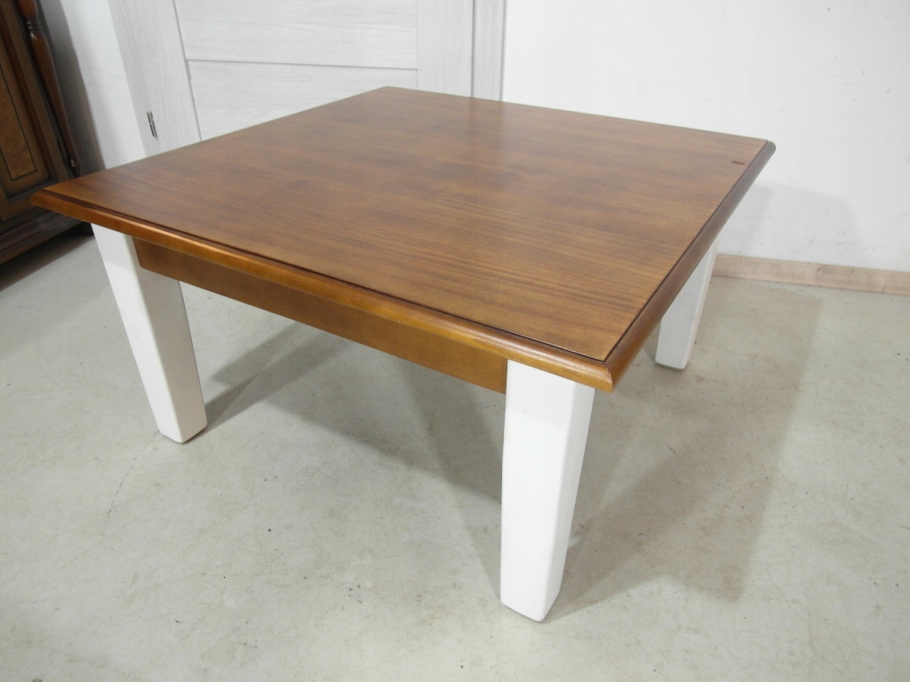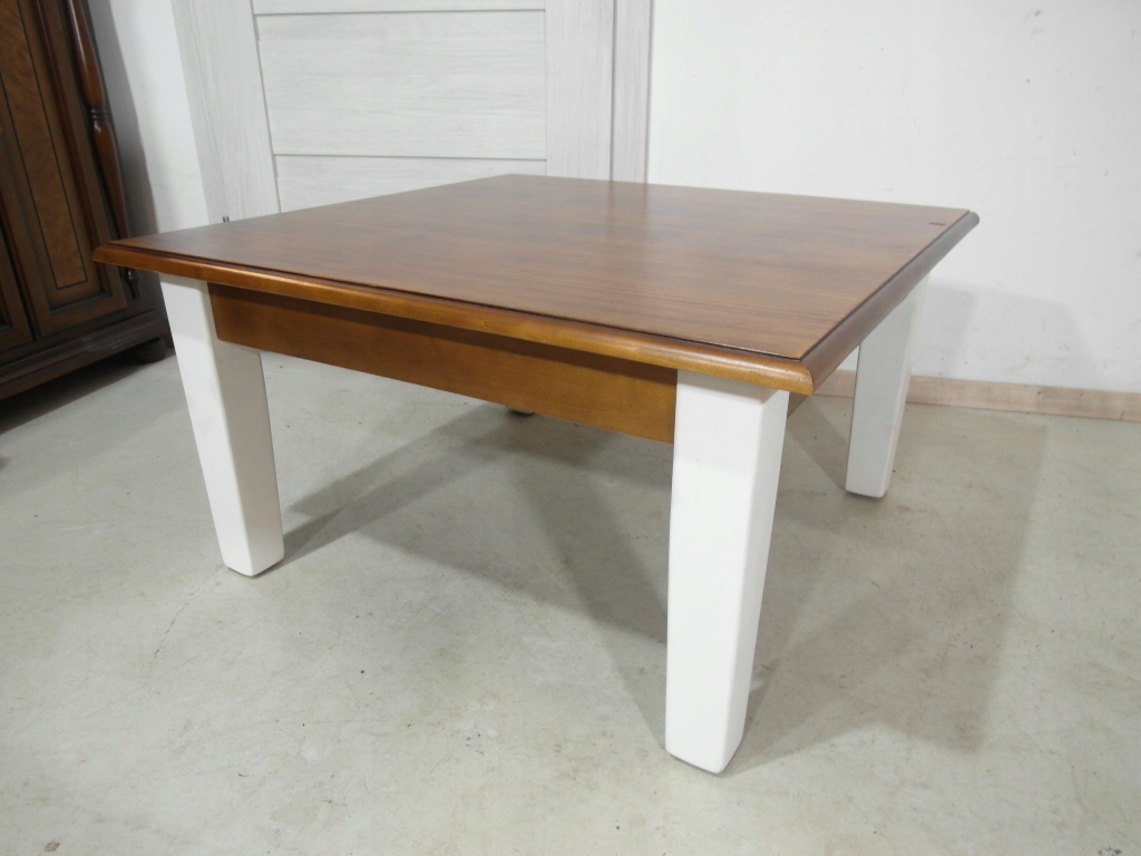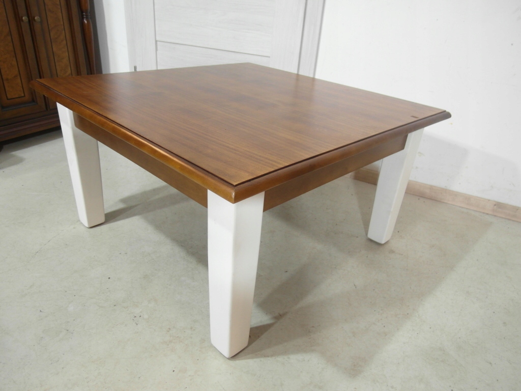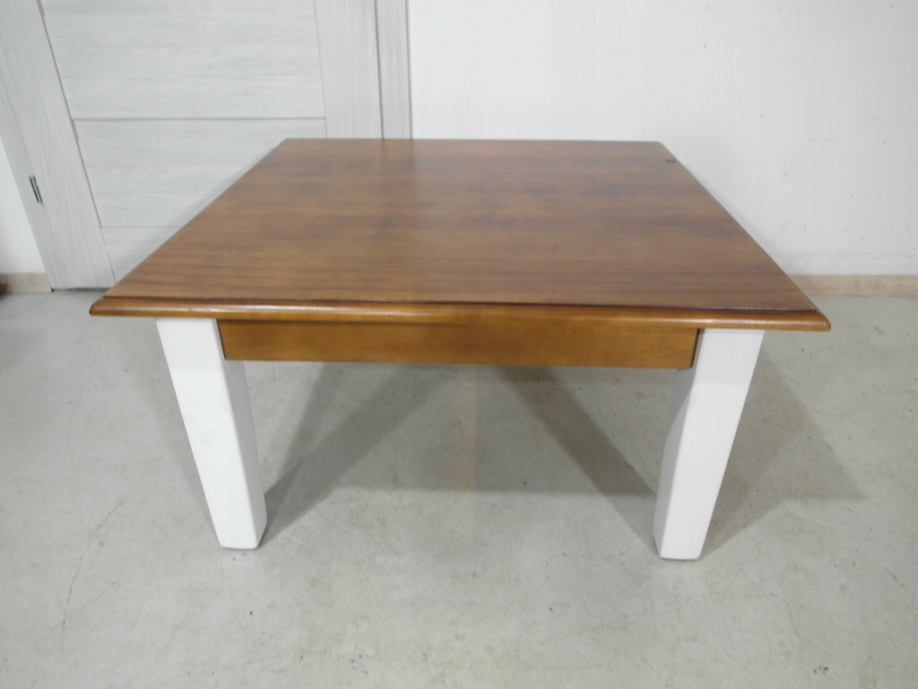 Opis: kwadratowa ława z przepięknym blatem , mocna i ciężka zarazem – z litego drewna