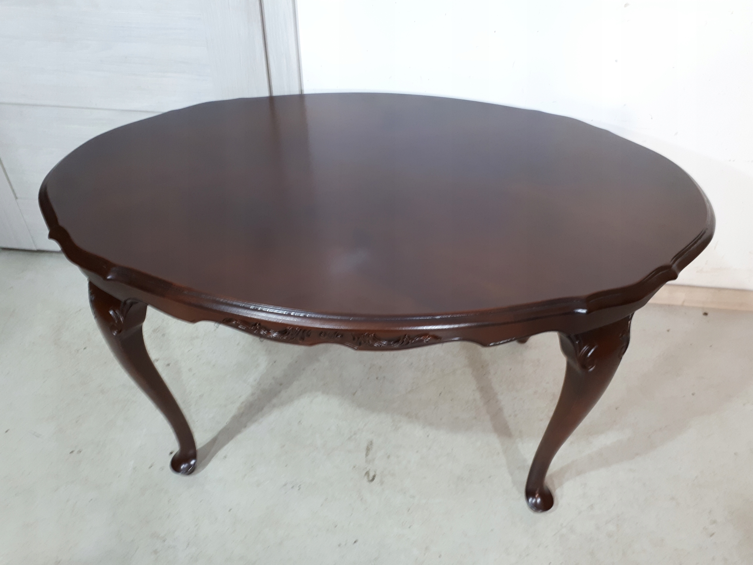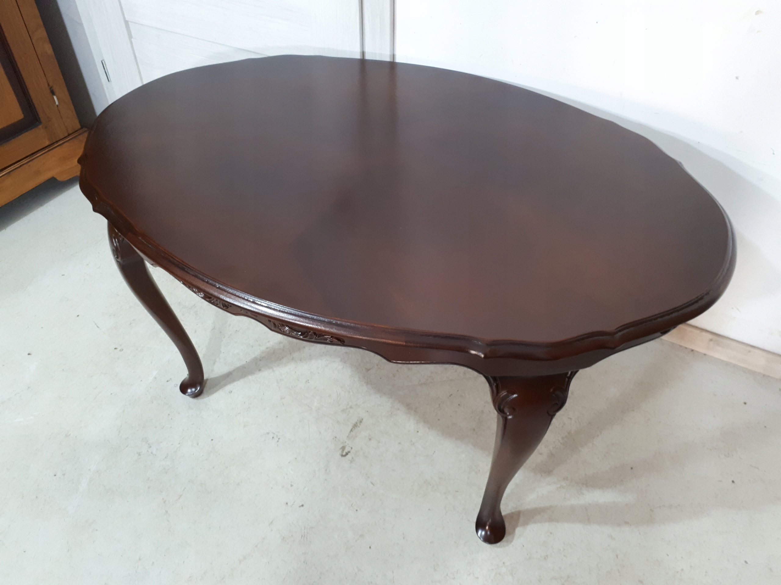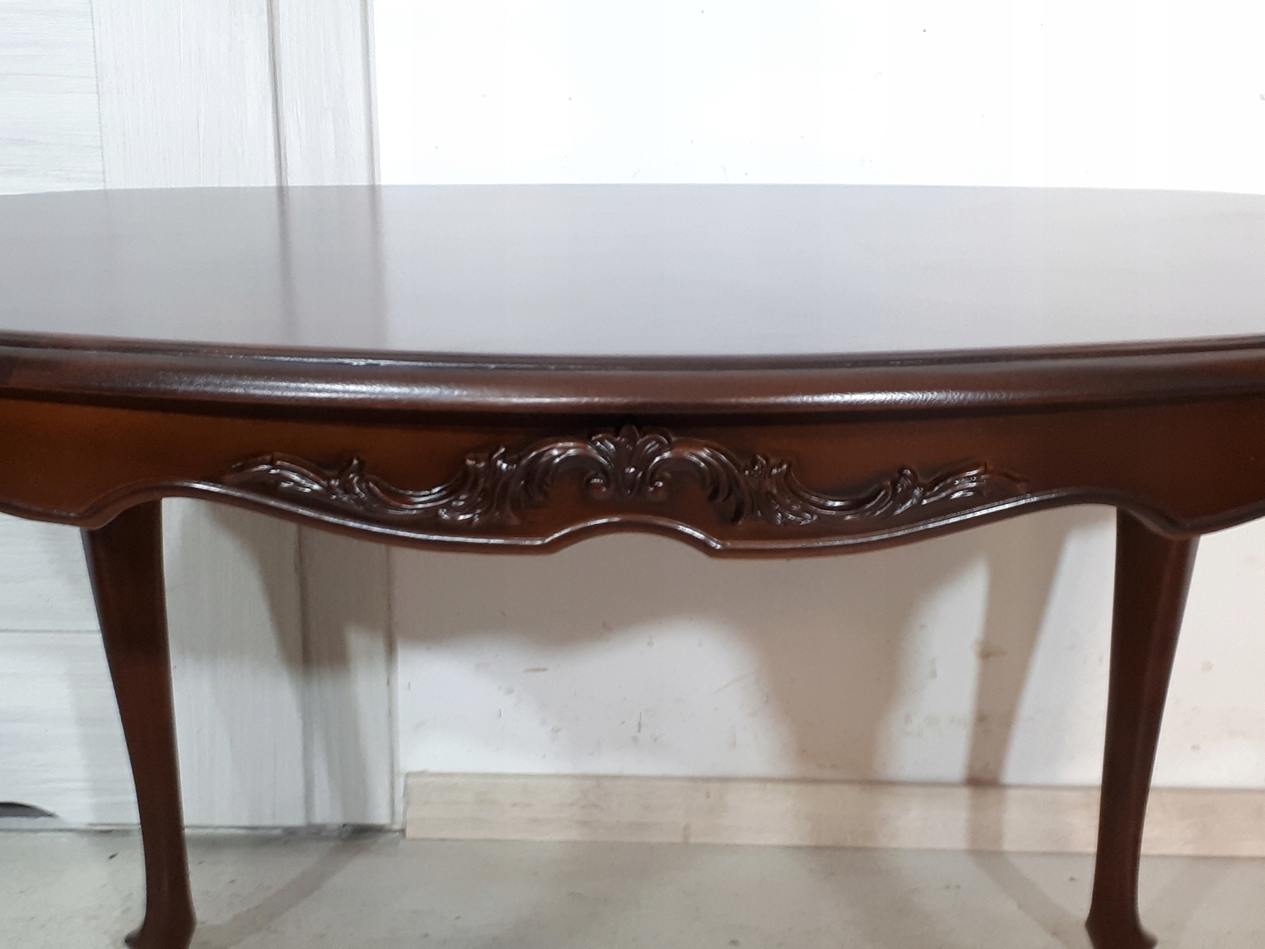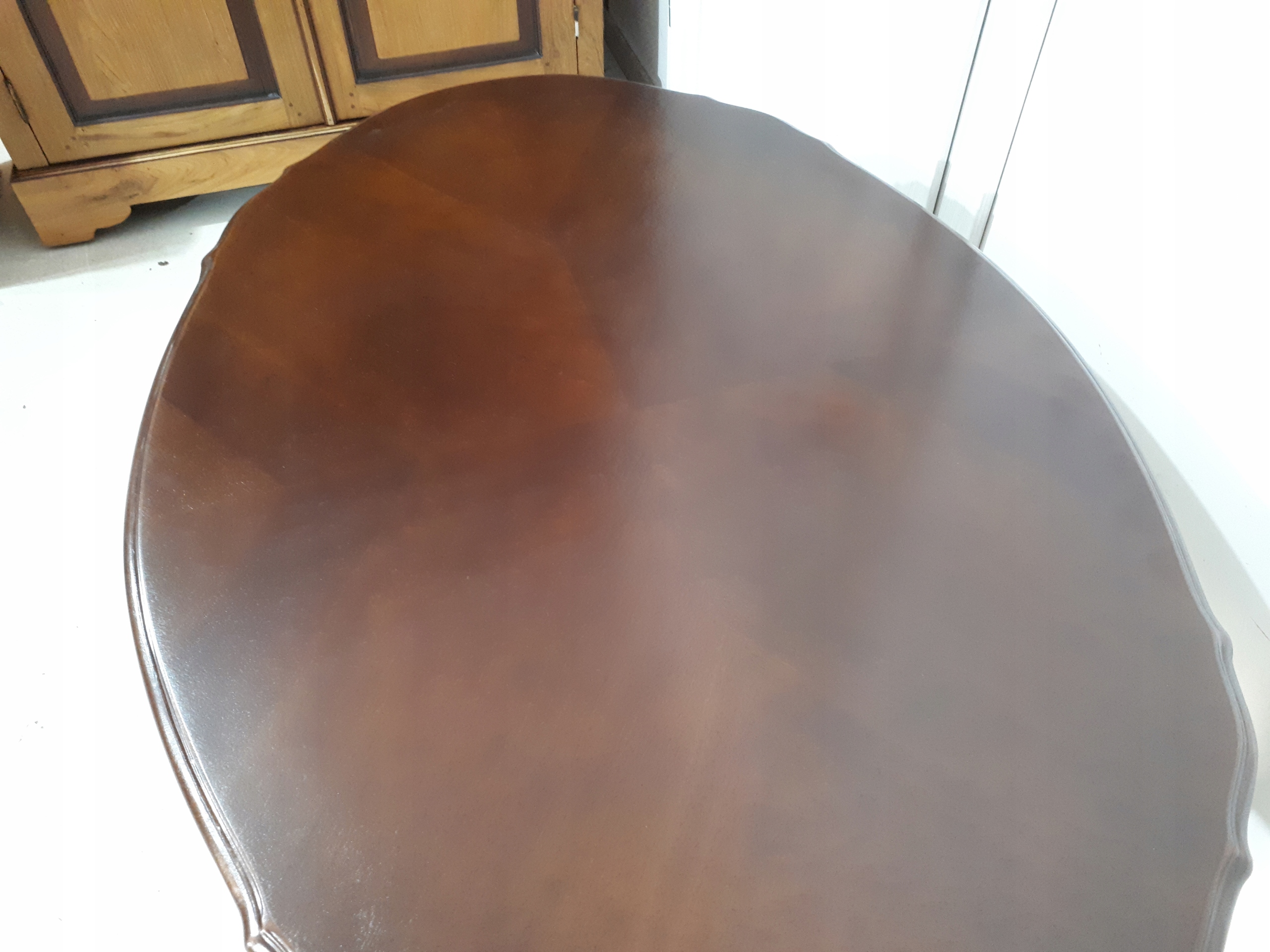 Opis: owalna ława z przepięknym blatem , mocna i ciężka zarazem – z drewna