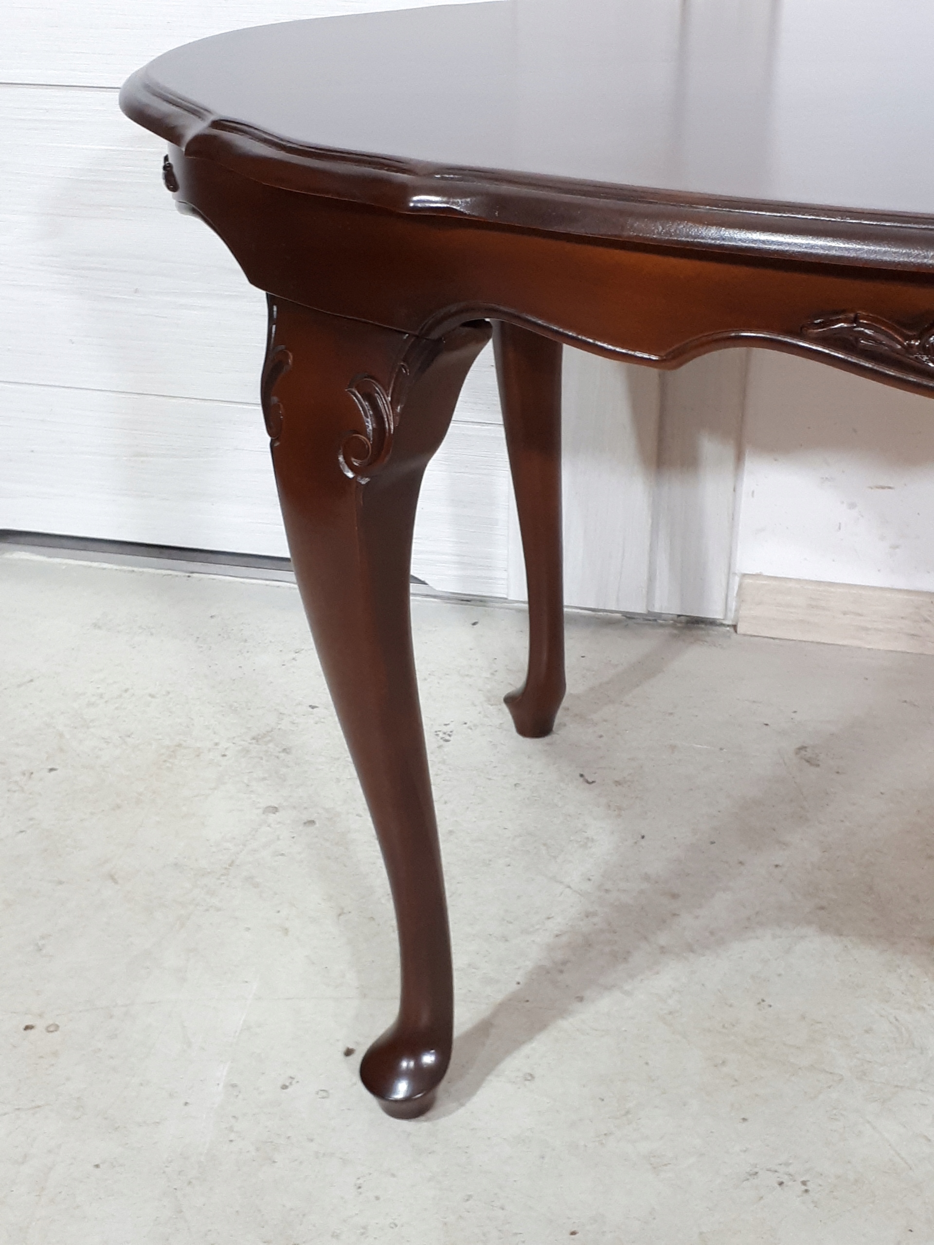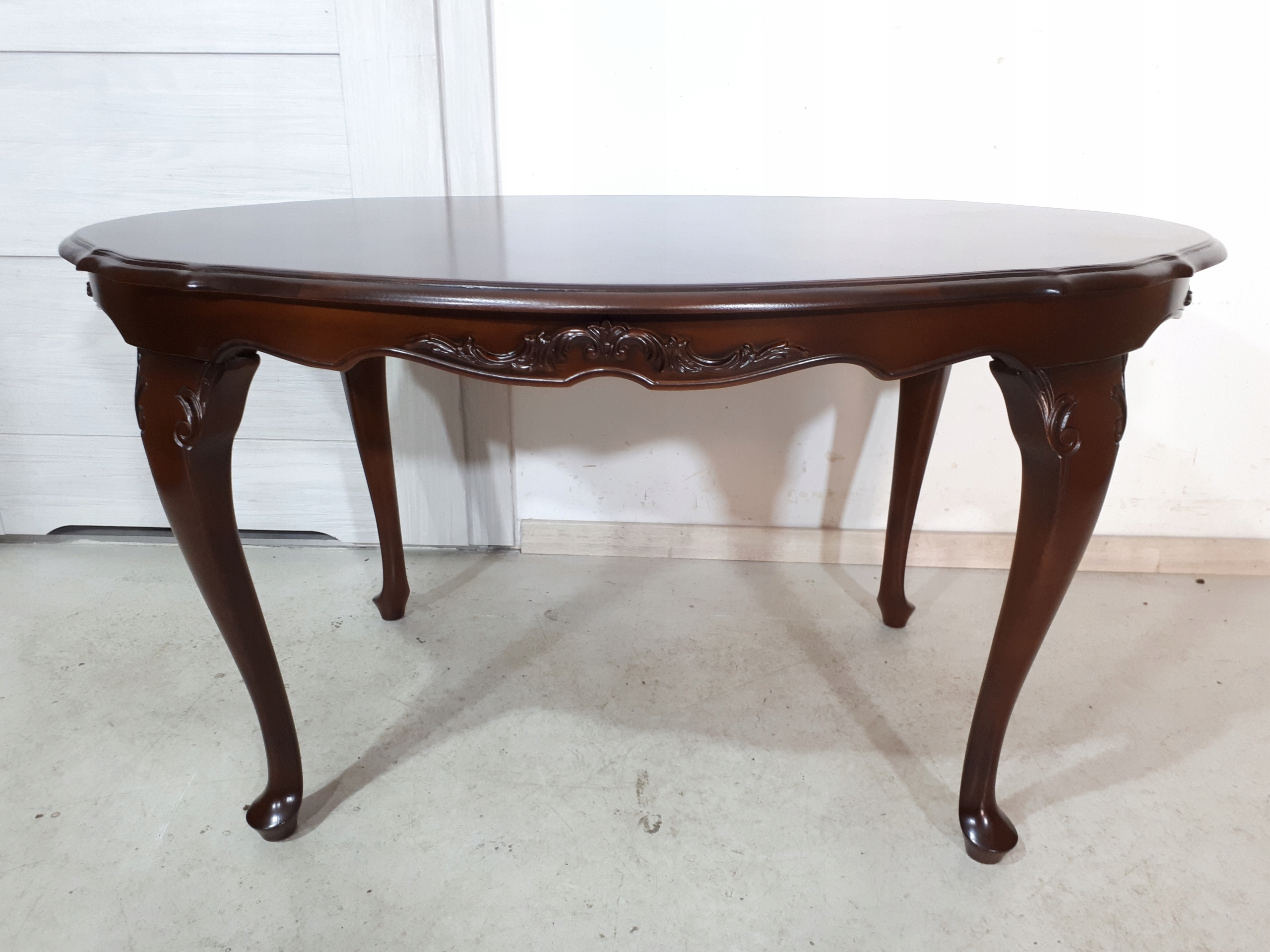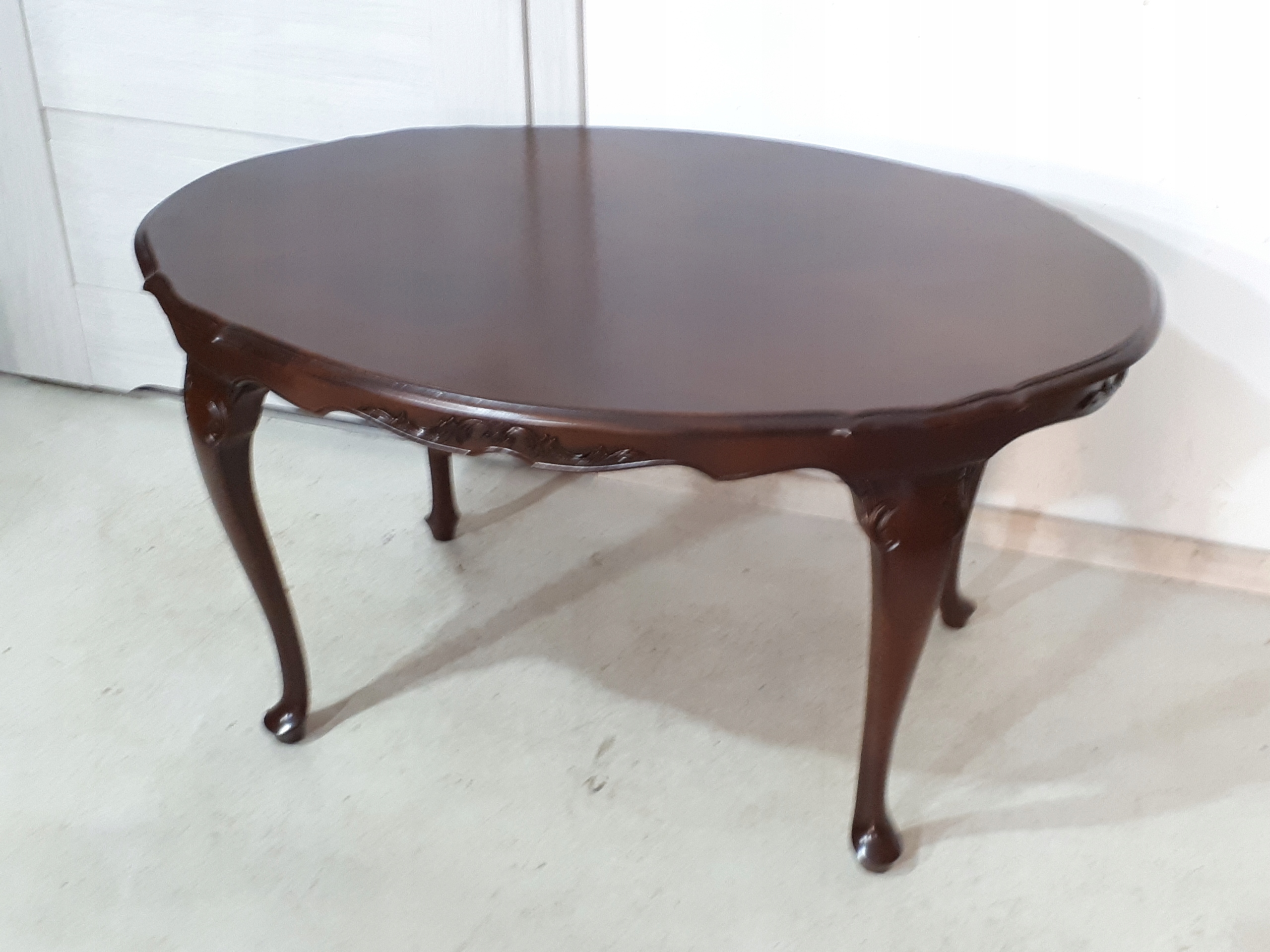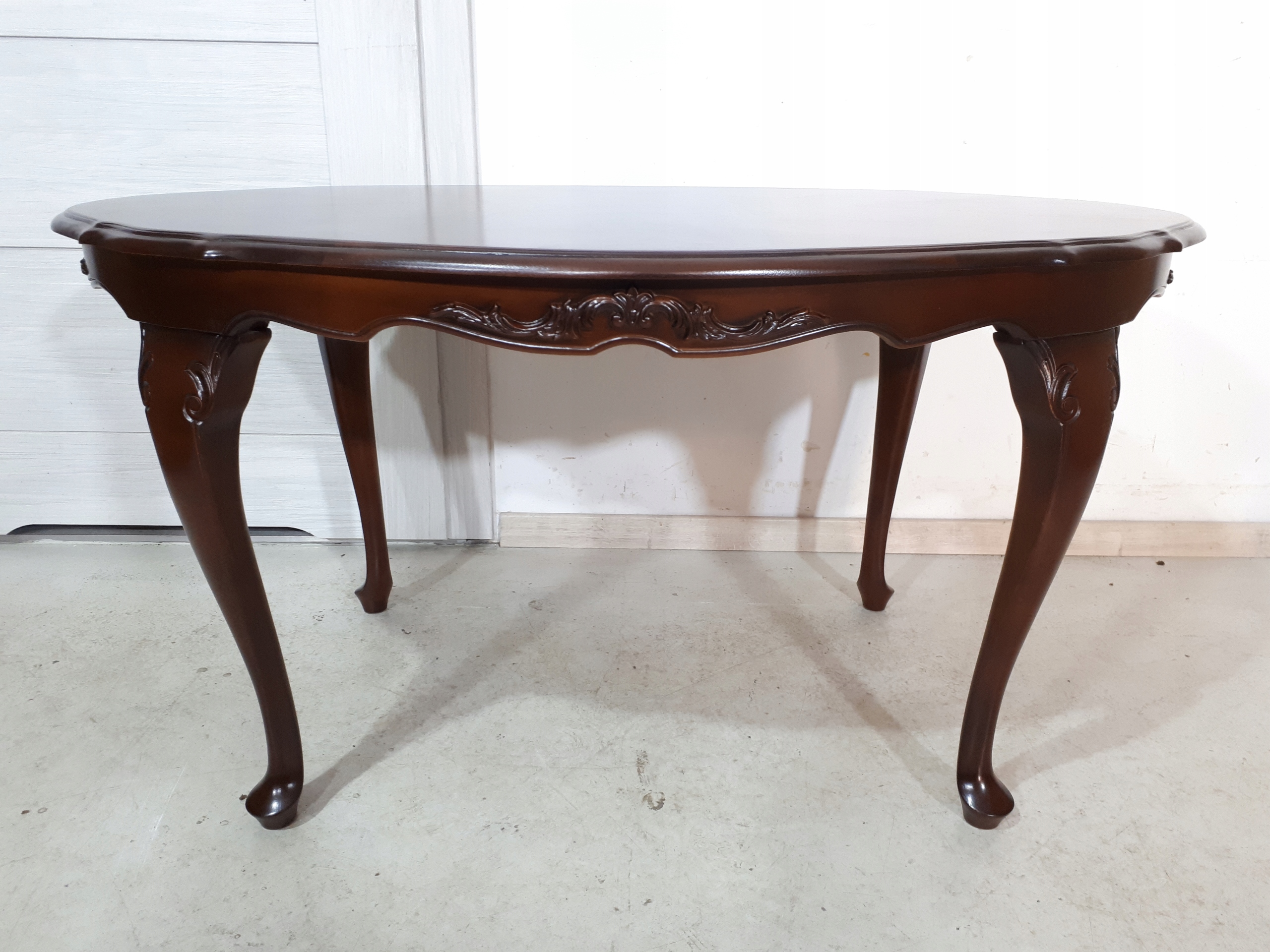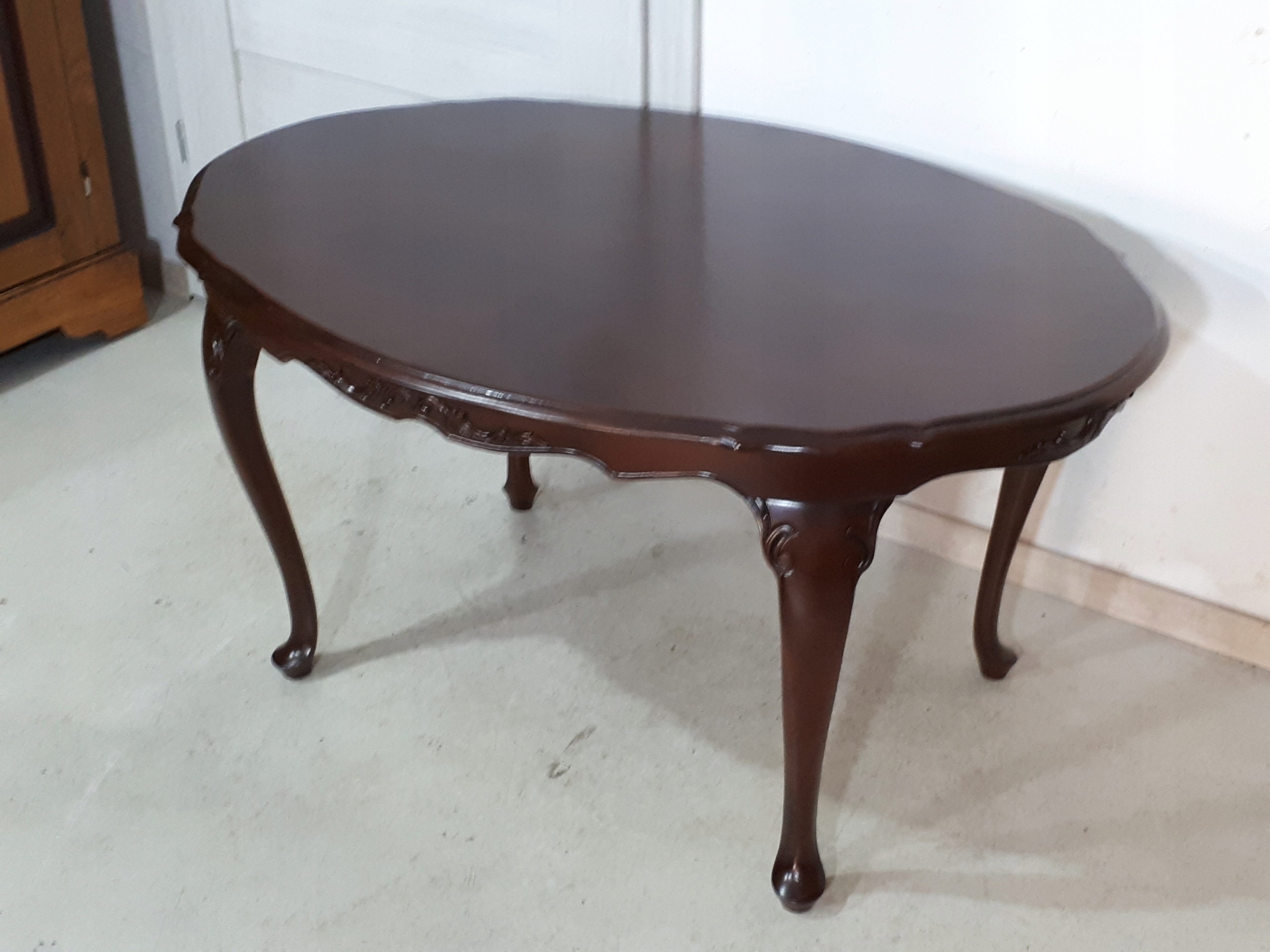 Opis: owalna ława z przepięknym blatem , mocna i ciężka zarazem – z drewna