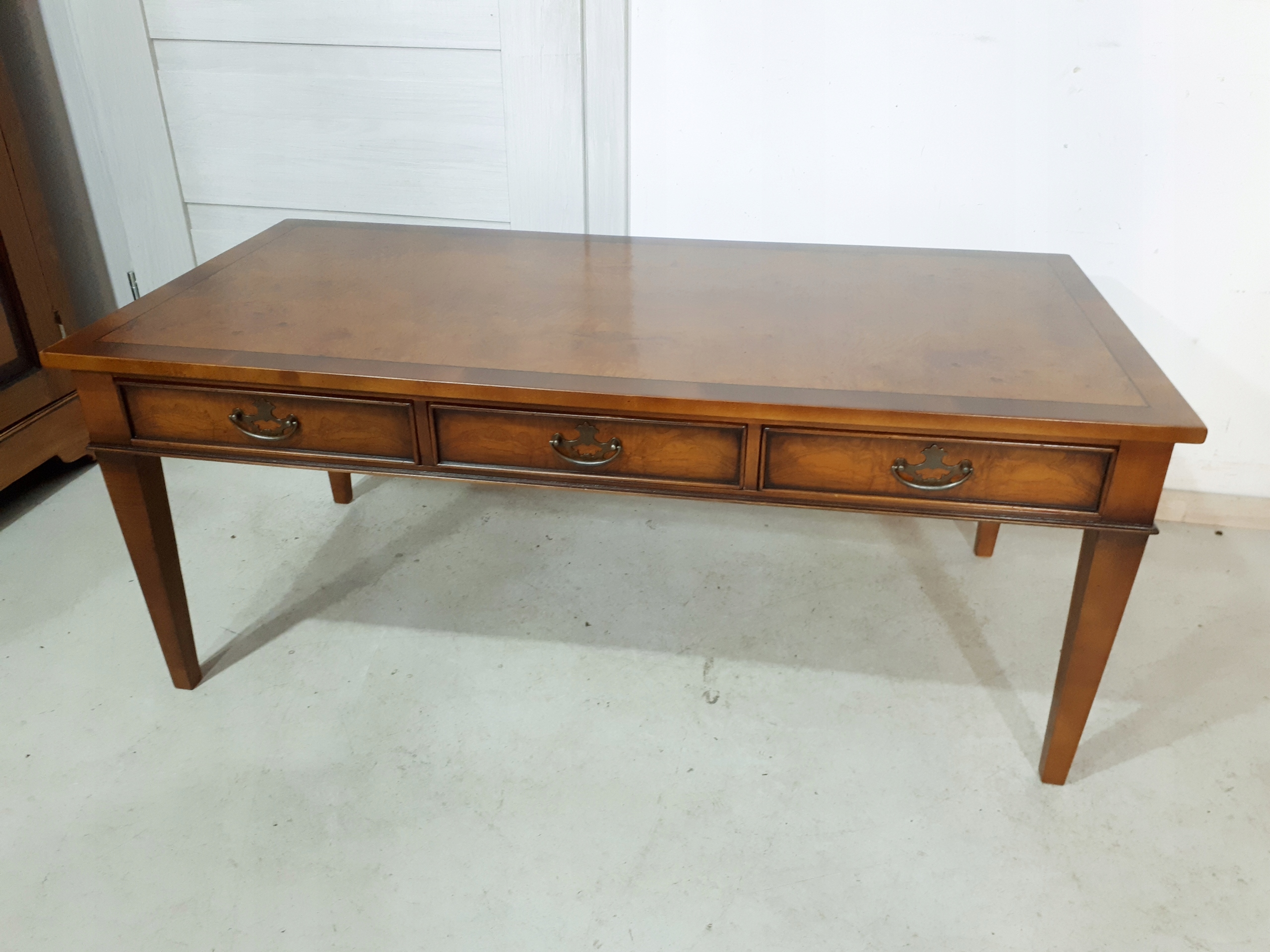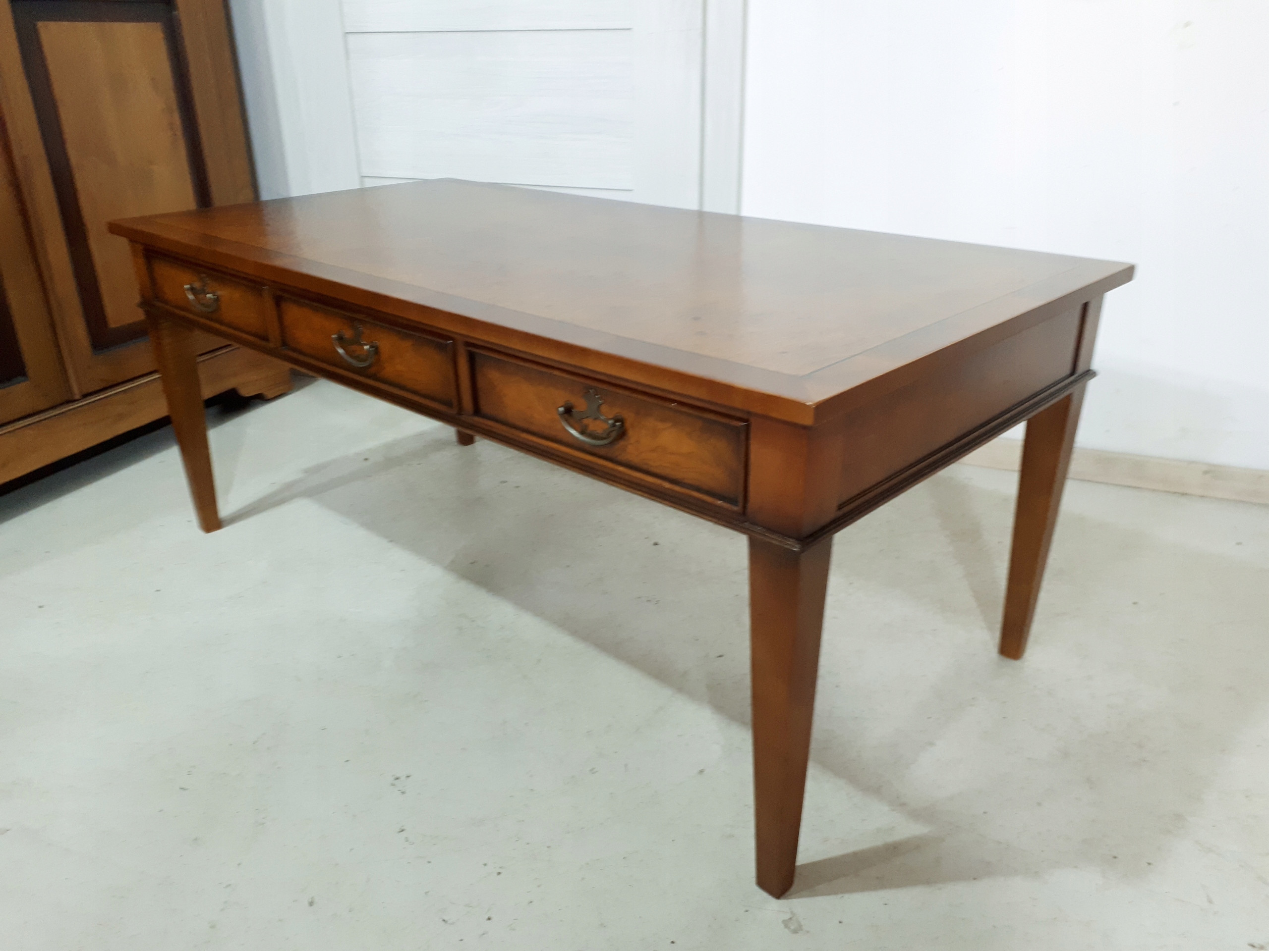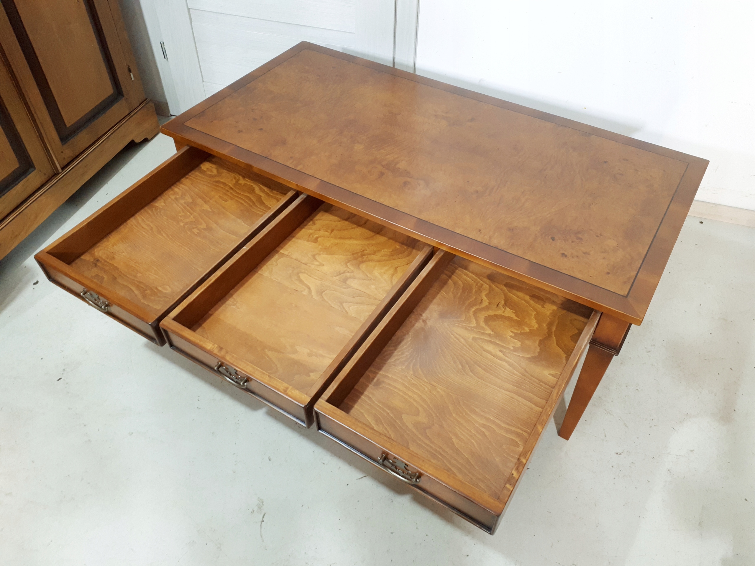 Opis: prostokątna  ława z przepięknym blatem  ,   mocna i ciężka zarazem – z drewna, pod blatem 3 bardzo pojemne szuflady