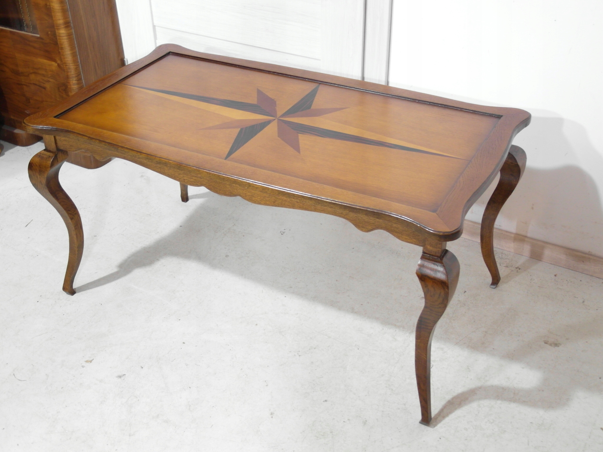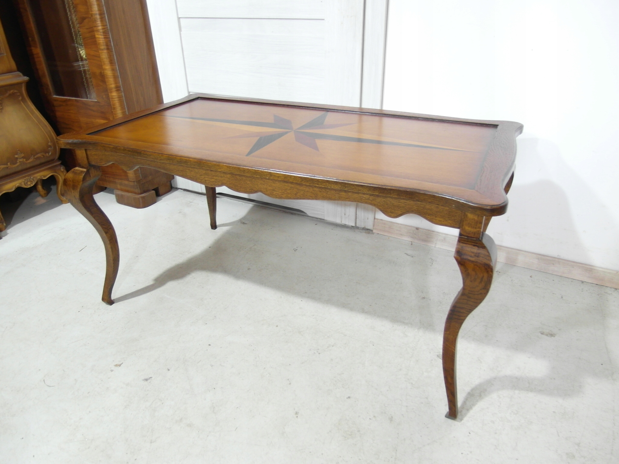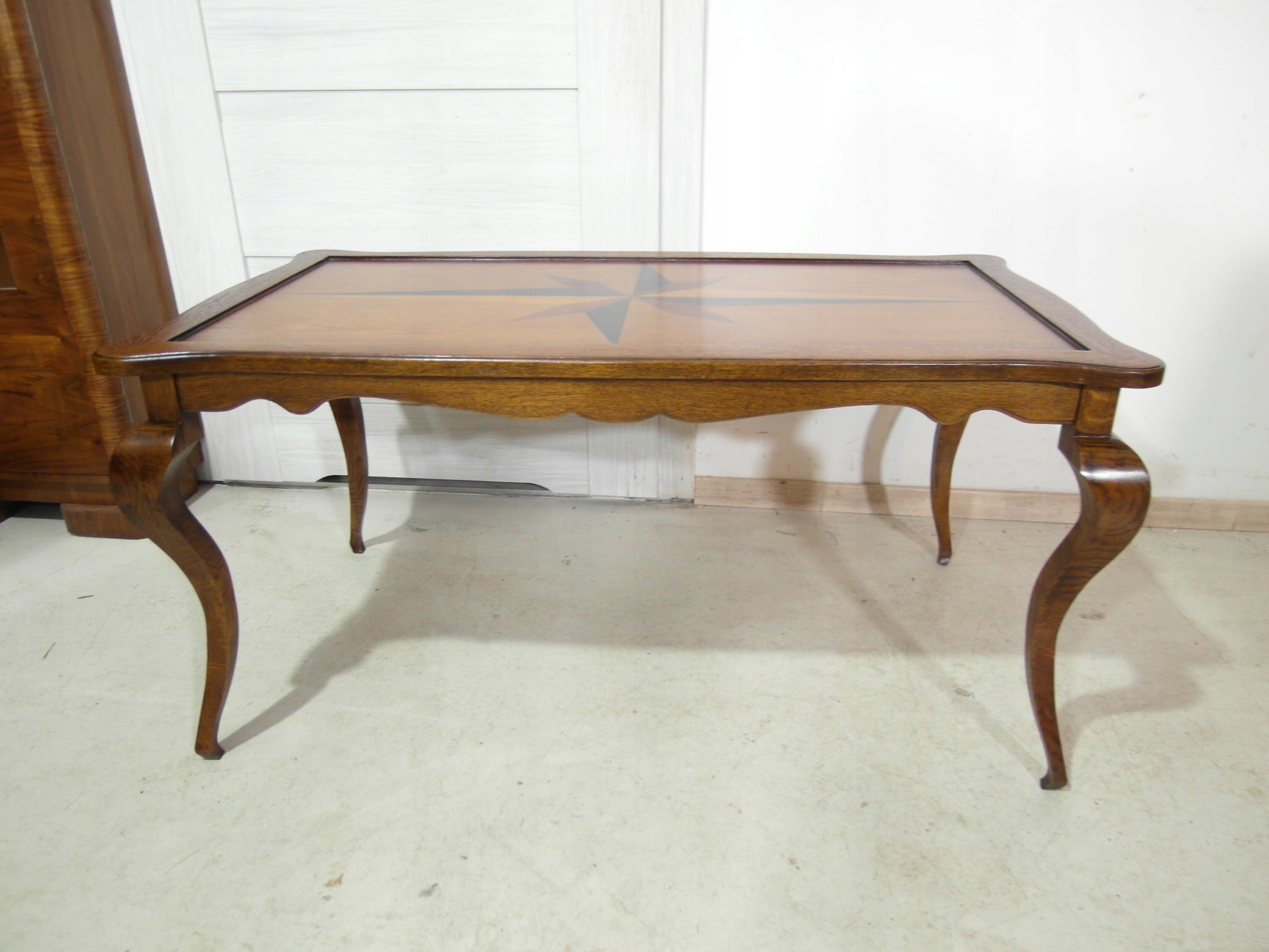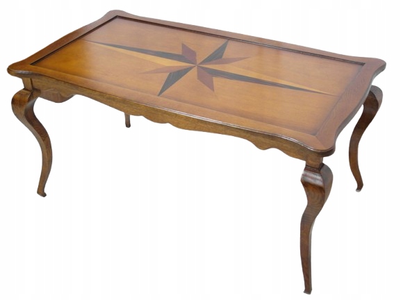 Opis: prostokątna ława z przepięknym blatem zdobionym wzorem symetrycznym intarsiowanym , mocna i ciężka zarazem – z drewna