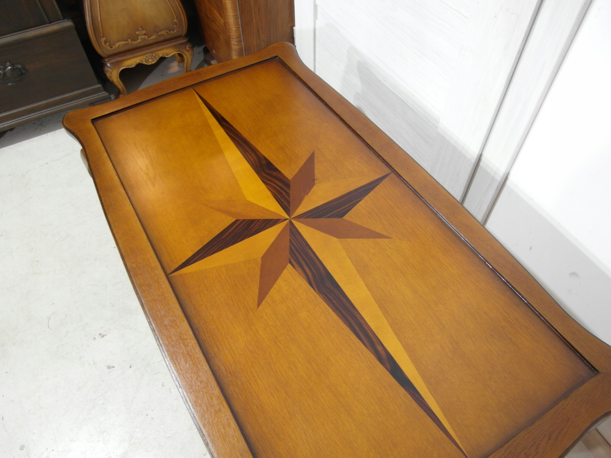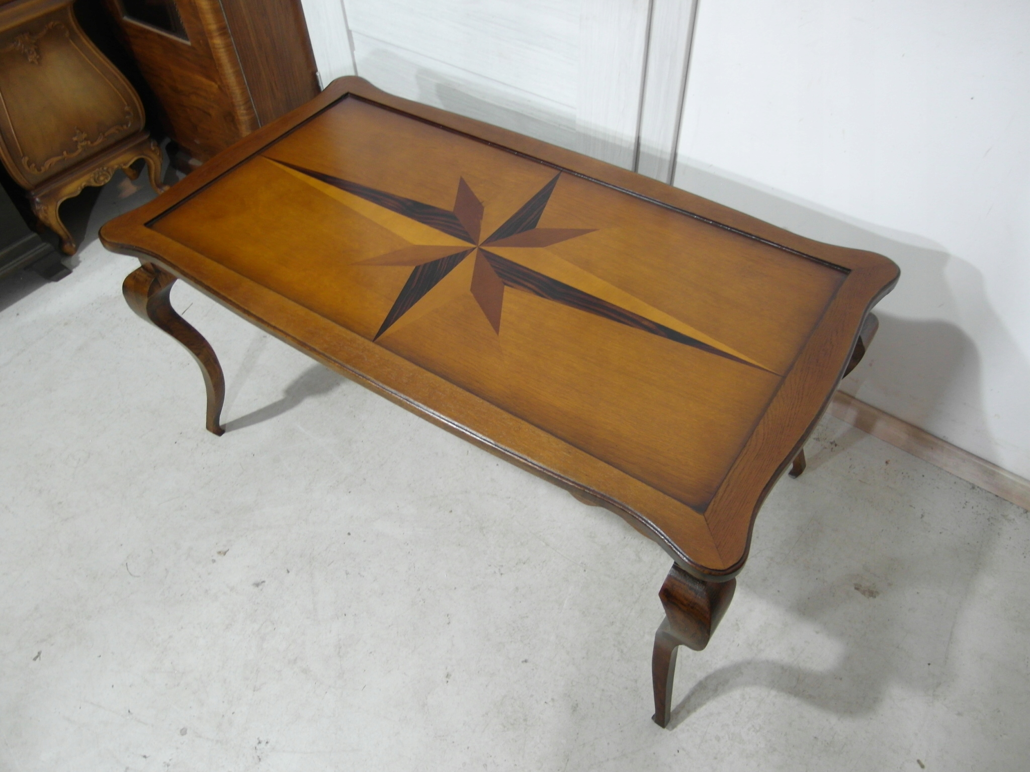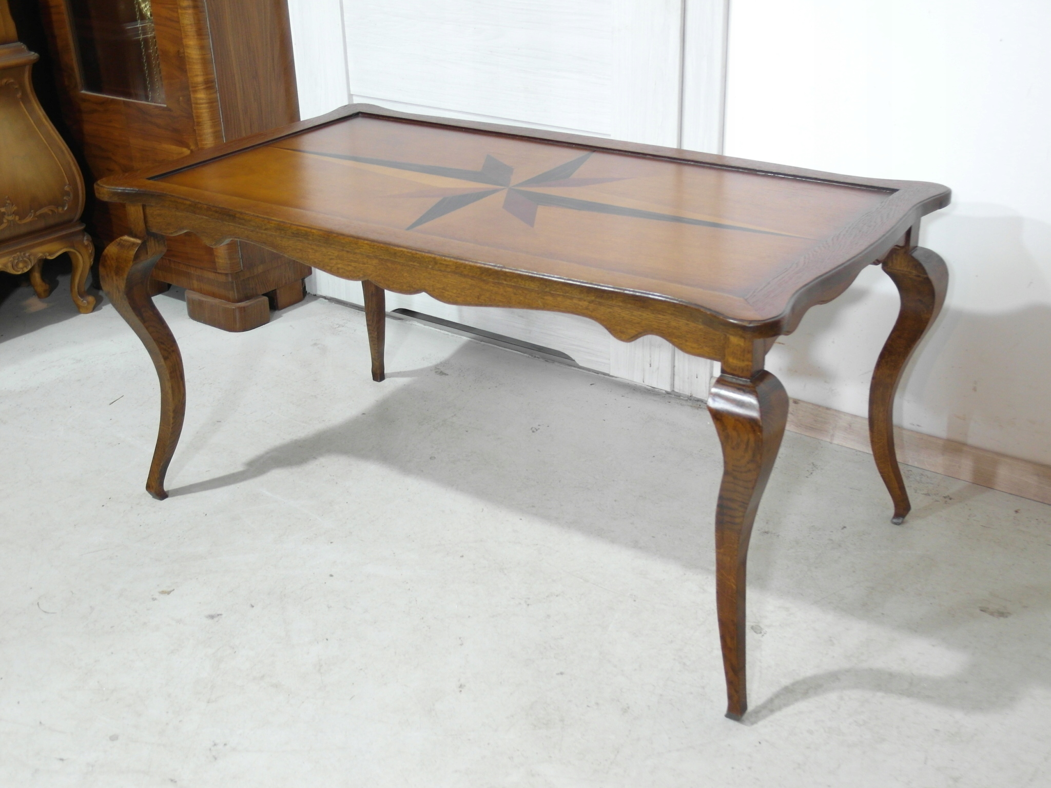 Opis: prostokątna ława z przepięknym blatem zdobionym wzorem symetrycznym intarsiowanym , mocna i ciężka zarazem – z drewna