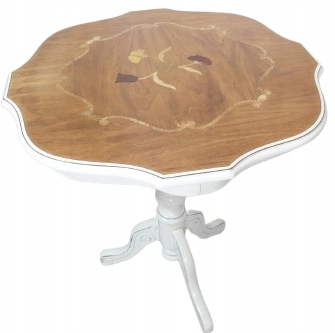 Opis: okrągły stolik kawowy, drewniany , stabilny idealny do fotela, zdobiony intarsjami na blacie