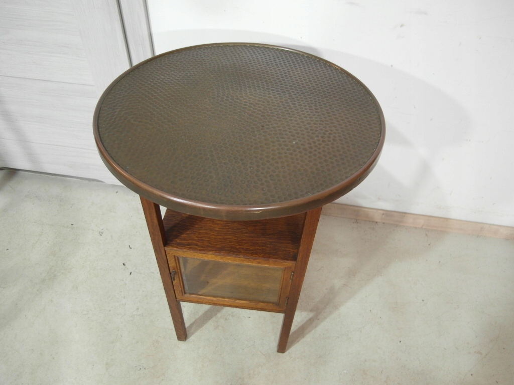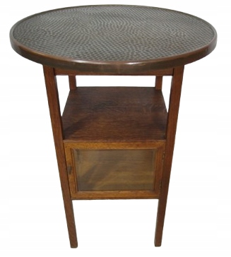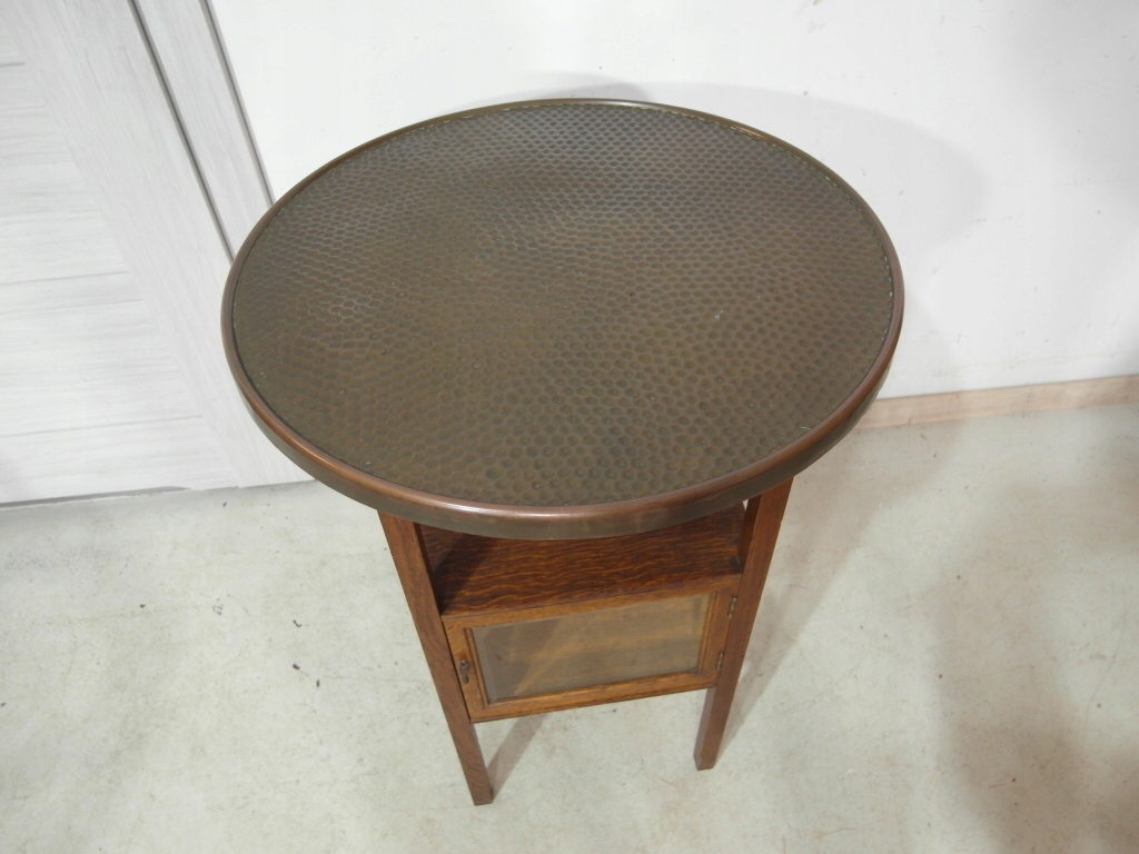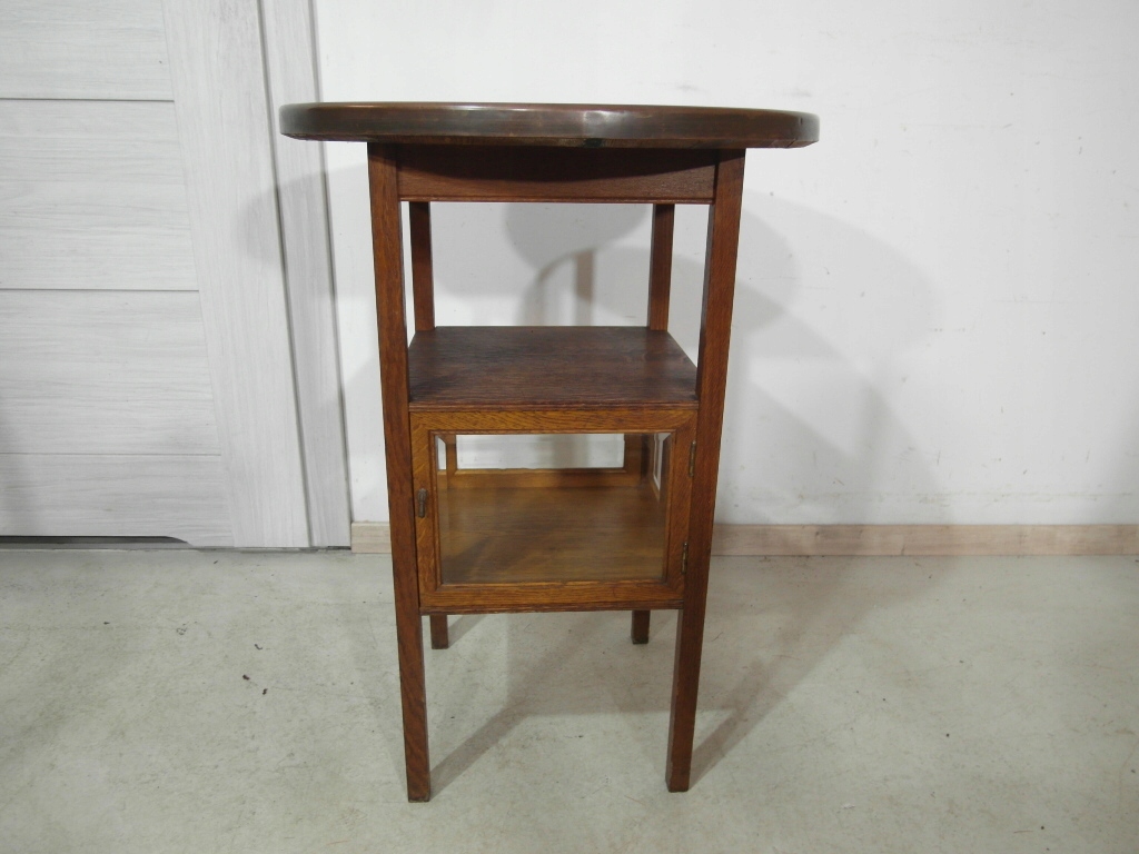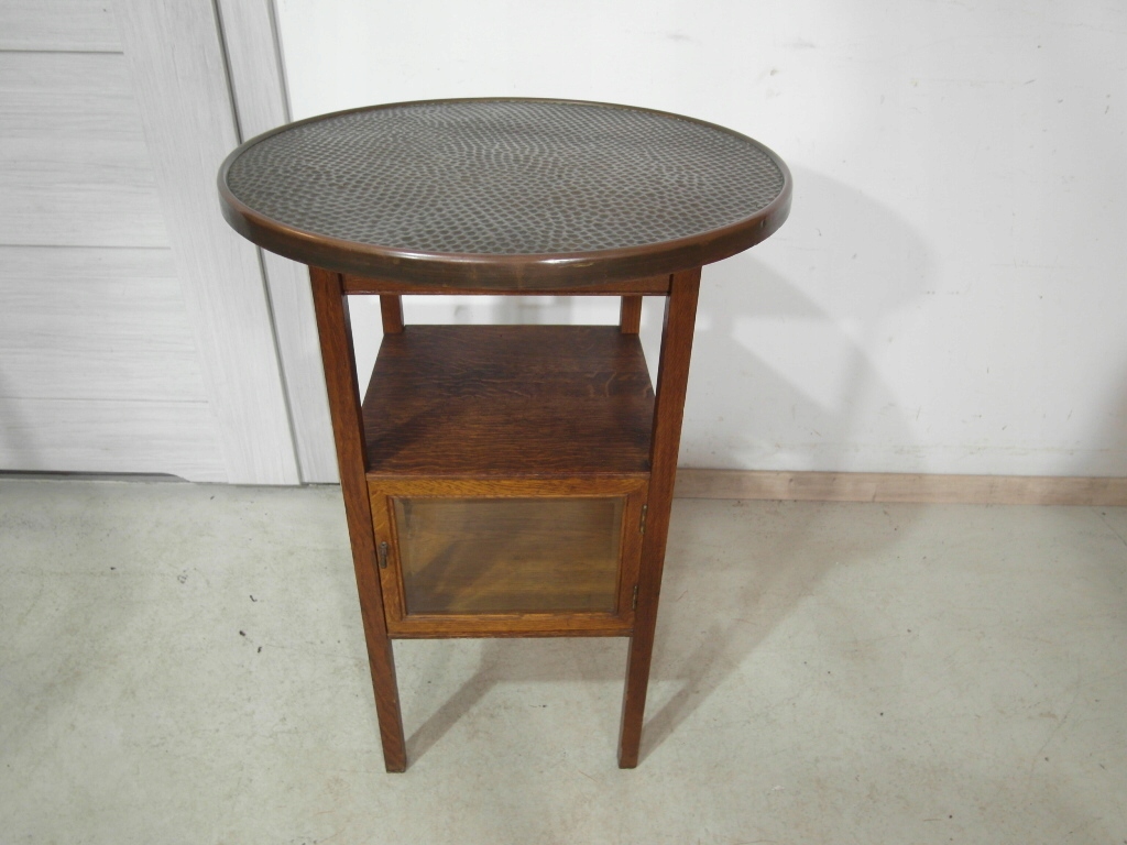 Opis: stolik okrągły ,na smukłych zgrabnych nóżkach , bardzo ładny i proporcjonalny kształt, posiada przeszkloną dolna cześć zamykana drzwiczkami , blat wykończony  blachą