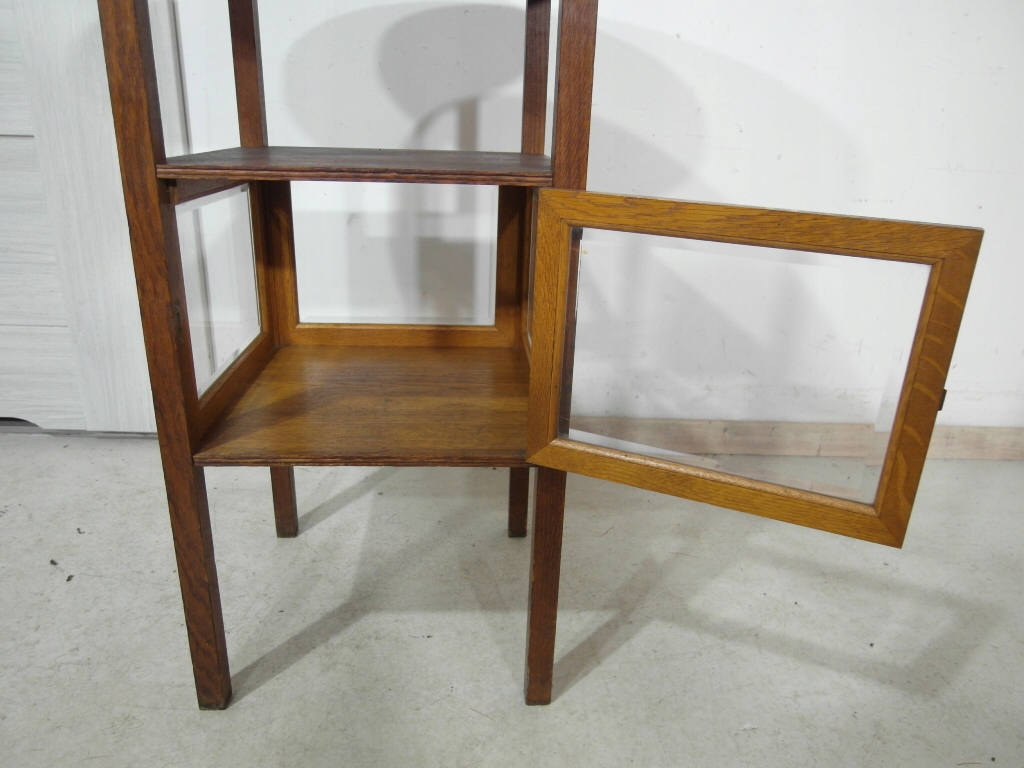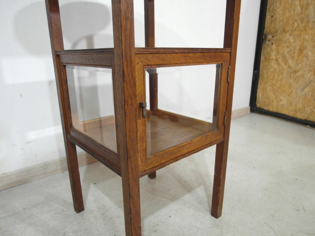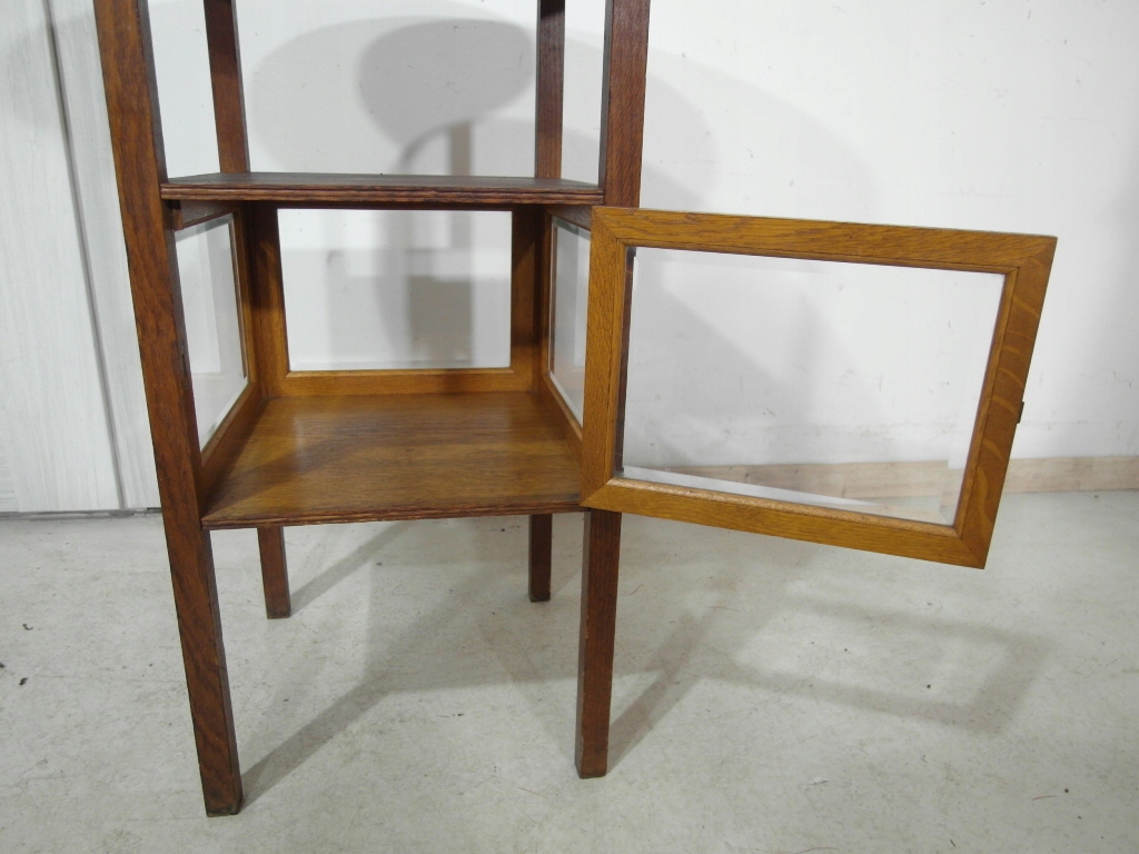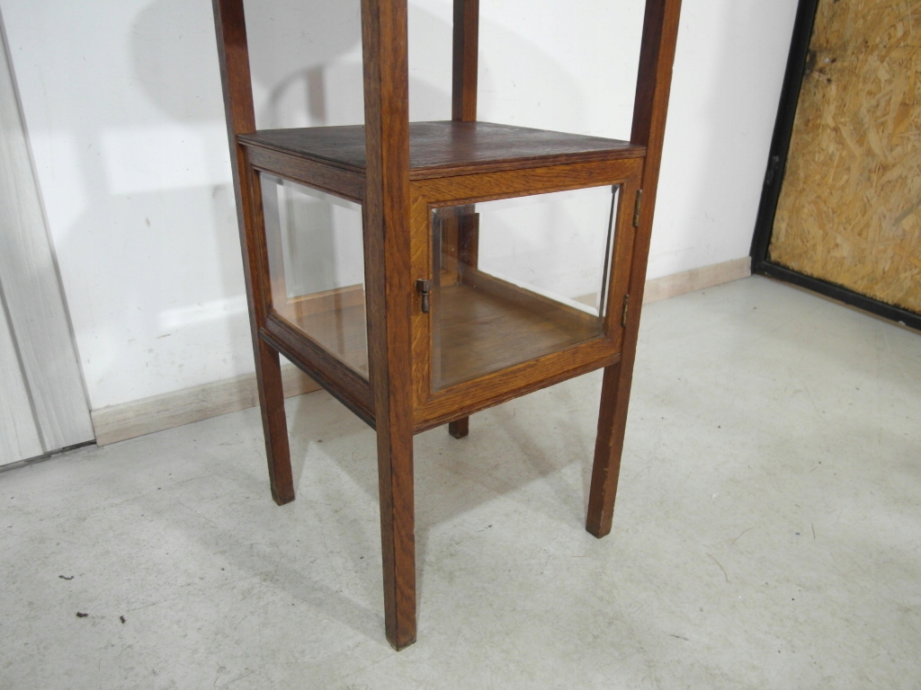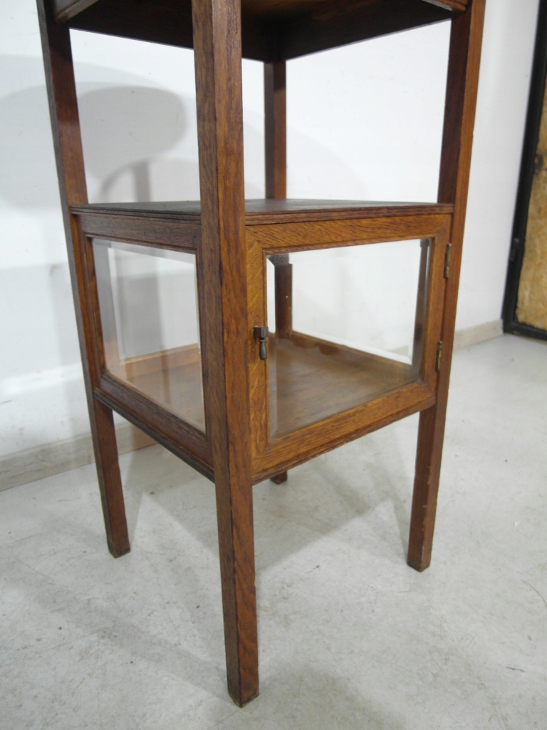 Opis: stolik okrągły ,na smukłych zgrabnych nóżkach , bardzo ładny i proporcjonalny kształt, posiada przeszkloną dolna cześć zamykana drzwiczkami , blat wykończony  blachą