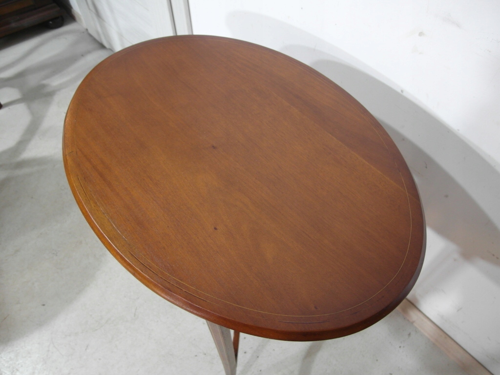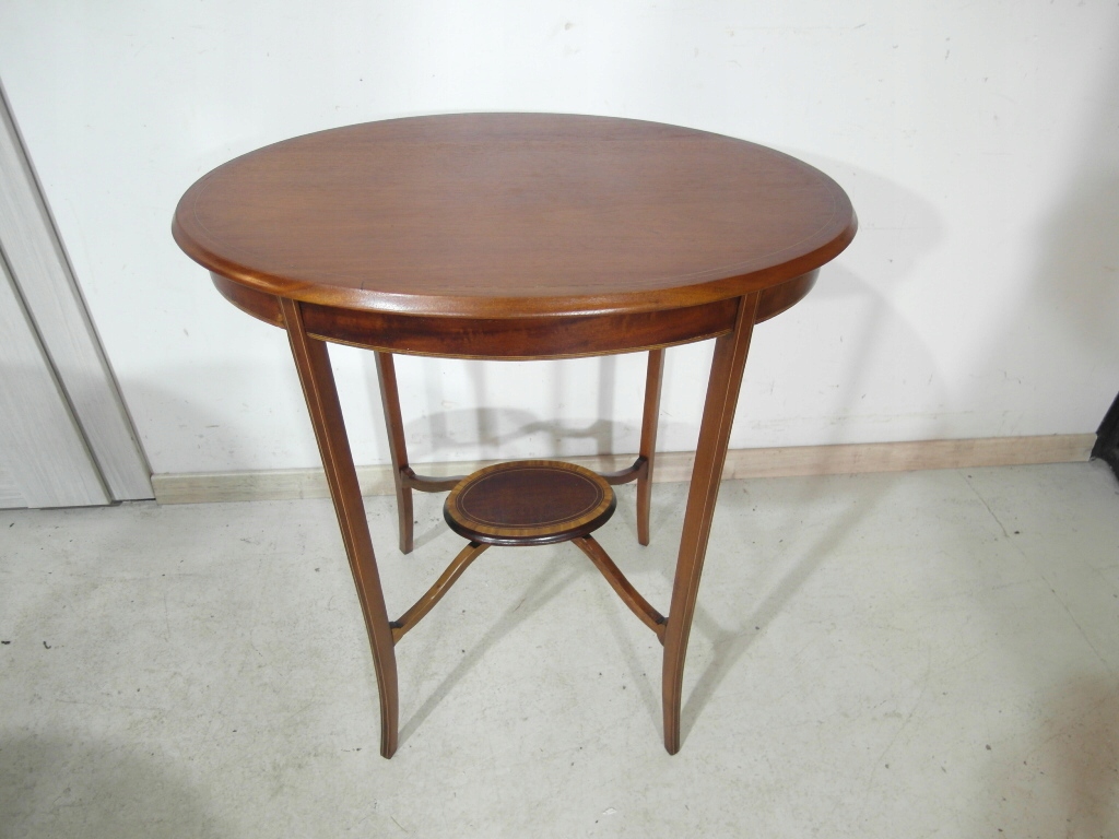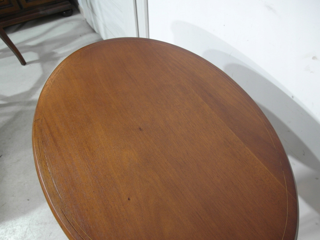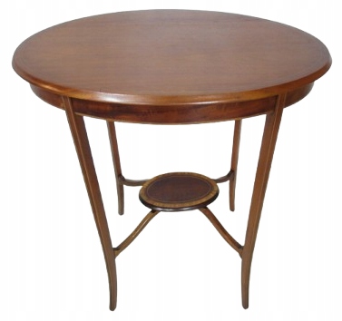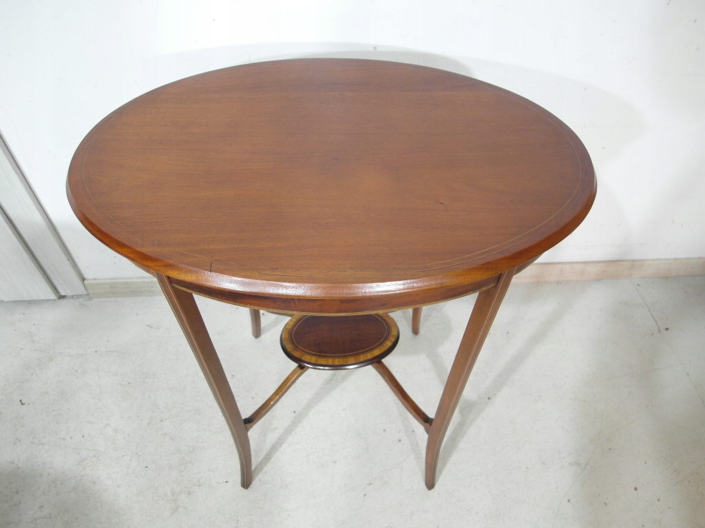 Opis: owalny stolik kawowy, drewniany, z podwójnym blacikiem , delikatnie zdobiony fornirem , smukłe nóżki