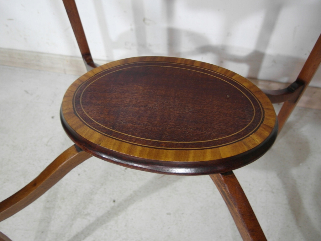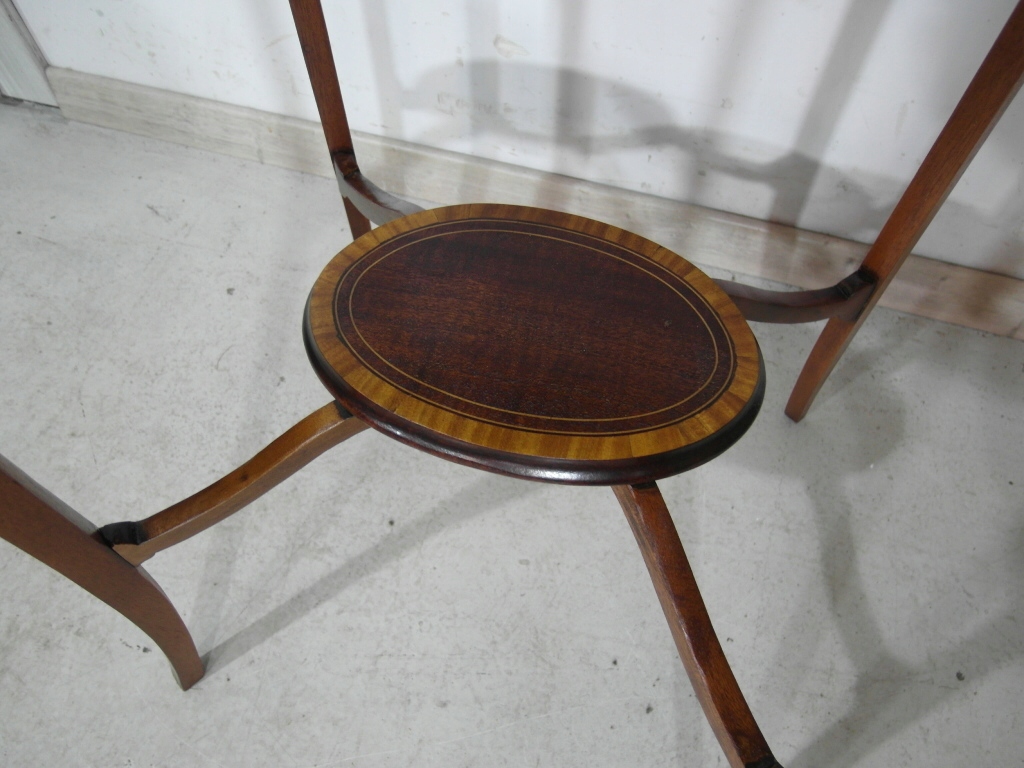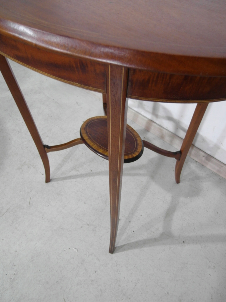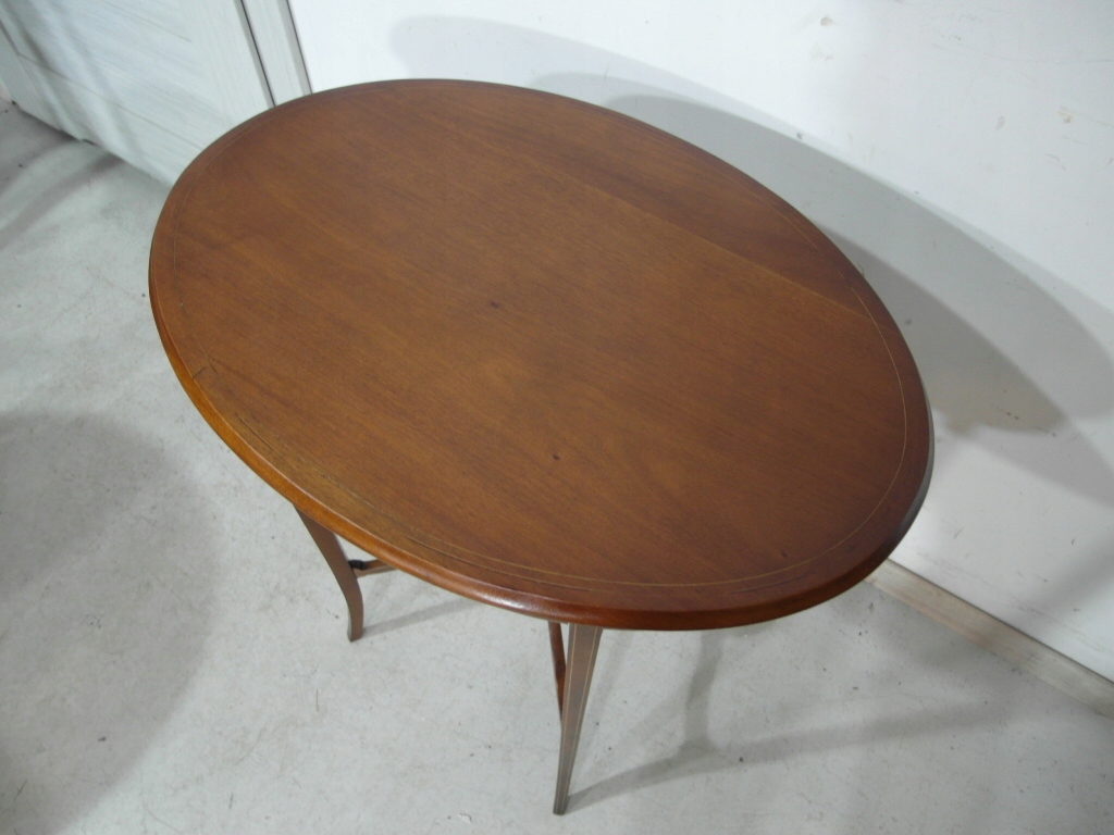 Opis: owalny stolik kawowy, drewniany, z podwójnym blacikiem , delikatnie zdobiony fornirem , smukłe nóżki