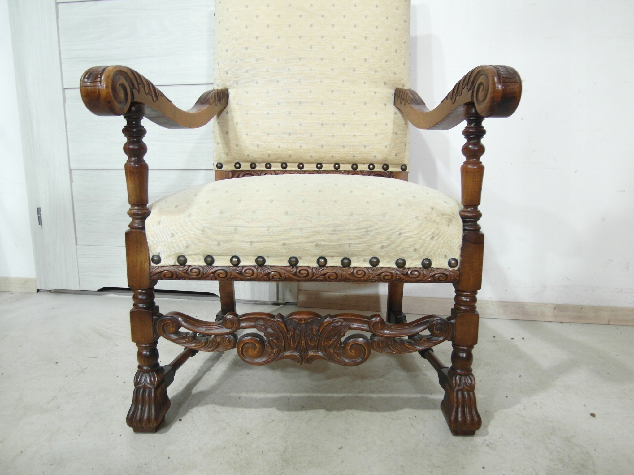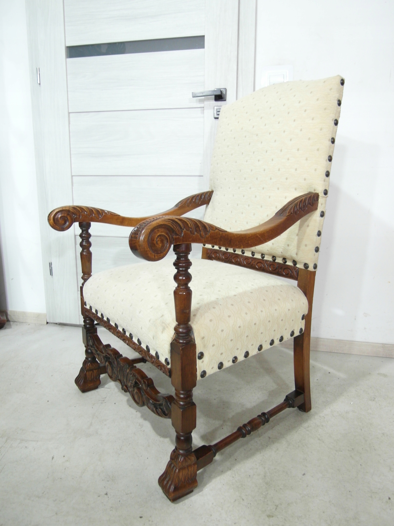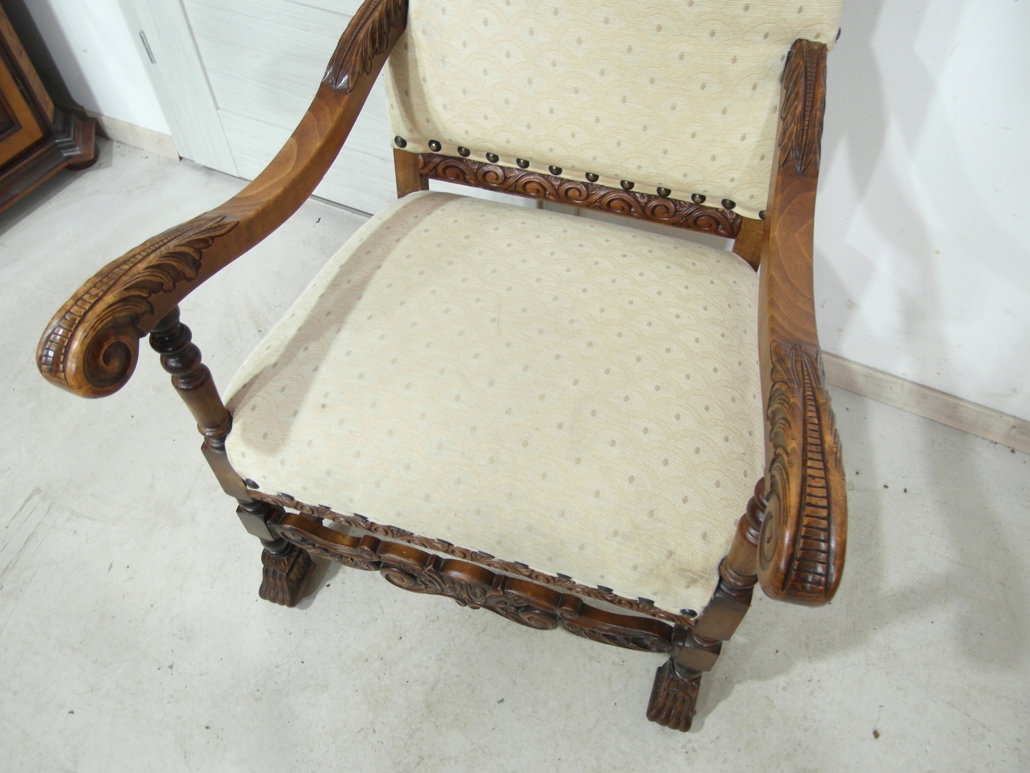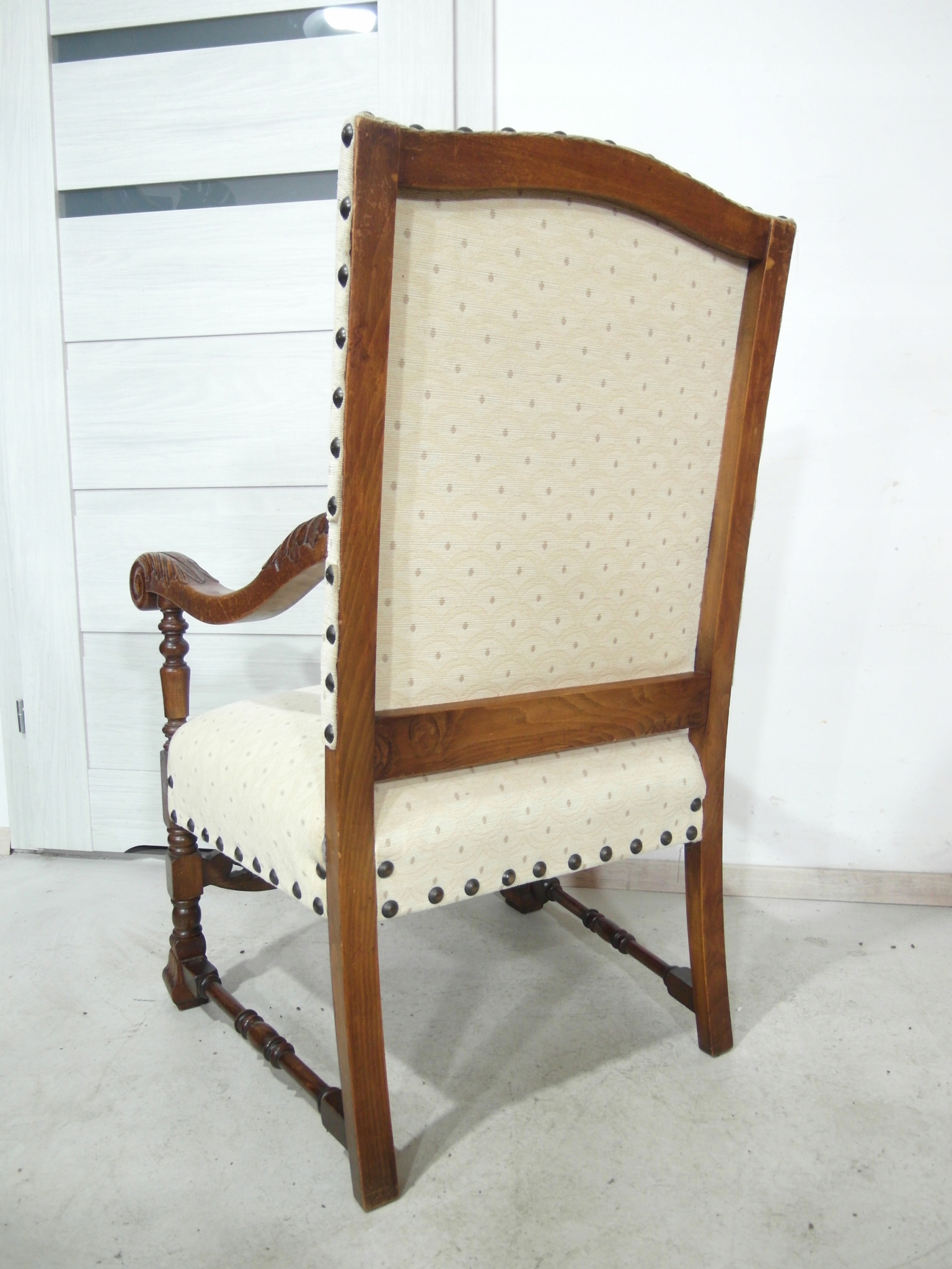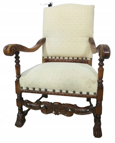 Opis: fotel z podłokietnikami z drewna , stabilny i bardzo mocny, siedzisko i oparcie pokryte grubym wytrzymałym materiałem
