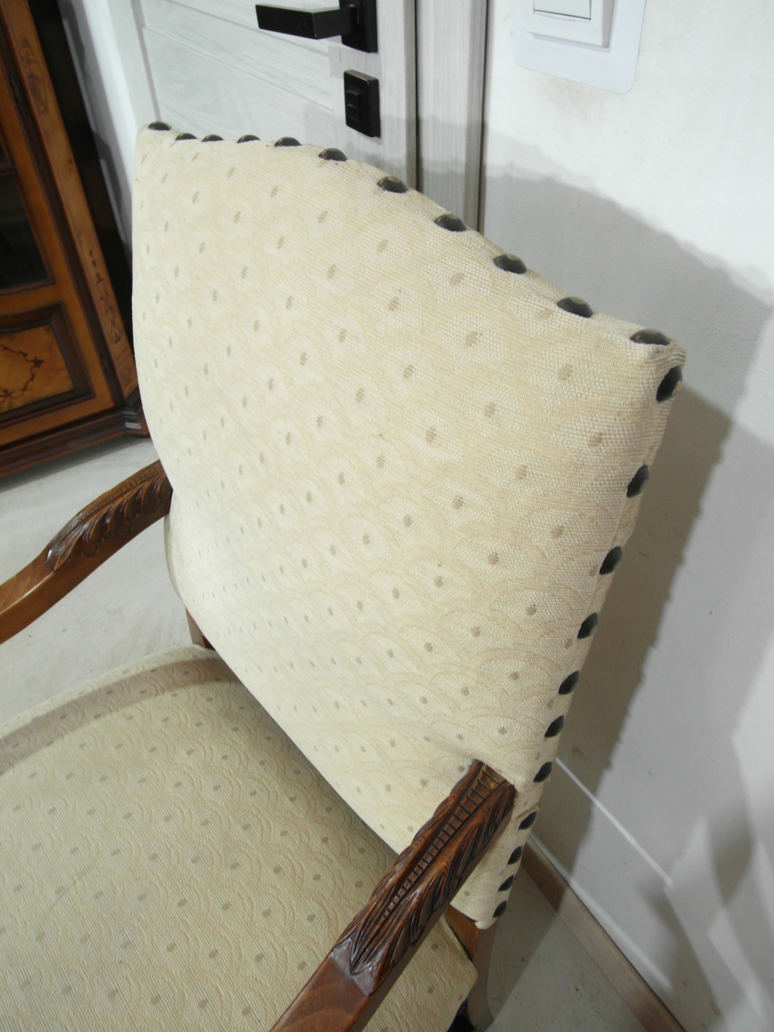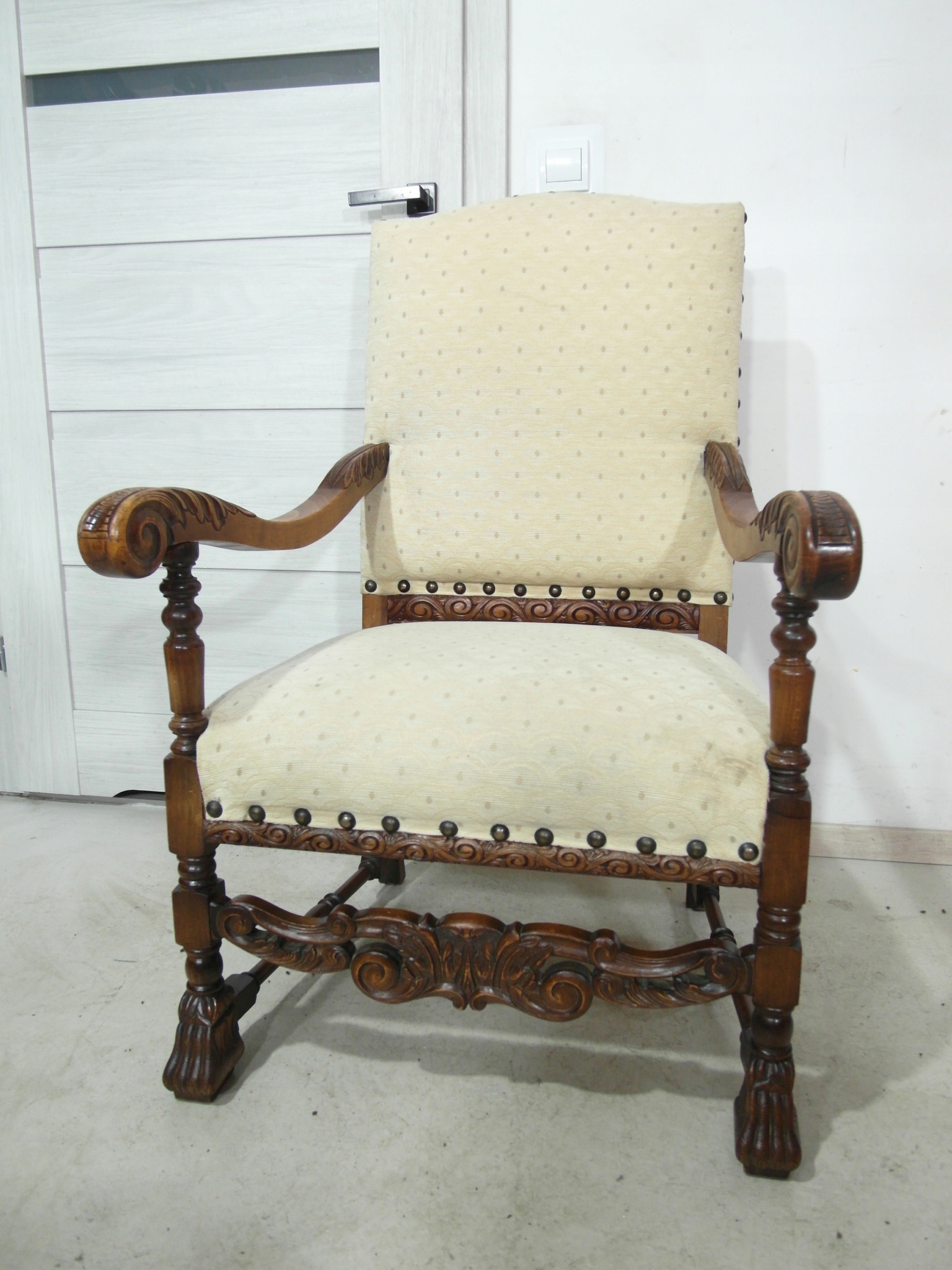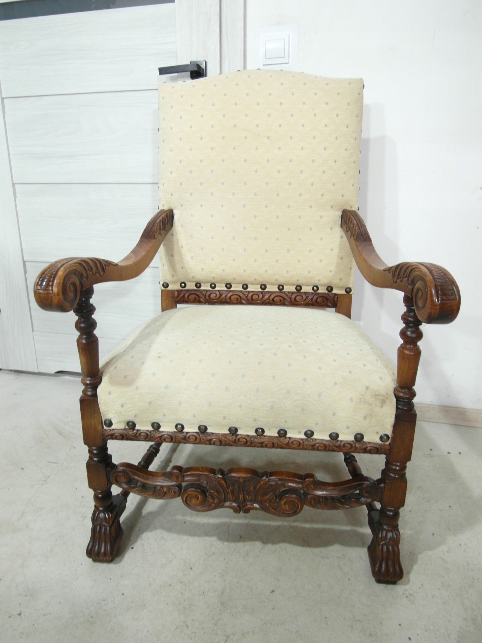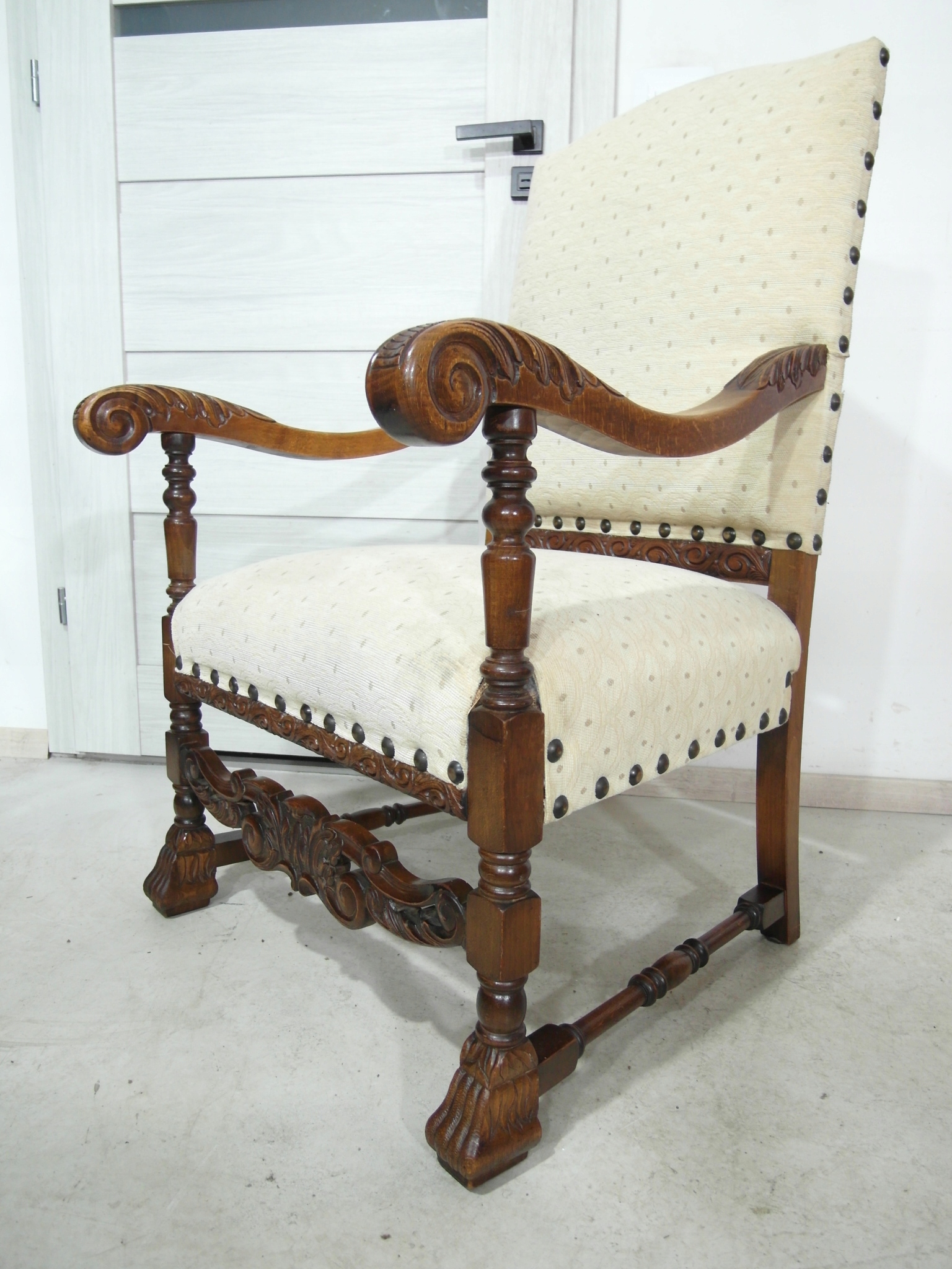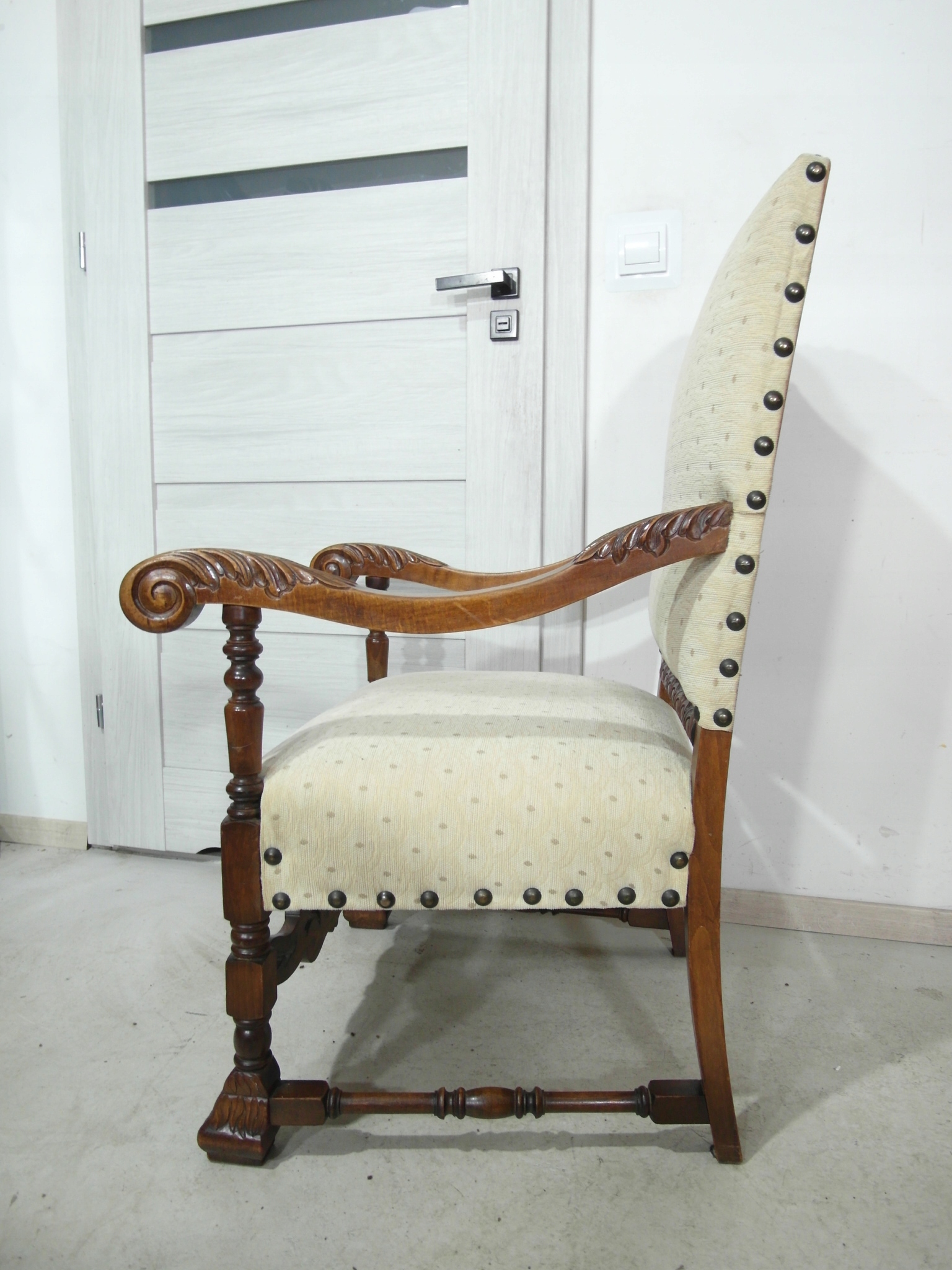 Opis: fotel z podłokietnikami z drewna , stabilny i bardzo mocny, siedzisko i oparcie pokryte grubym wytrzymałym materiałem