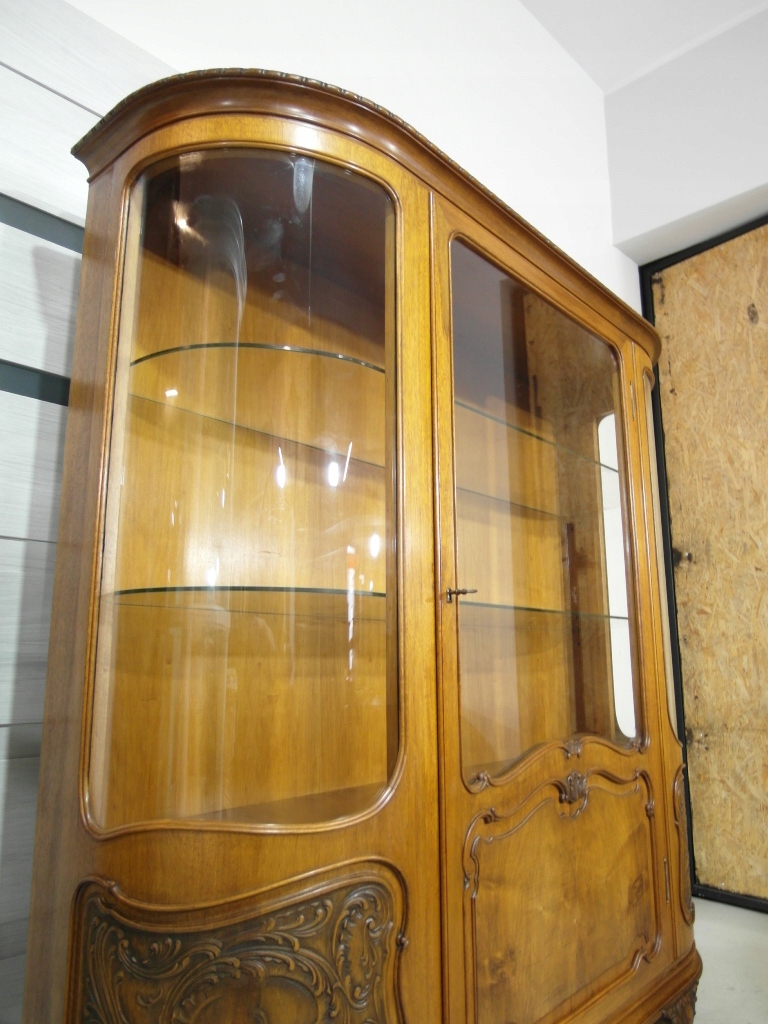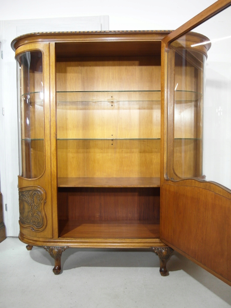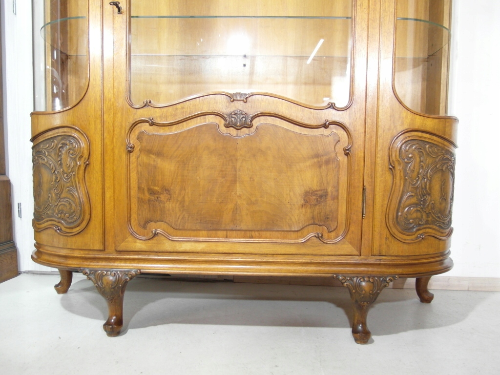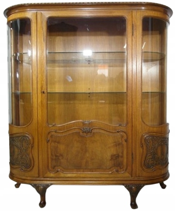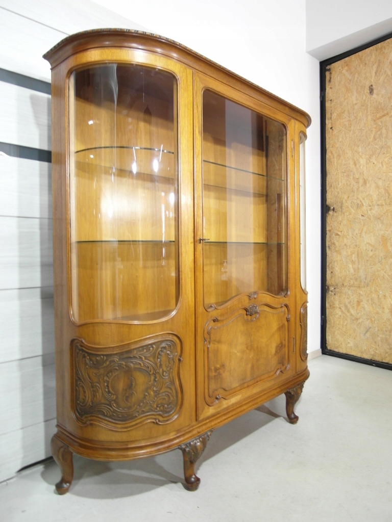 Opis: witryna przeszklona ZAMYKANA NA KLUCZ , W ŚRODKU PÓŁKI , kompletna , wszystko sprawne , oryginalne okucia,