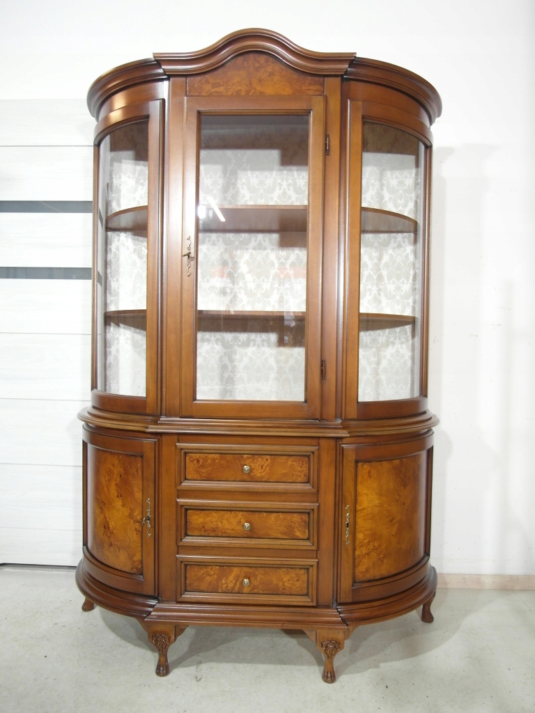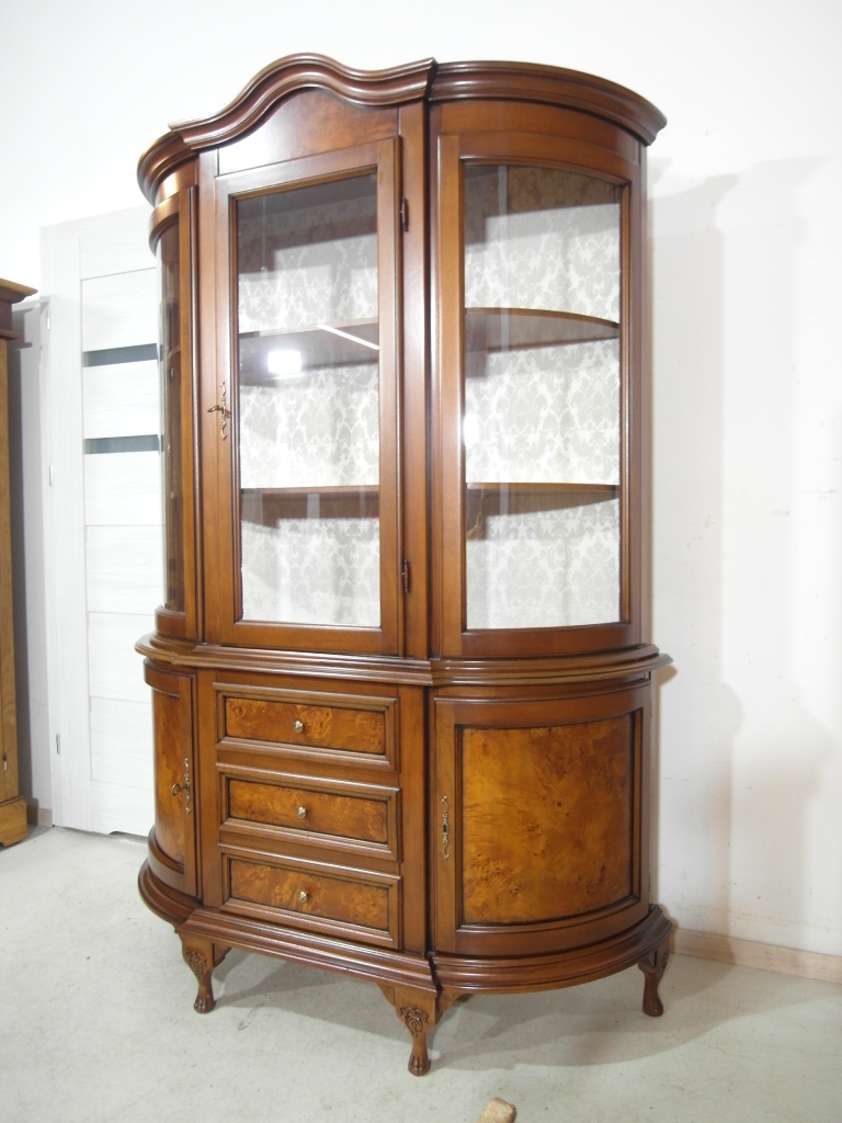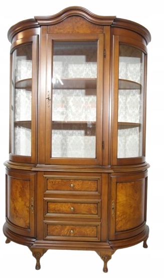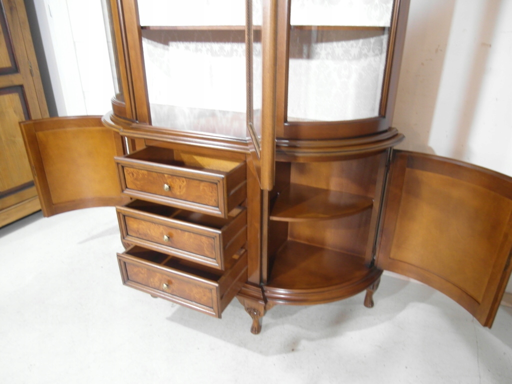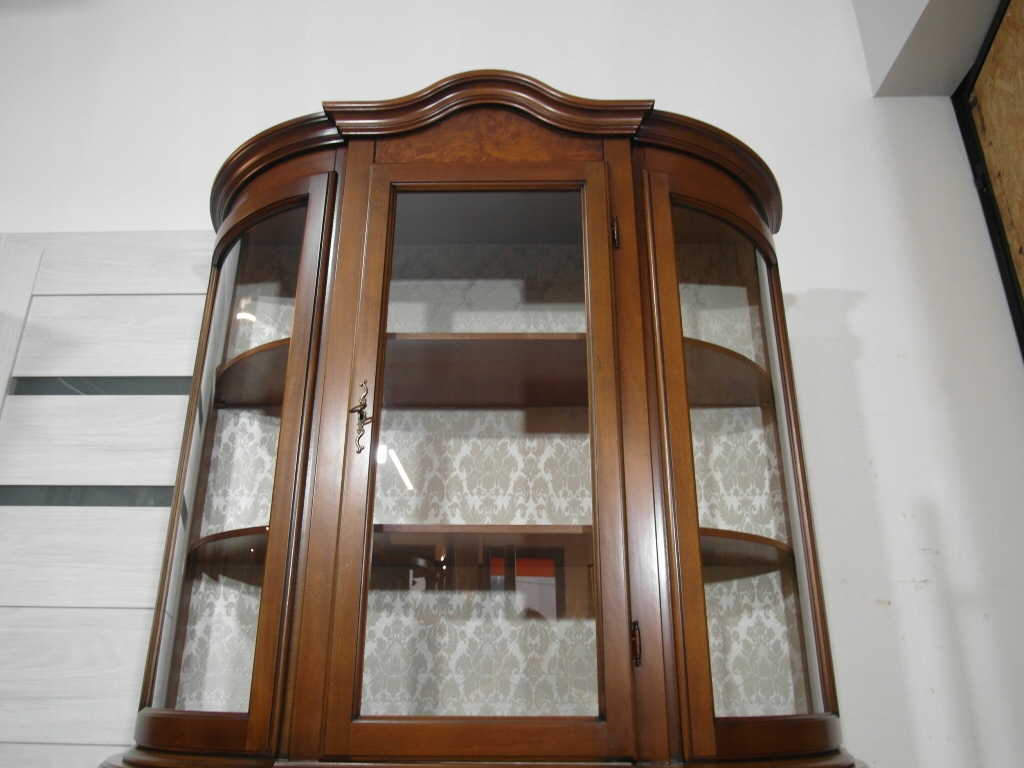 Opis: witryna przeszklona ZAMYKANA NA KLUCZ , W ŚRODKU PÓŁKI , kompletna , wszystko sprawne , oryginalne okucia,