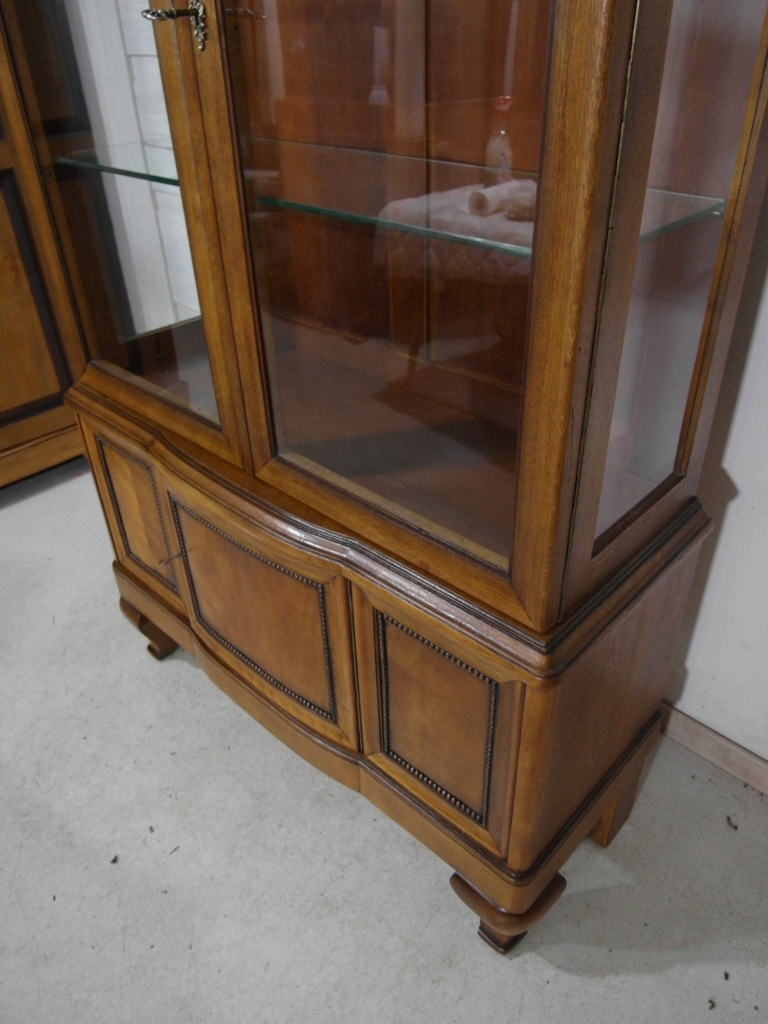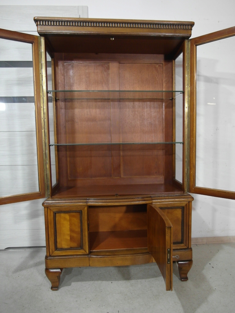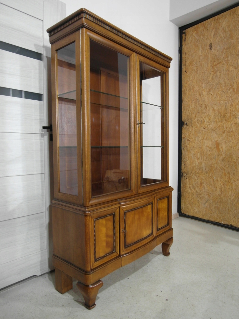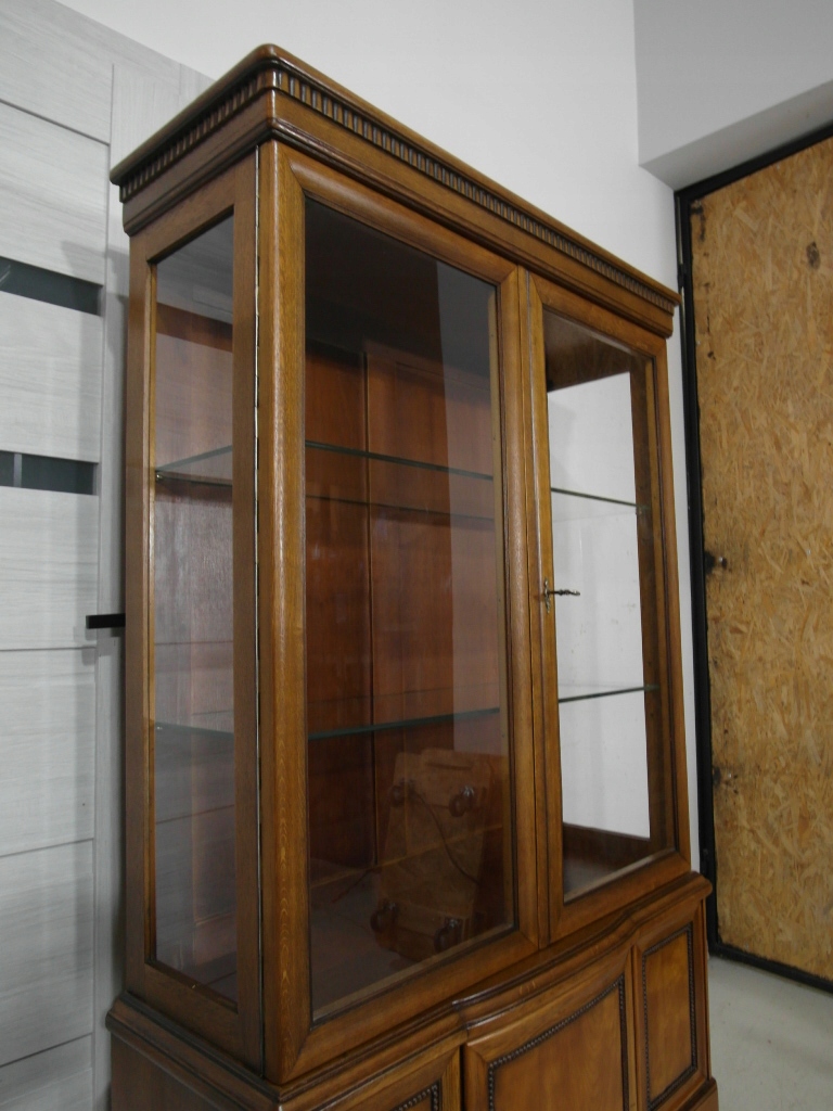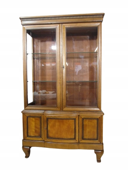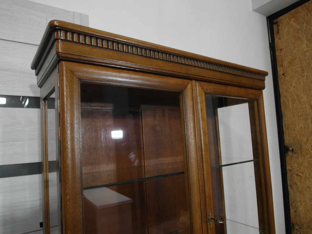 Opis: witryna przeszklona ZAMYKANA NA KLUCZ , W ŚRODKU PÓŁKI , kompletna , wszystko sprawne , oryginalne okucia,
