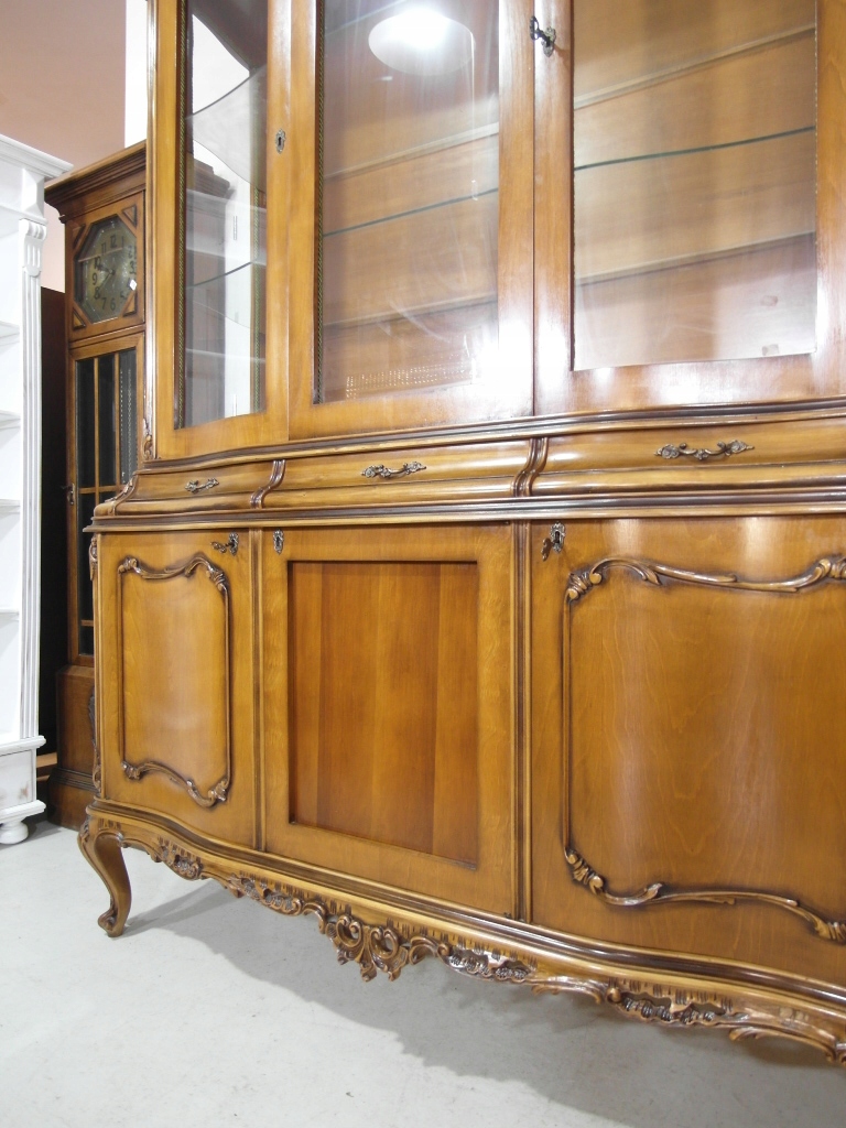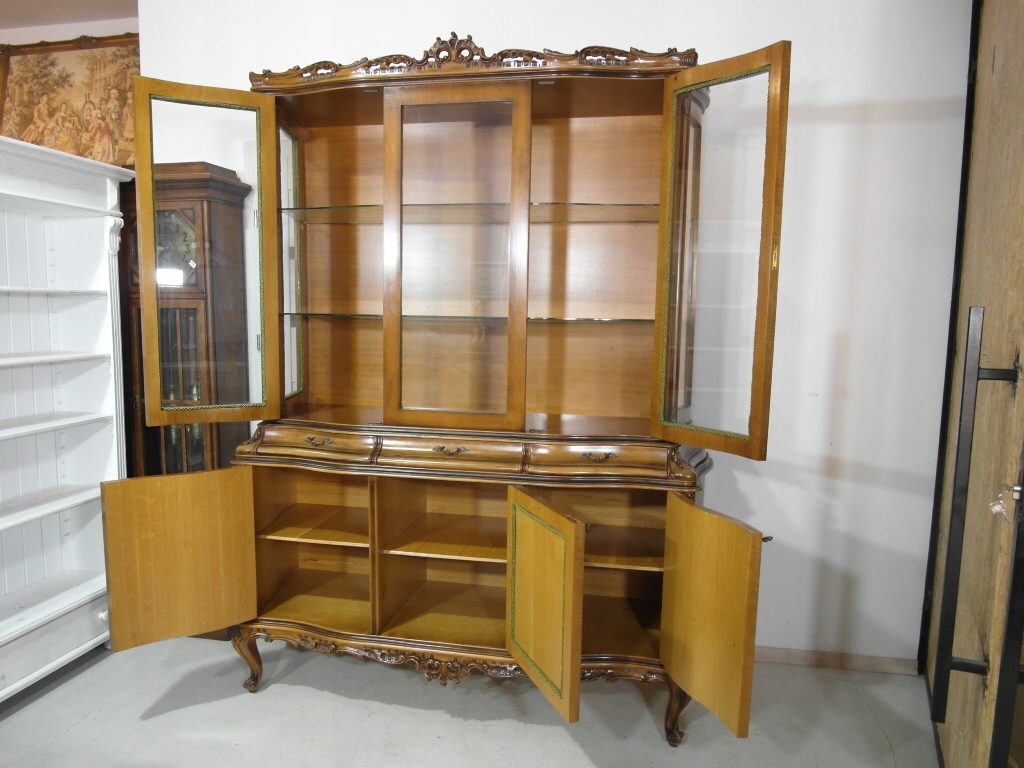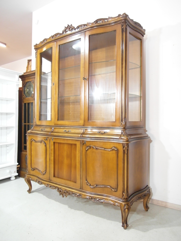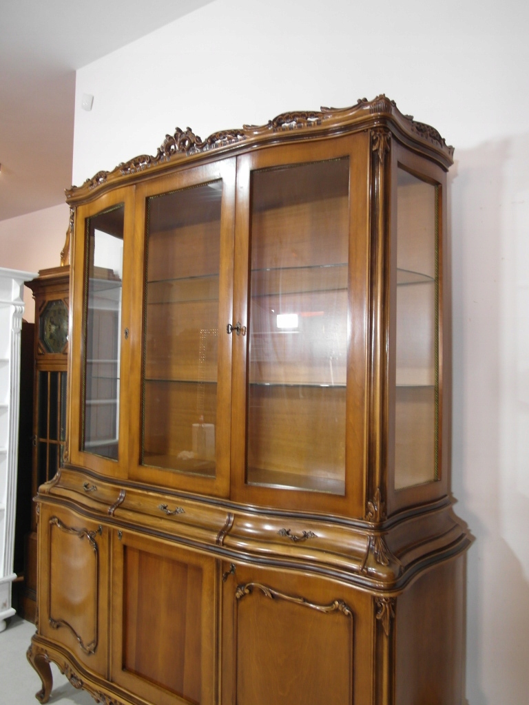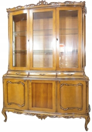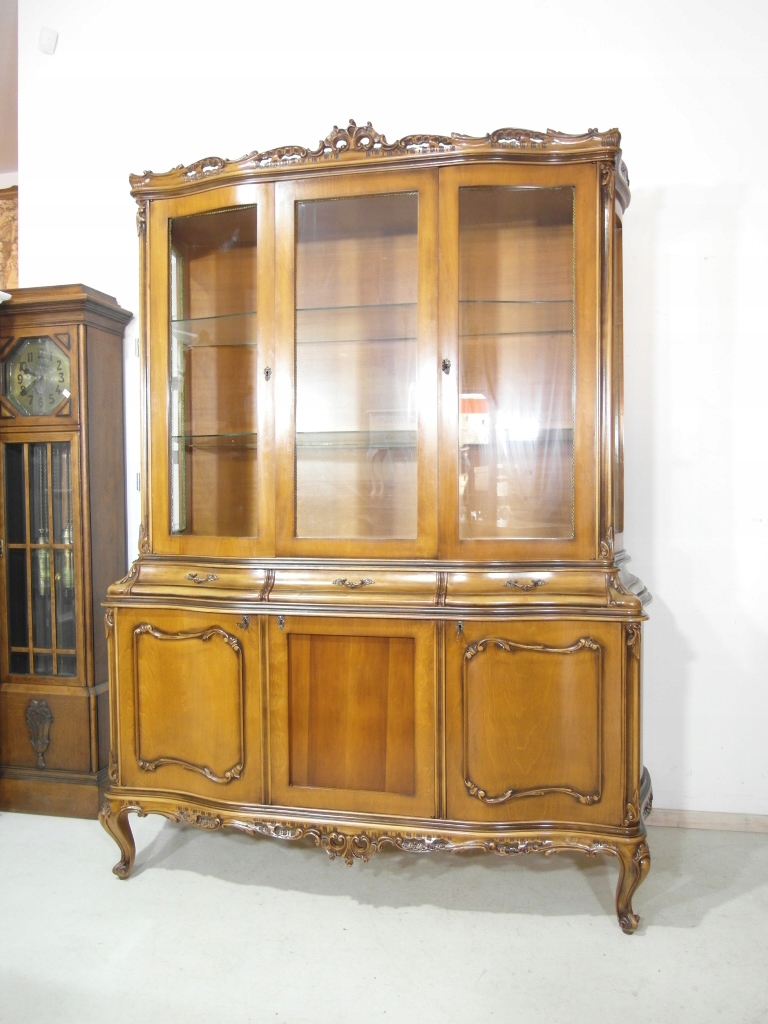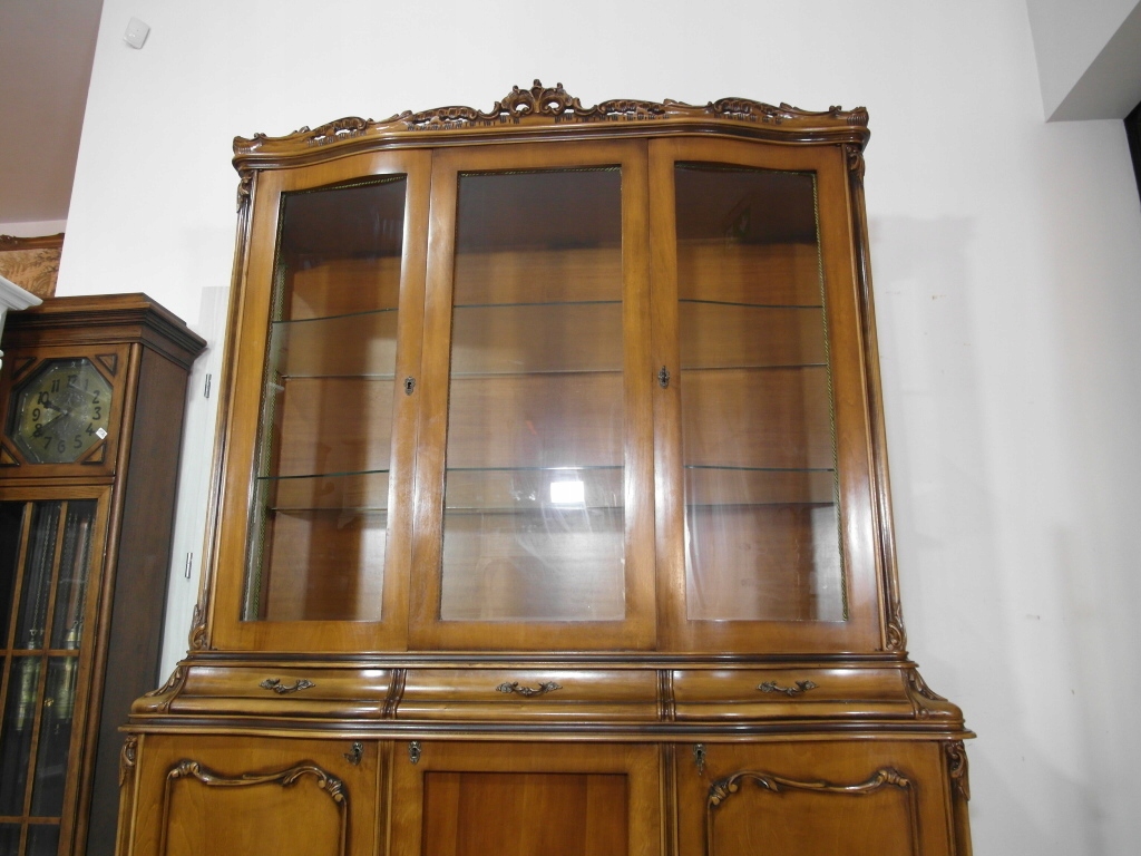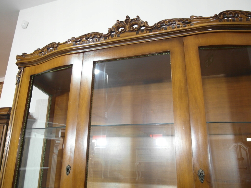 Opis: witryna przeszklona ZAMYKANA NA KLUCZ , W ŚRODKU PÓŁKI , kompletna , wszystko sprawne , oryginalne okucia,