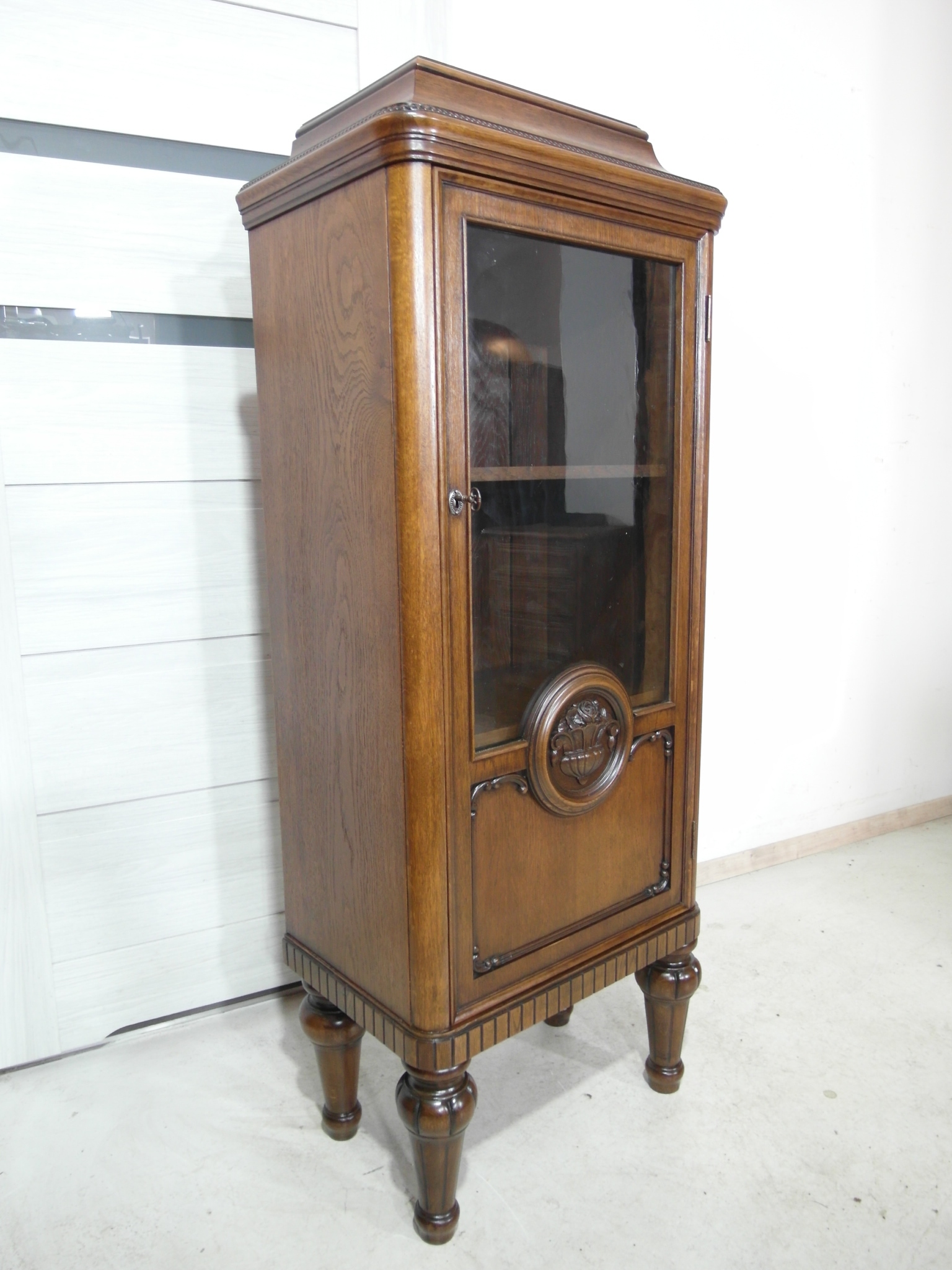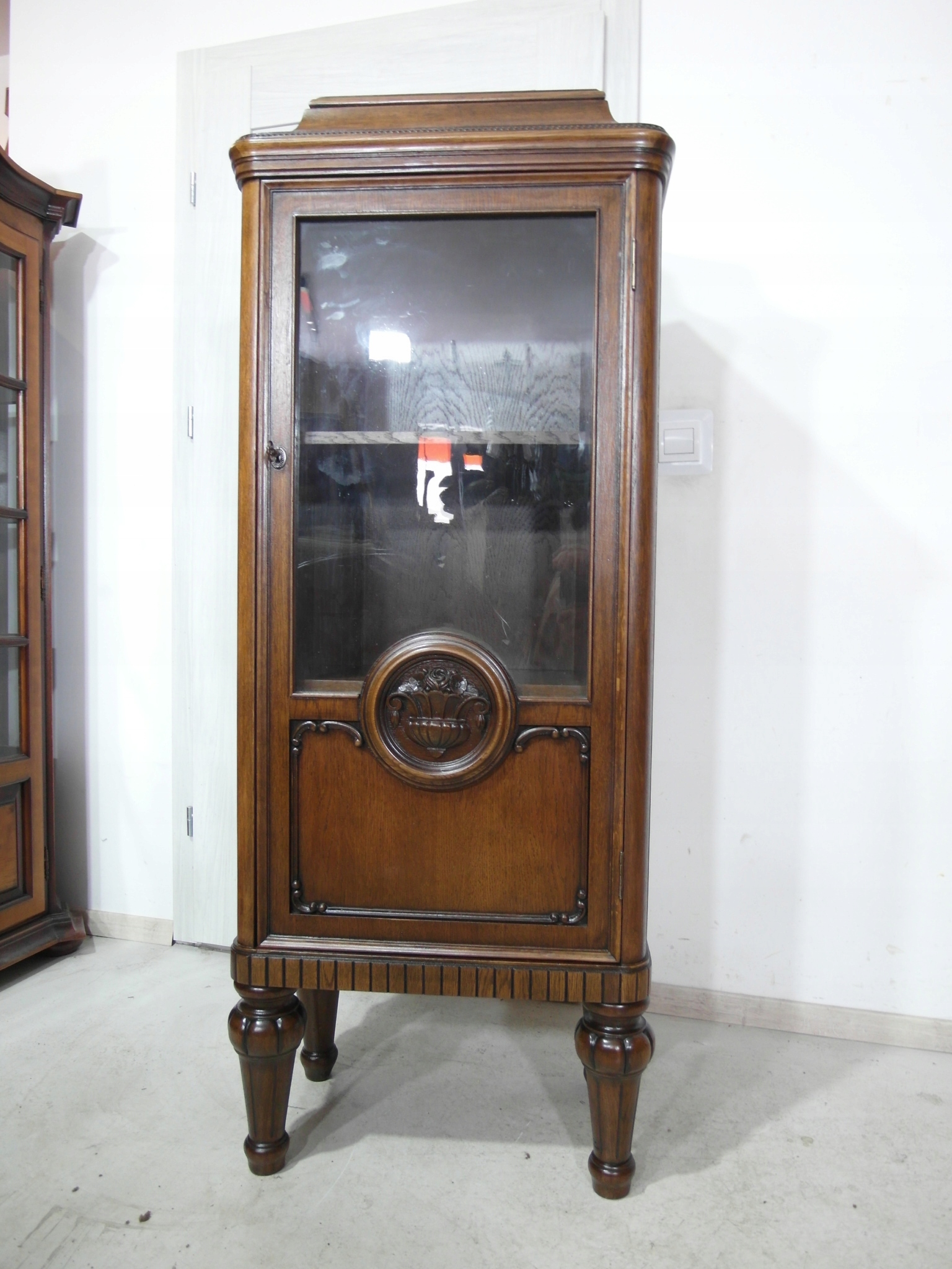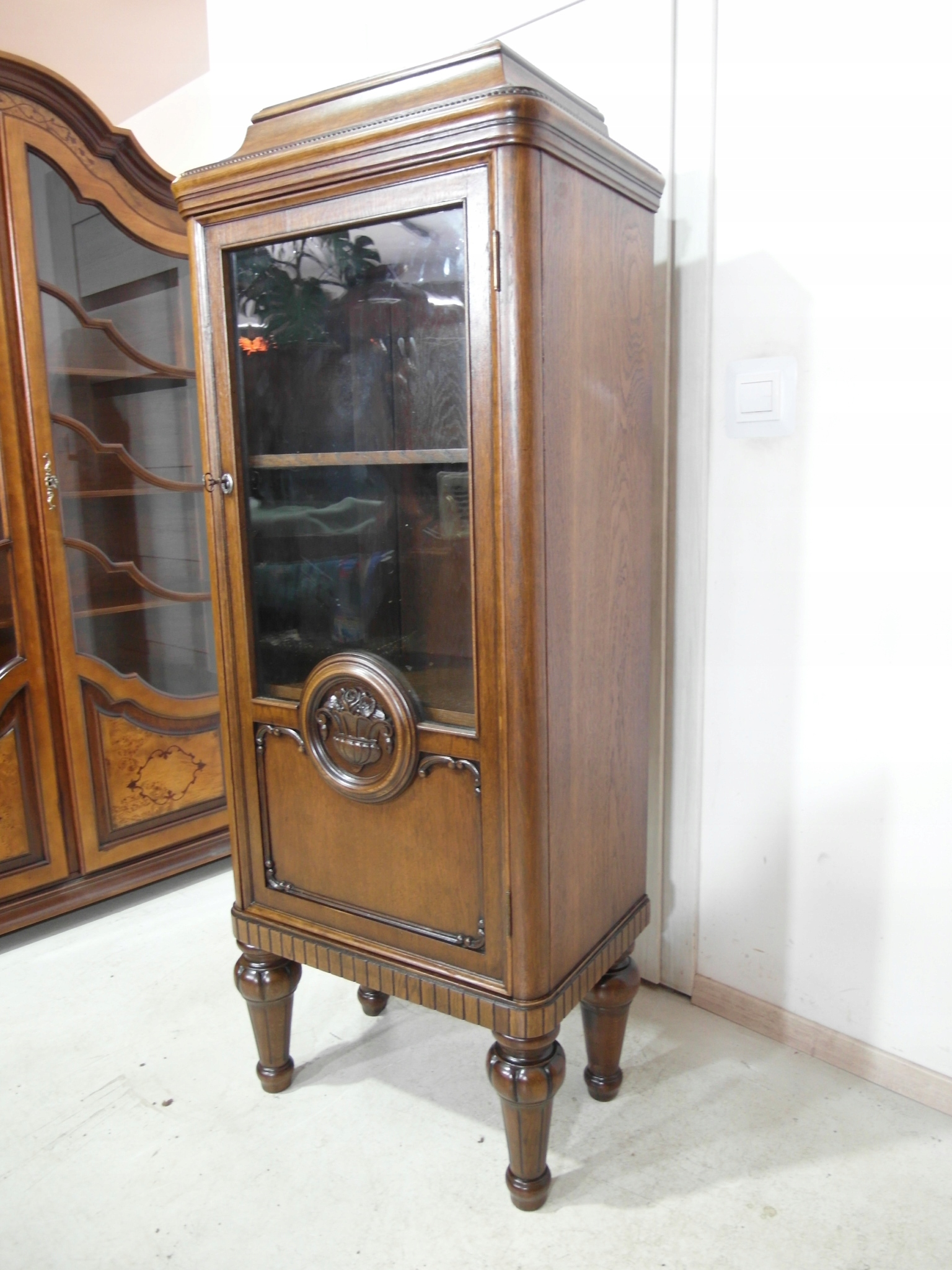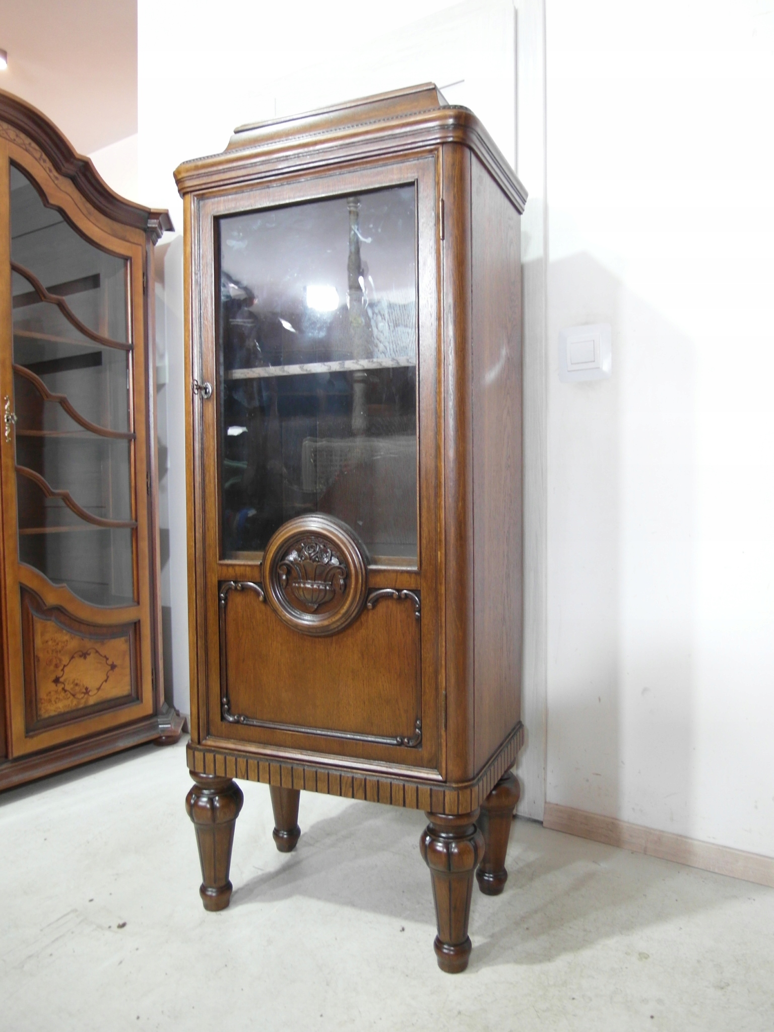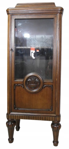 Opis: witryna przeszklona ZAMYKANA NA KLUCZ , W ŚRODKU PÓŁKI , kompletna , wszystko sprawne , oryginalne okucia,