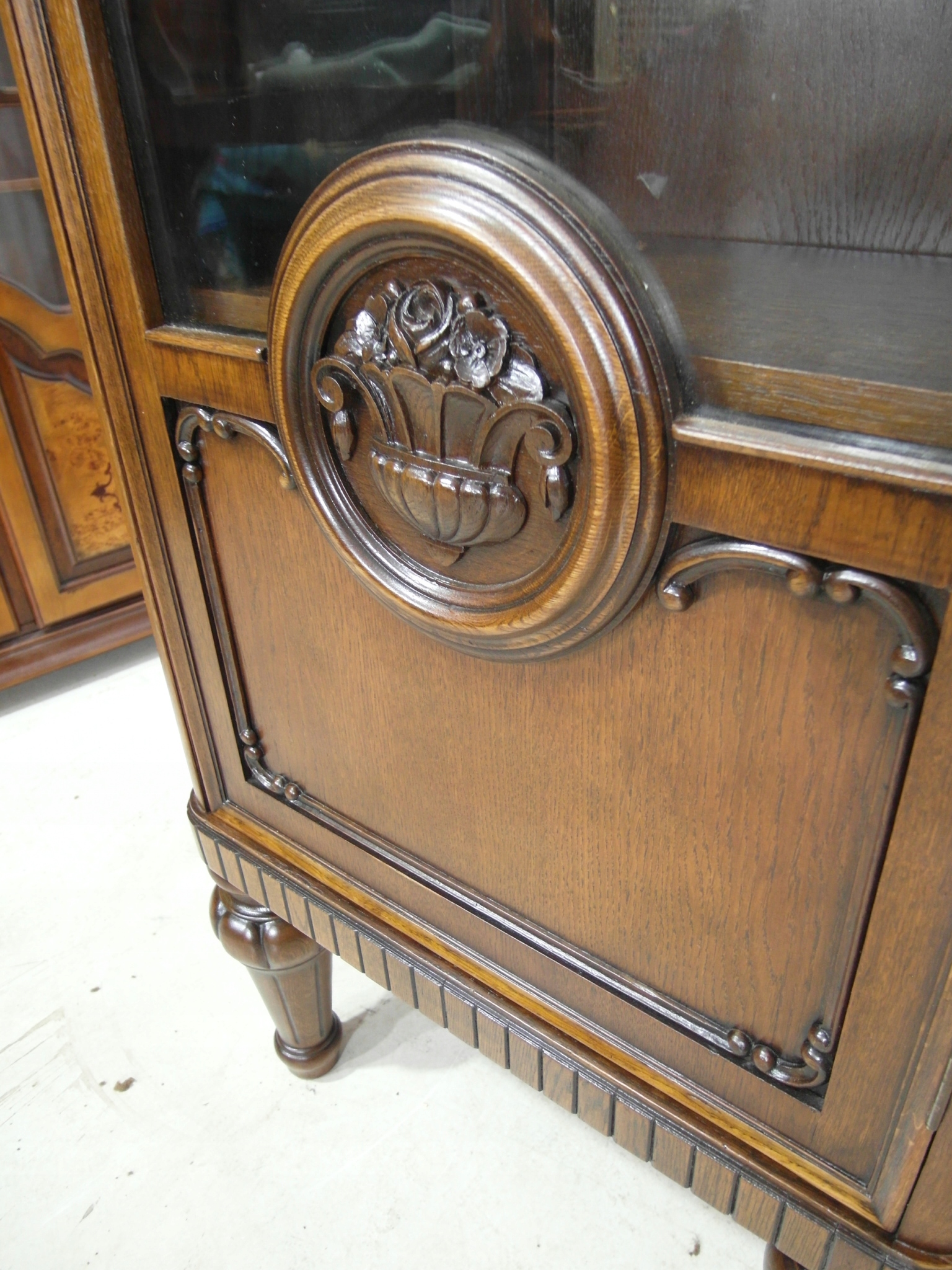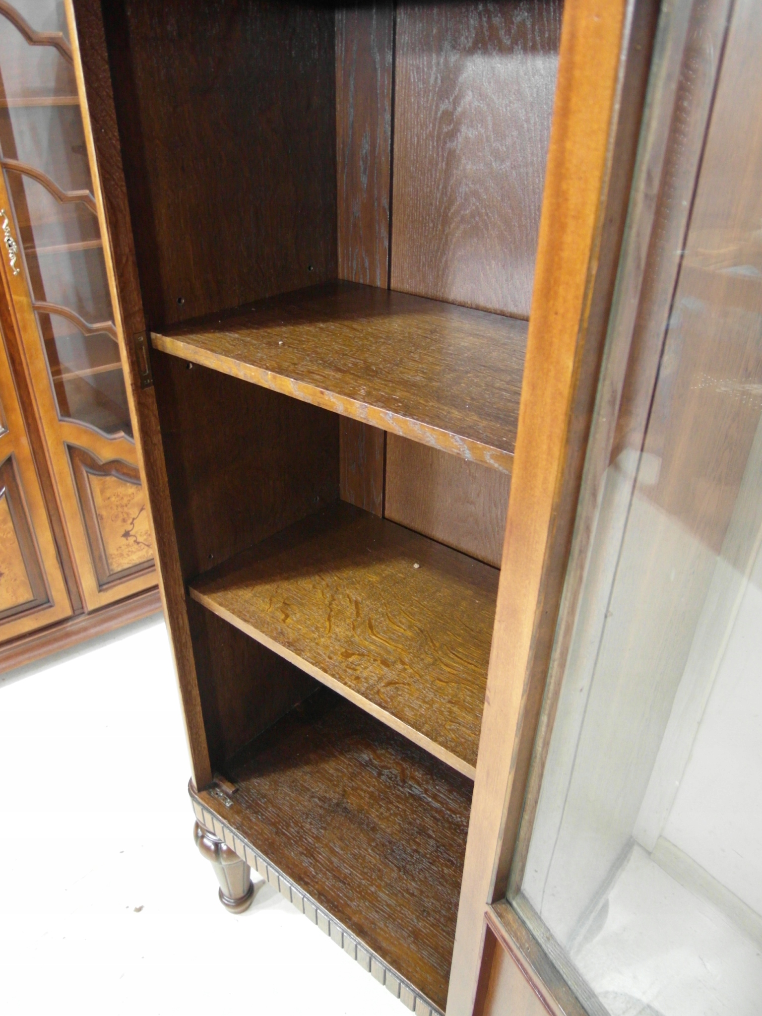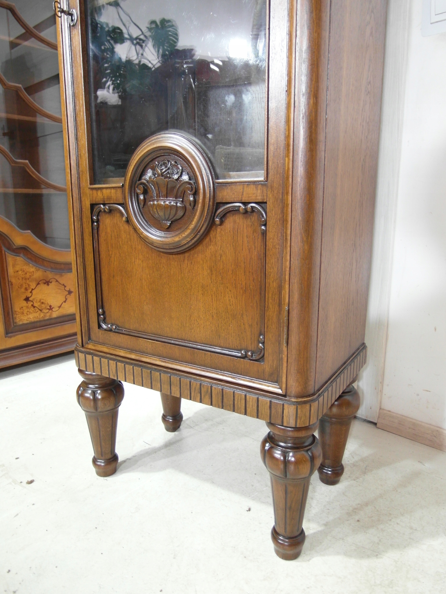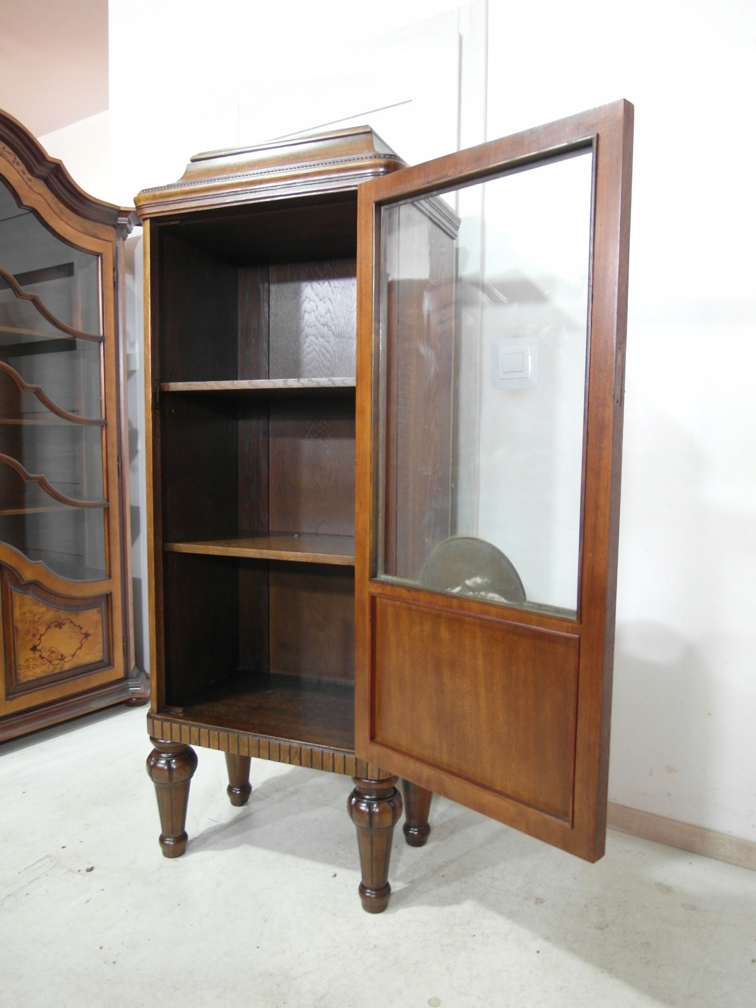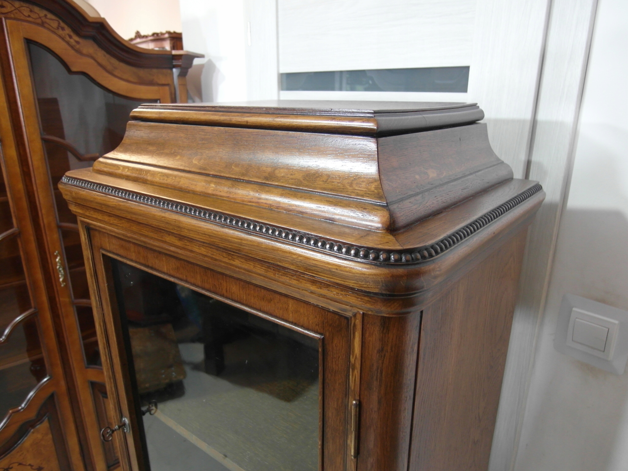 Opis: witryna przeszklona ZAMYKANA NA KLUCZ , W ŚRODKU PÓŁKI , kompletna , wszystko sprawne , oryginalne okucia,