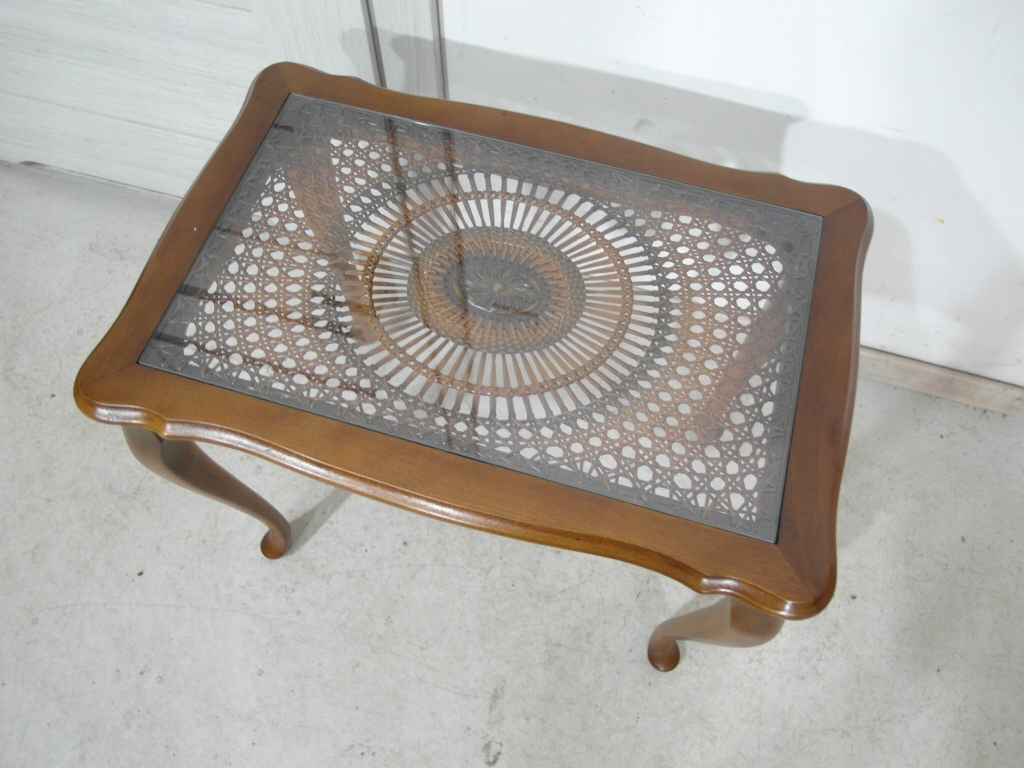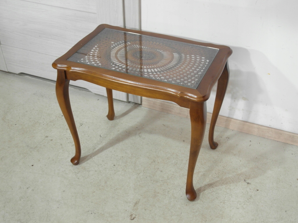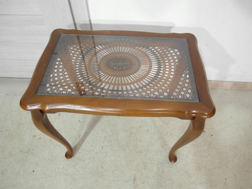 Opis: stolik z przepięknym blatem zdobionym wzorem symetrycznym z rafii ,   z drewna na blacie szyba