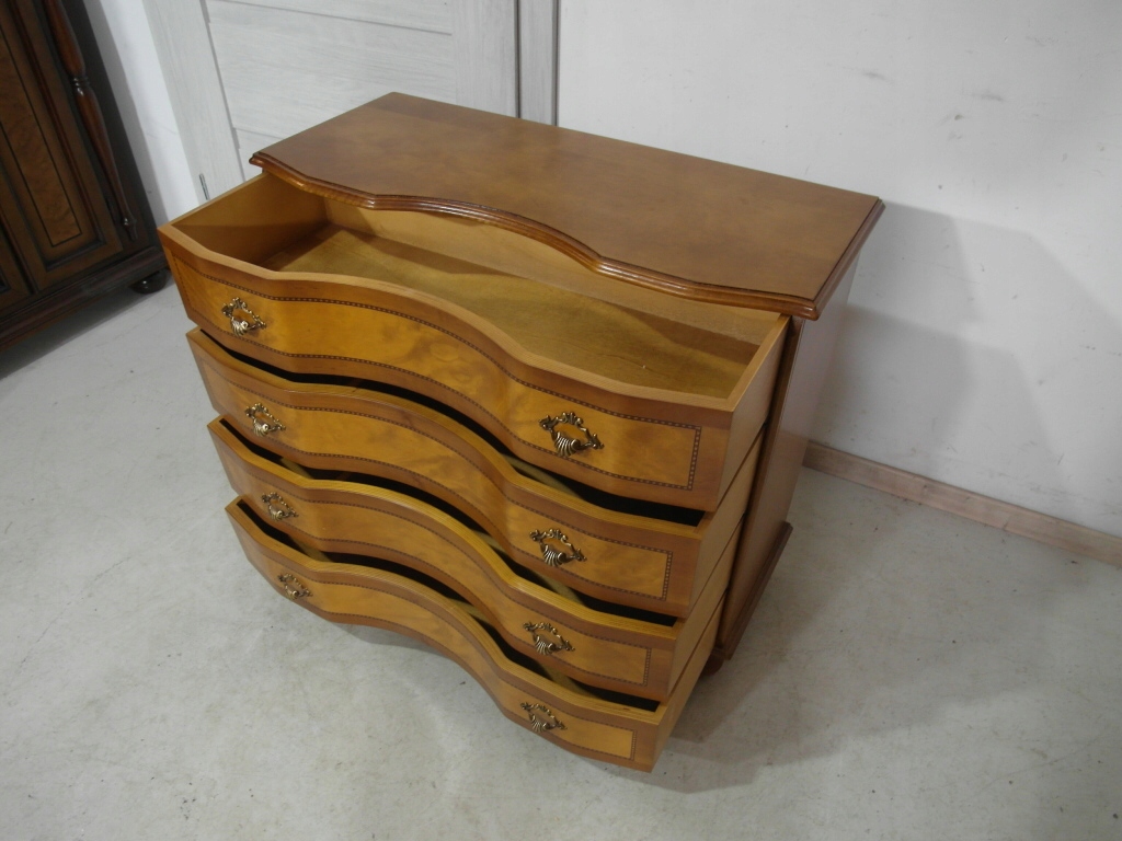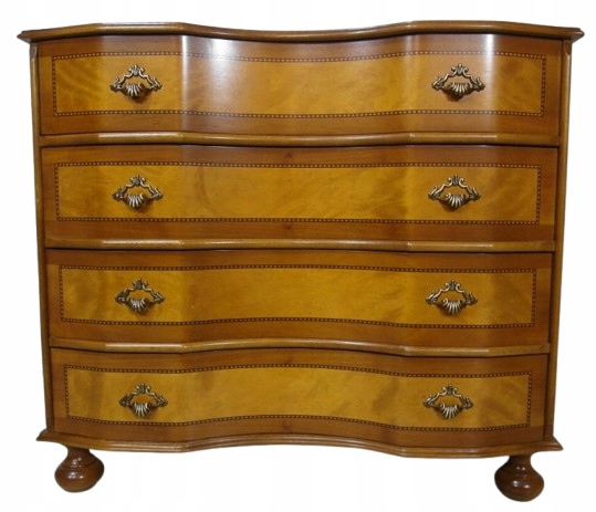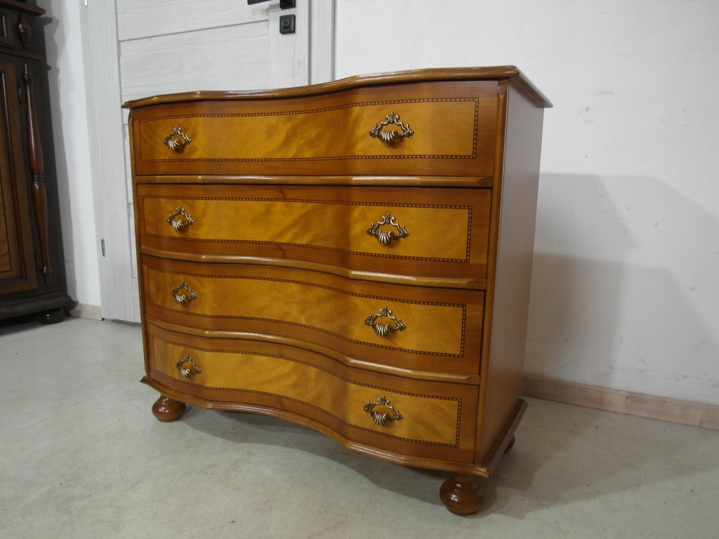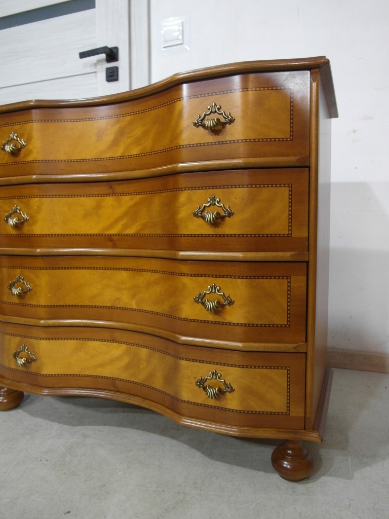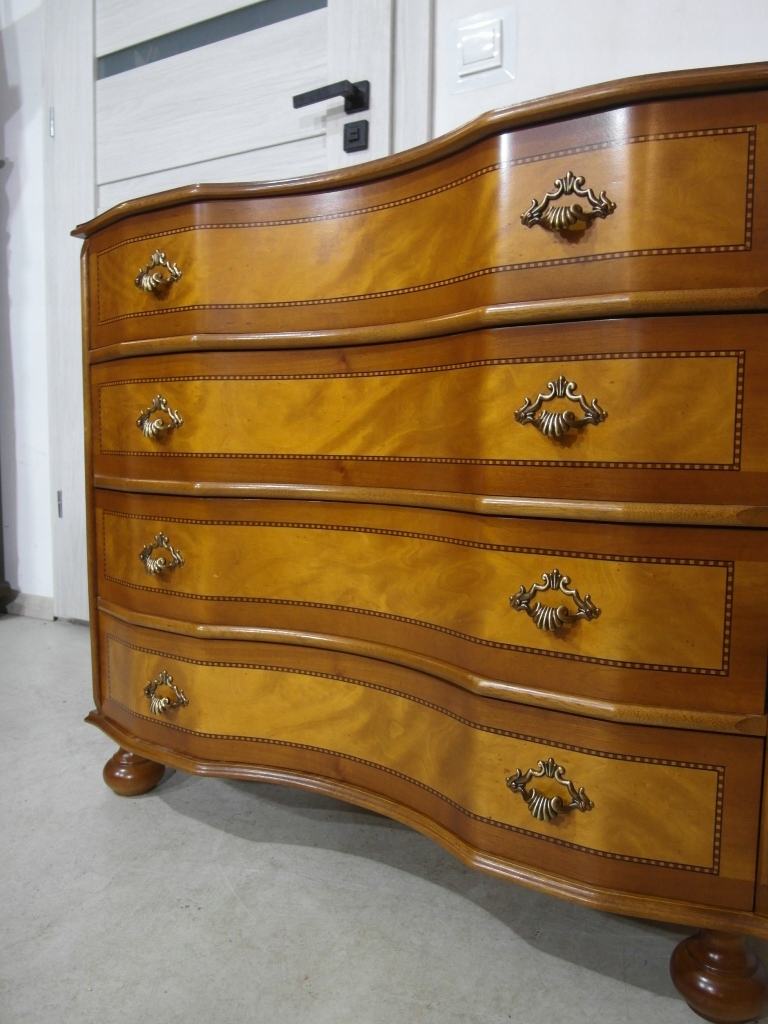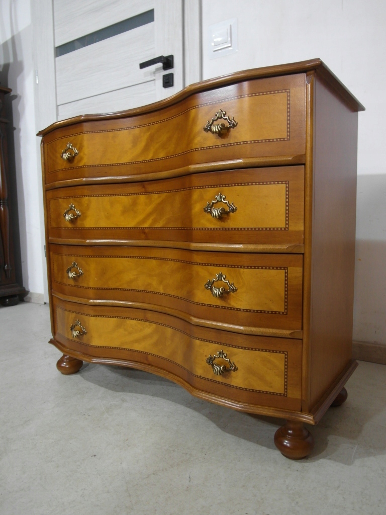 Opis: szafka z szufladami intarsjowana, bardzo pojemne szuflady – głębokie , fronty szuflad gięte , stabilna i zgrabna