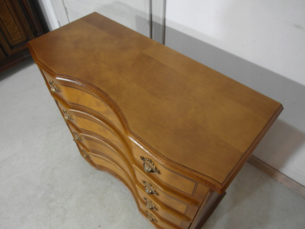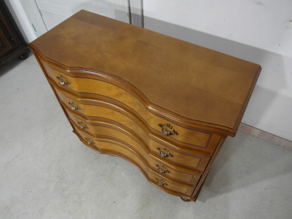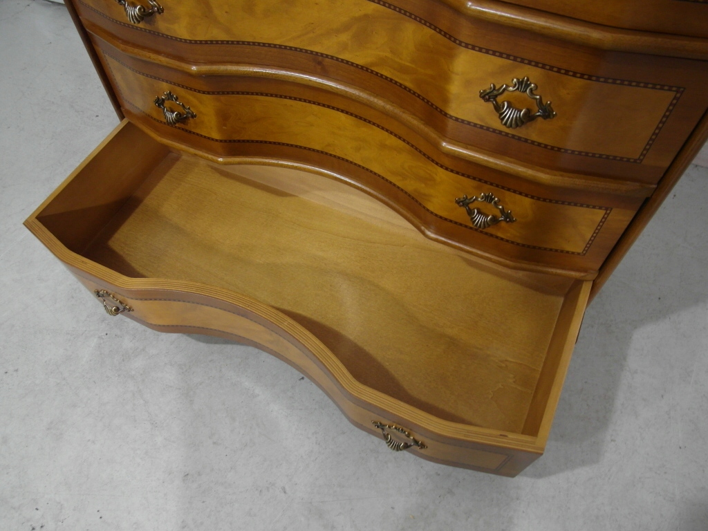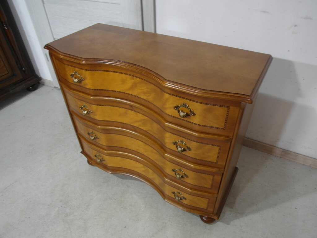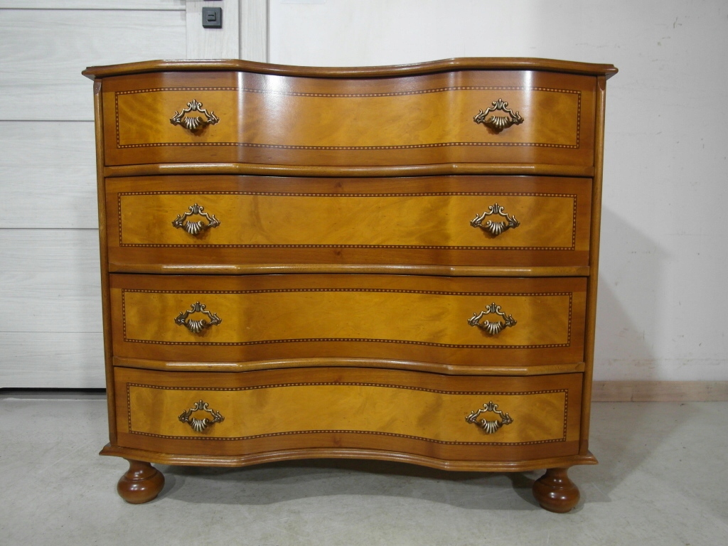 Opis: szafka z szufladami intarsjowana, bardzo pojemne szuflady – głębokie , fronty szuflad gięte , stabilna i zgrabna