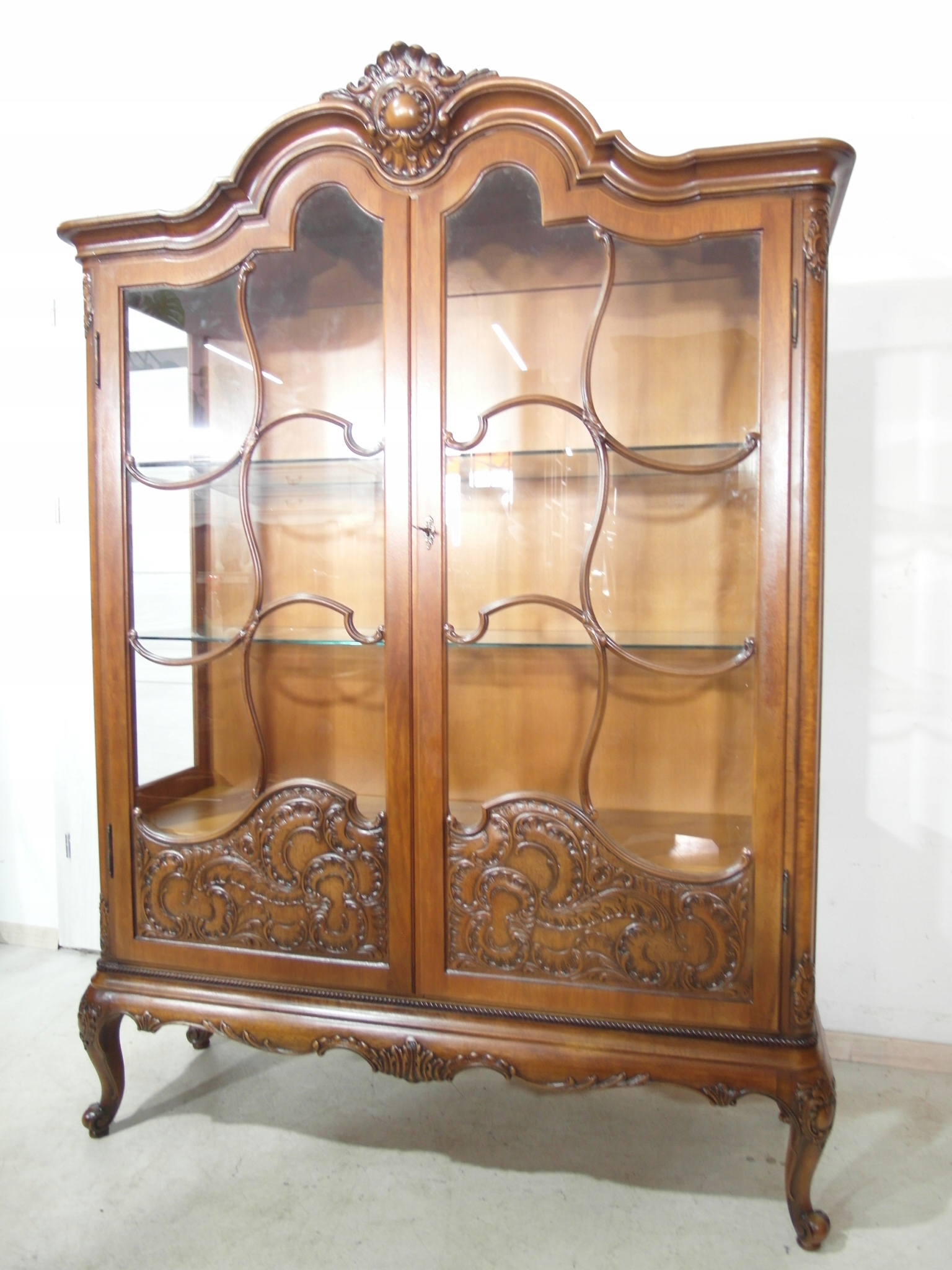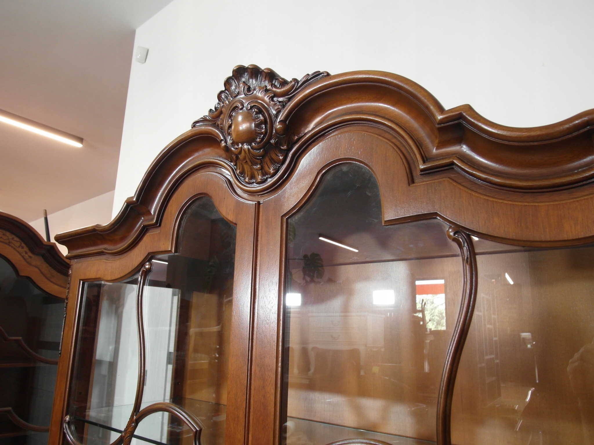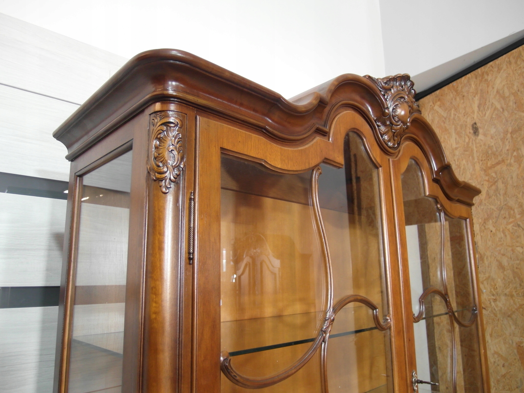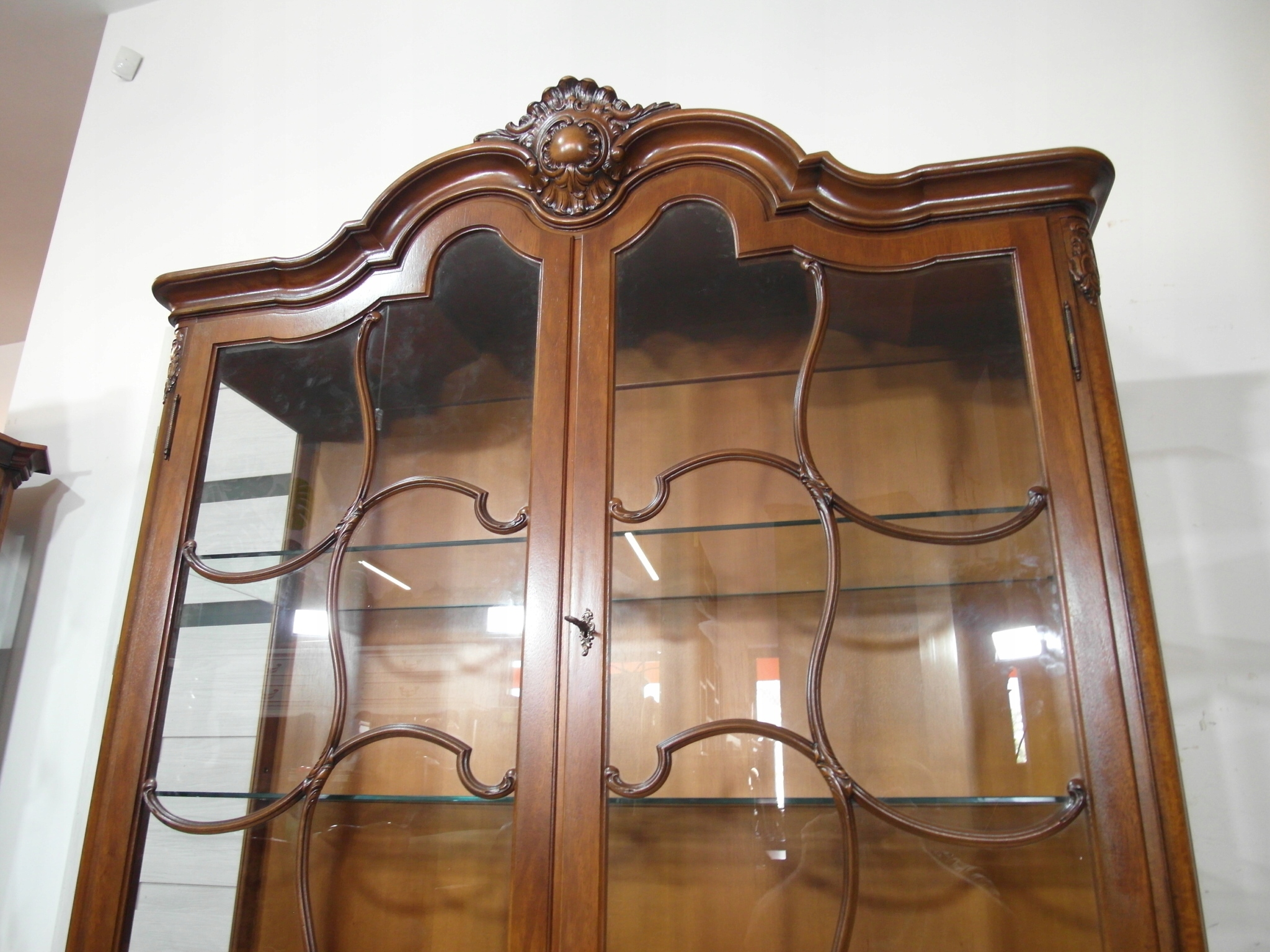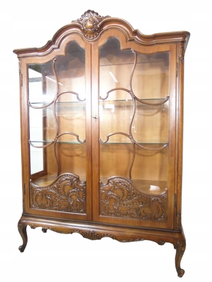 Opis: witryna przeszklona ZAMYKANA NA KLUCZ , W ŚRODKU PÓŁKI , kompletna , wszystko sprawne , oryginalne okucia,z drewna ,