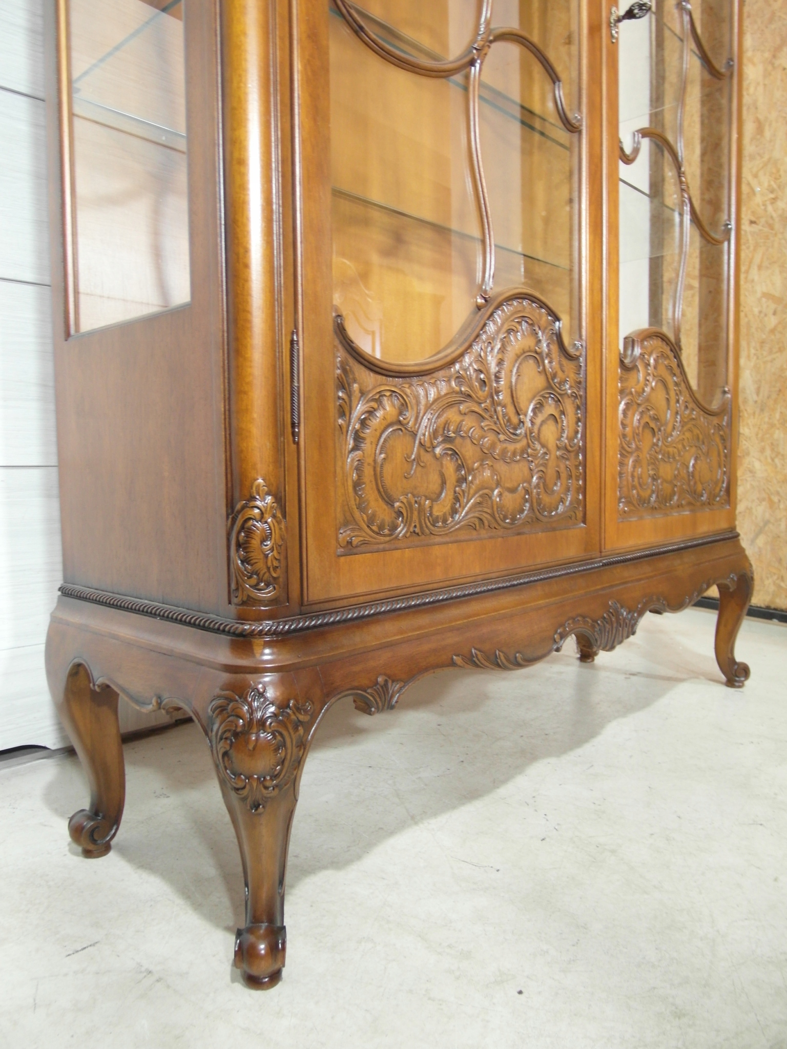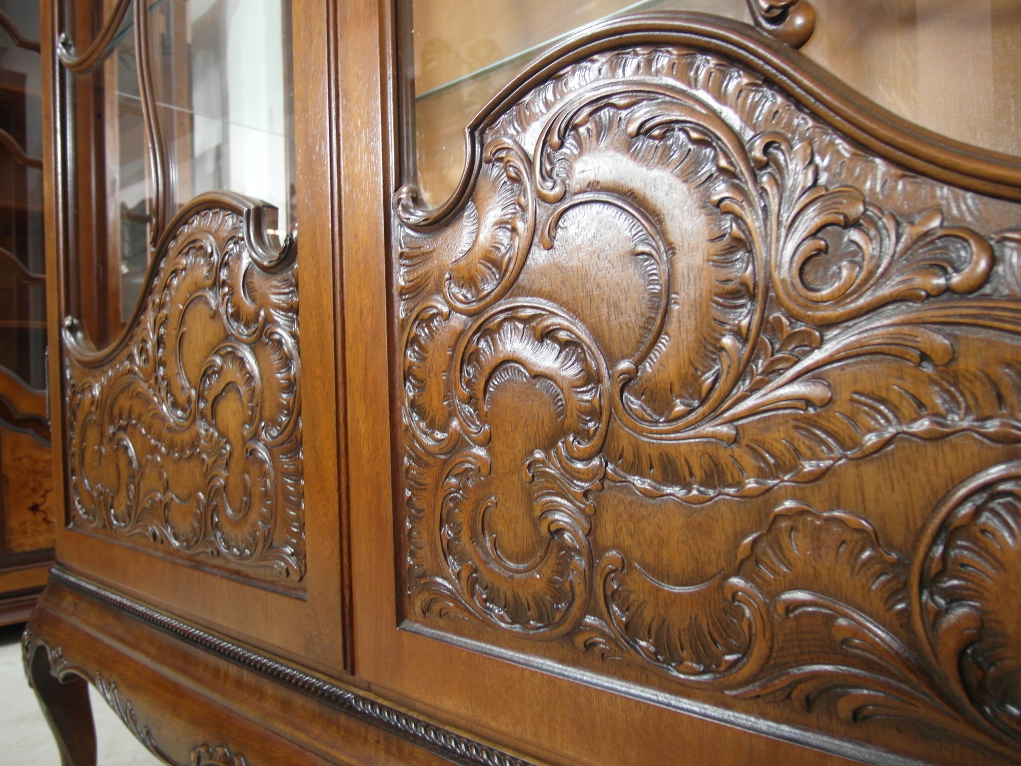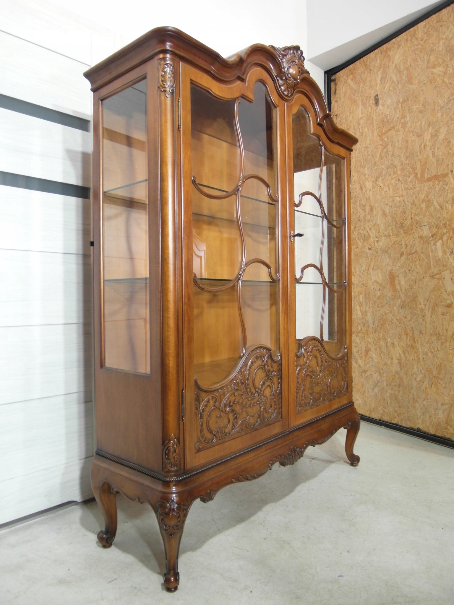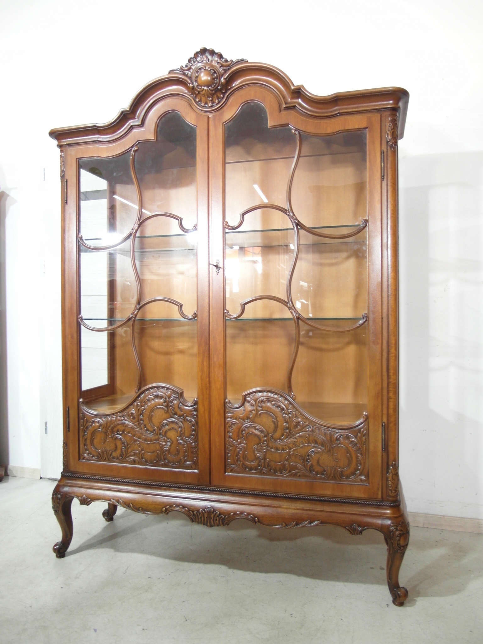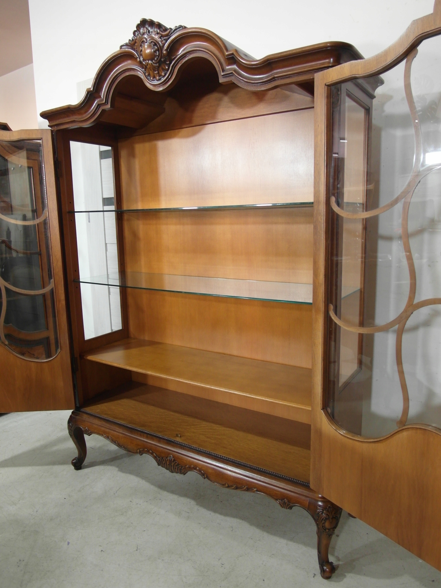 Opis: witryna przeszklona ZAMYKANA NA KLUCZ , W ŚRODKU PÓŁKI , kompletna , wszystko sprawne , oryginalne okucia,z drewna ,