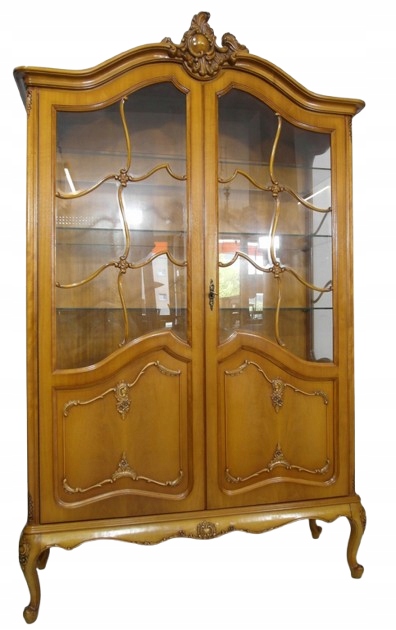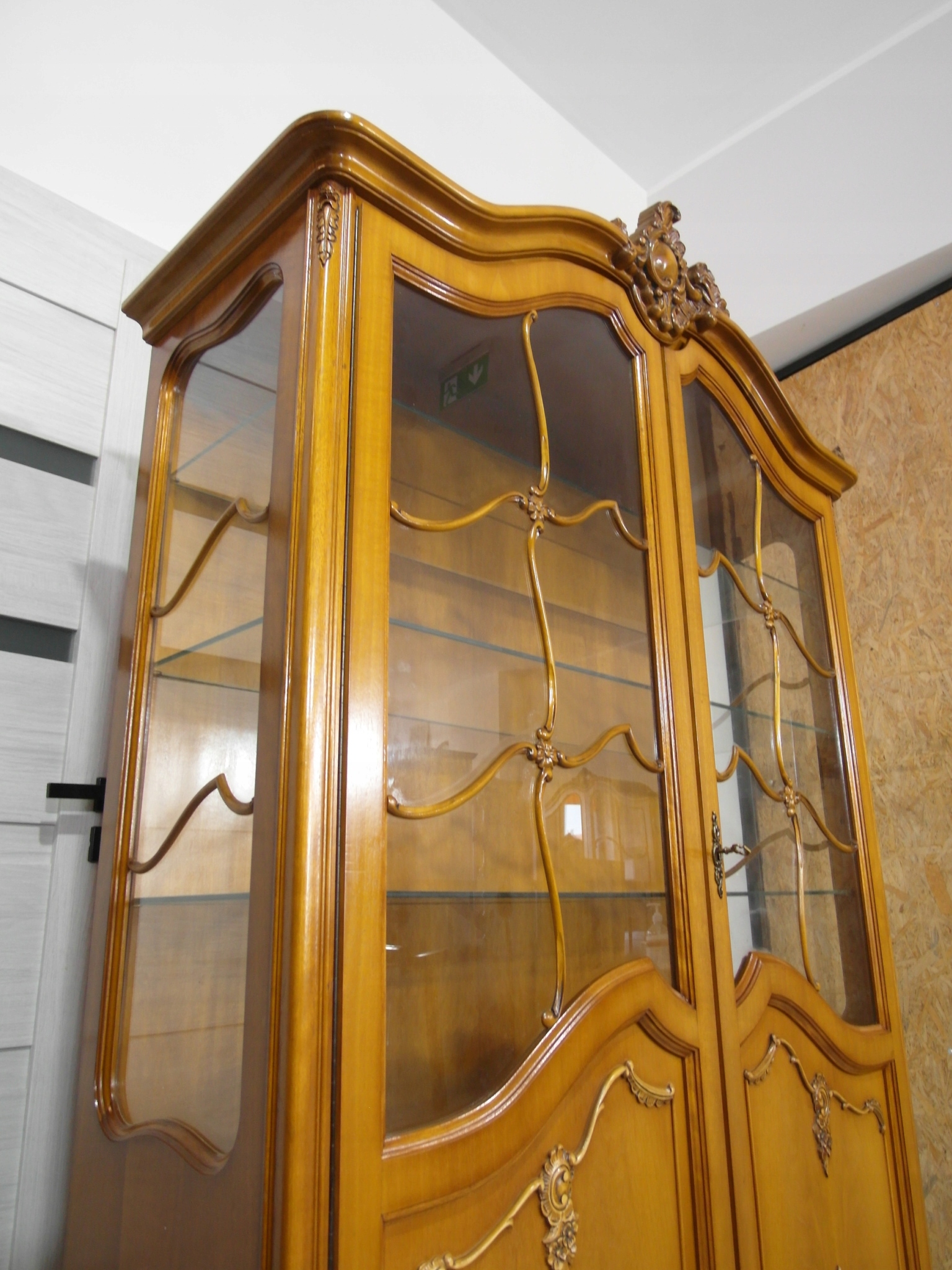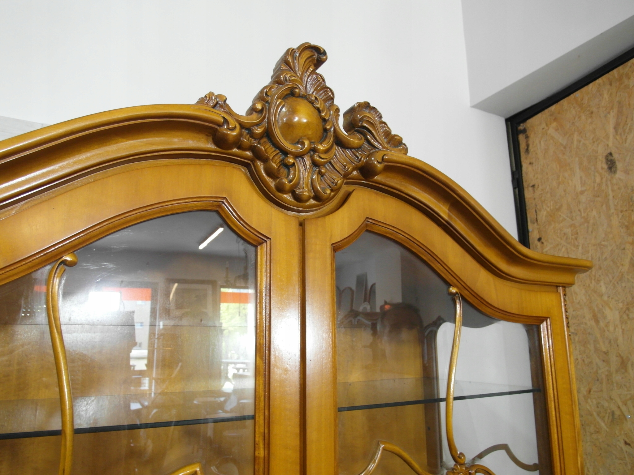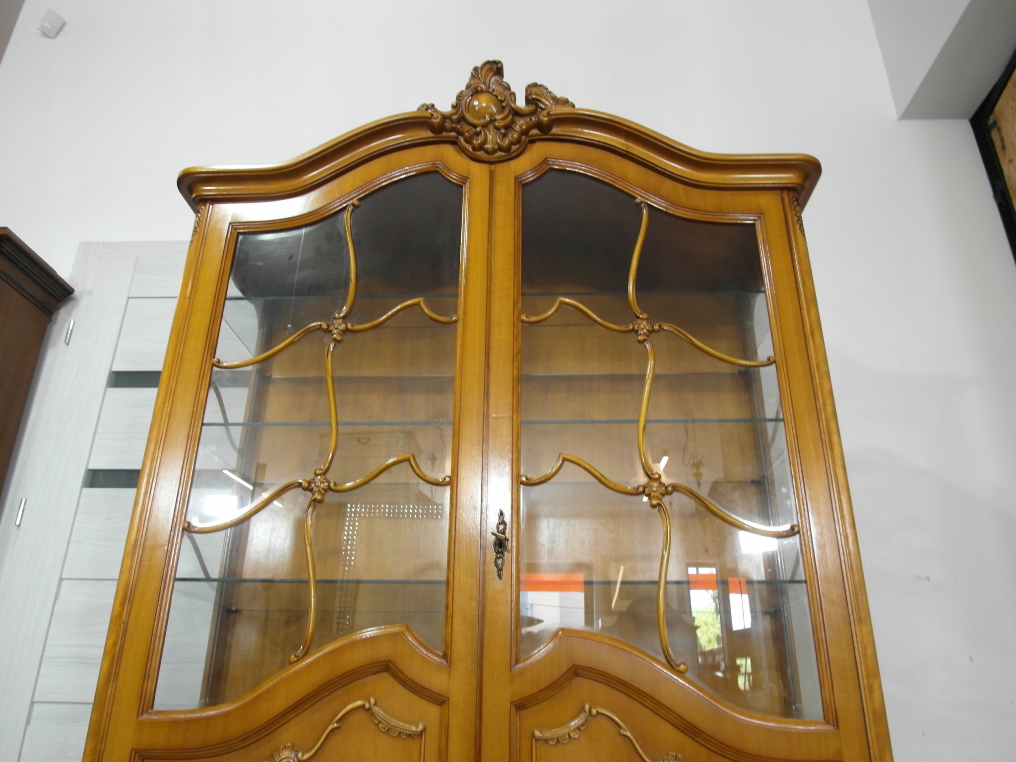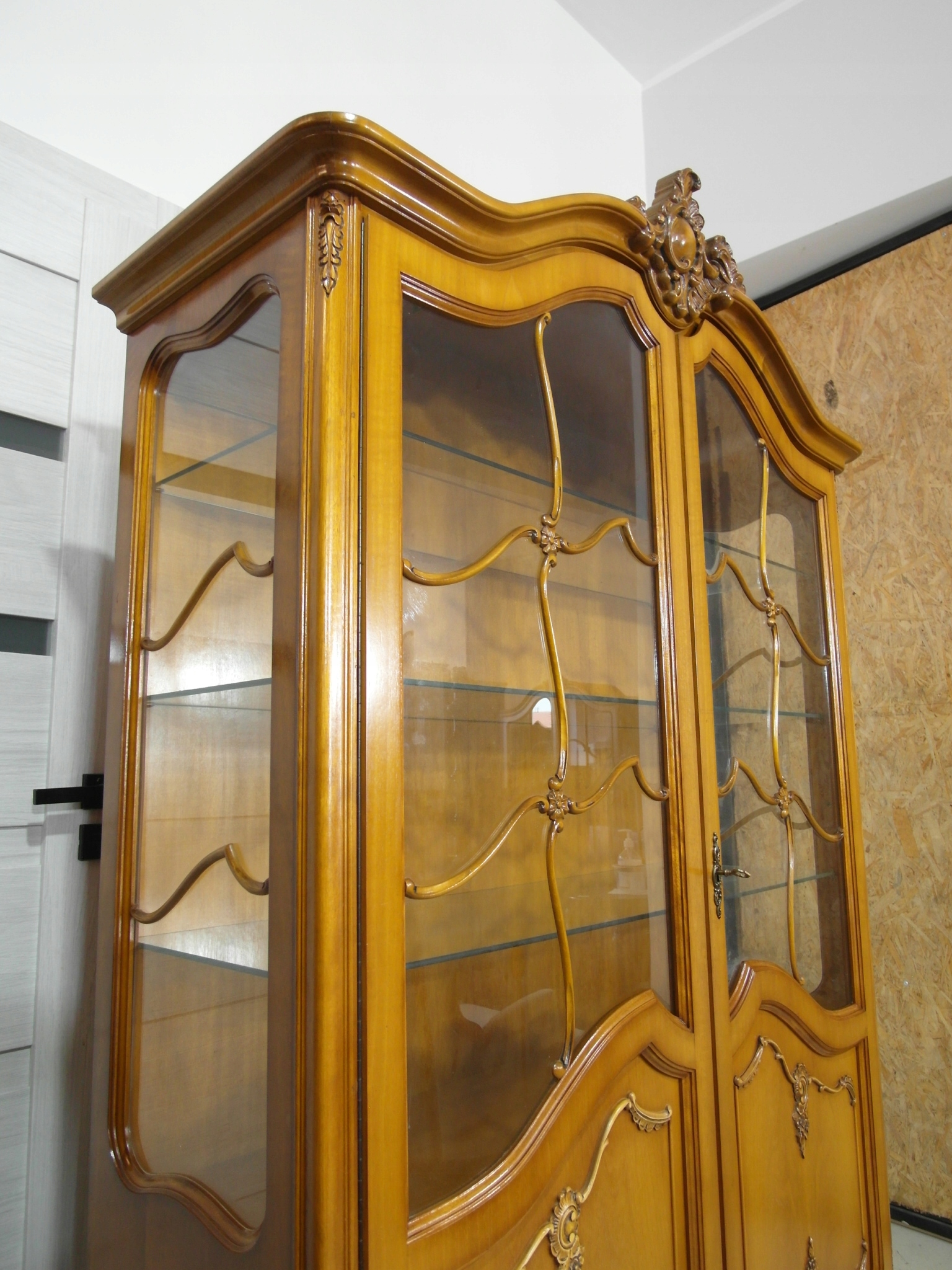 Opis: witryna przeszklona ZAMYKANA NA KLUCZ , W ŚRODKU PÓŁKI , kompletna , wszystko sprawne , oryginalne okucia