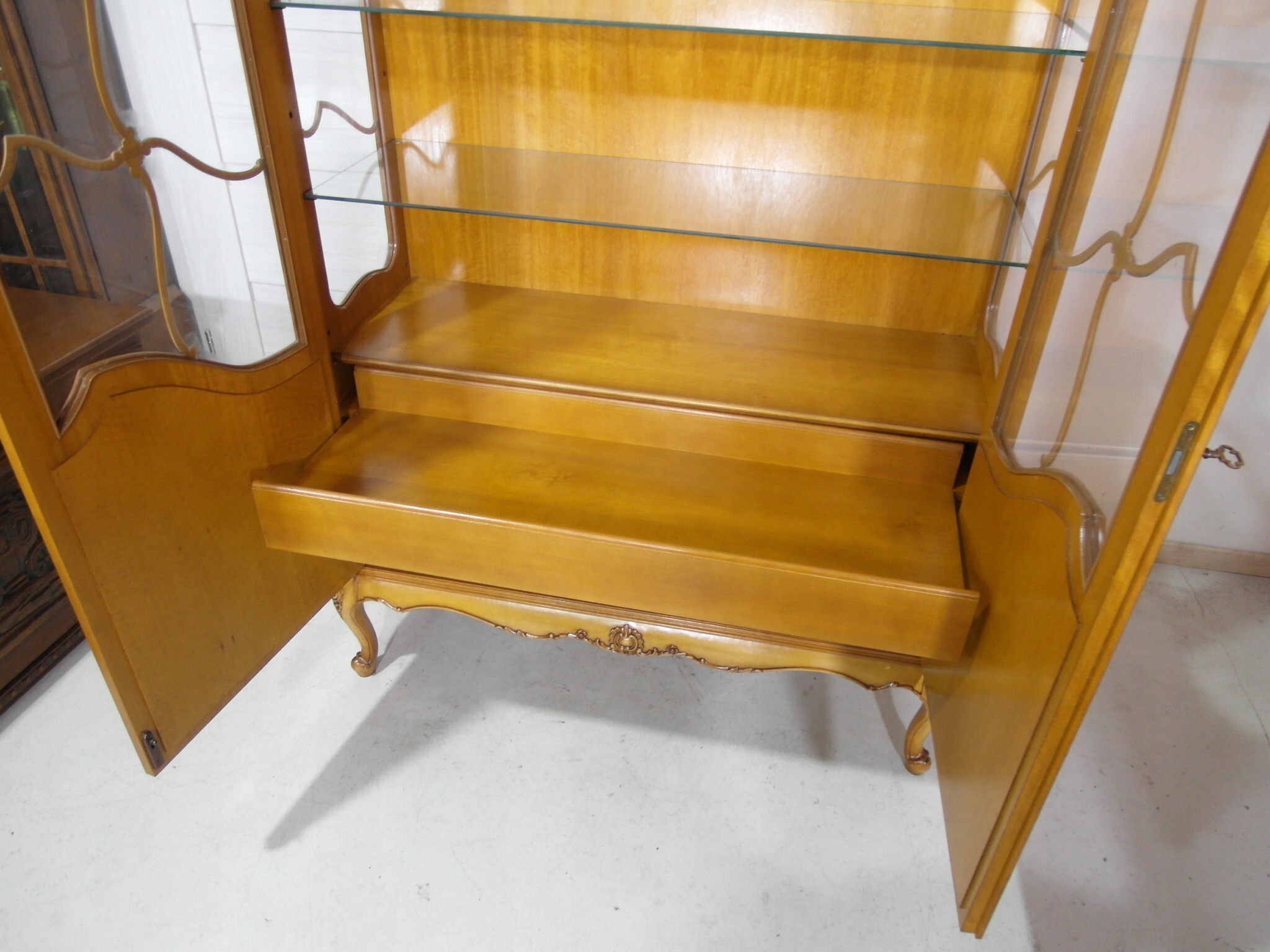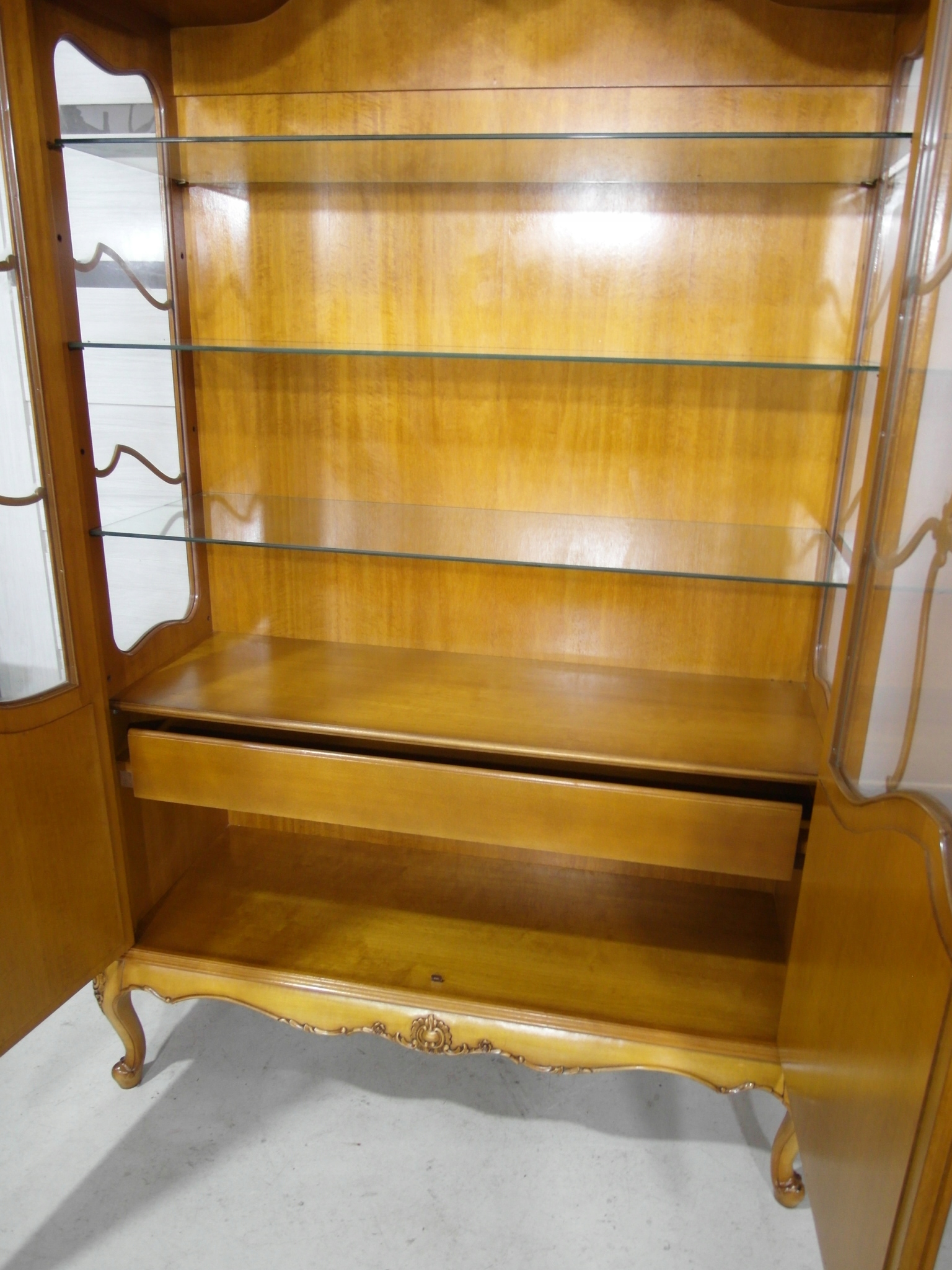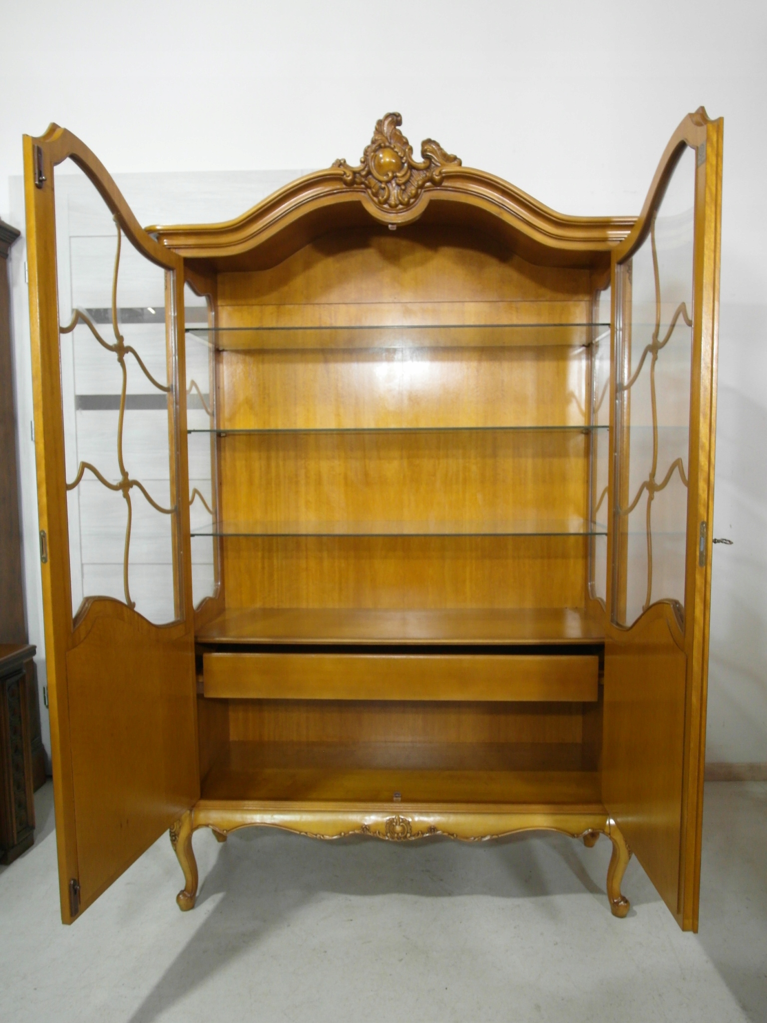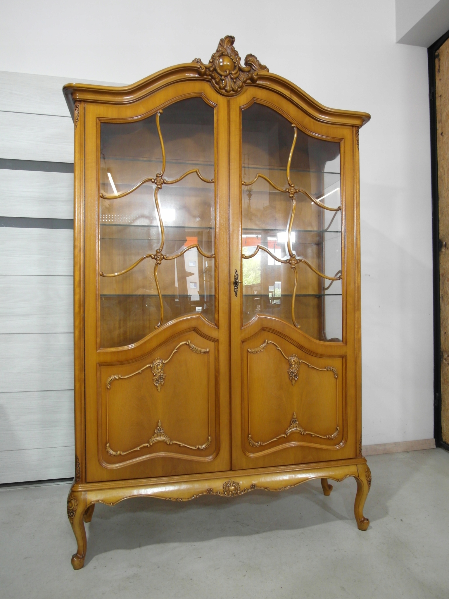 Opis: witryna przeszklona ZAMYKANA NA KLUCZ , W ŚRODKU PÓŁKI , kompletna , wszystko sprawne , oryginalne okucia