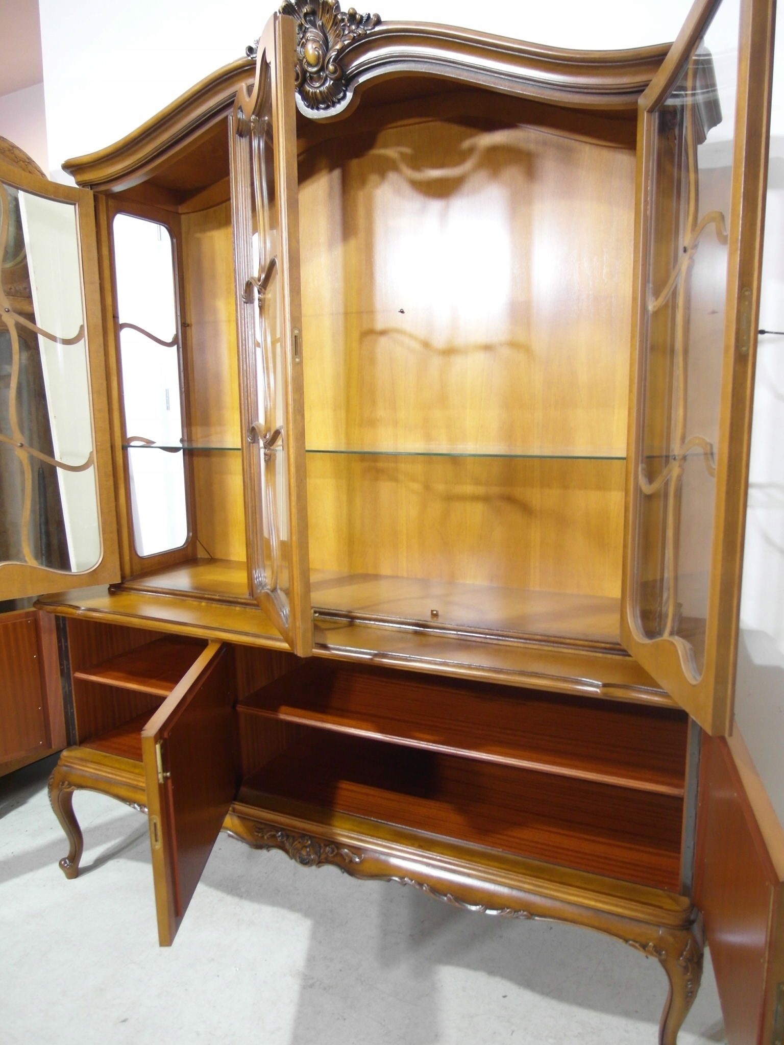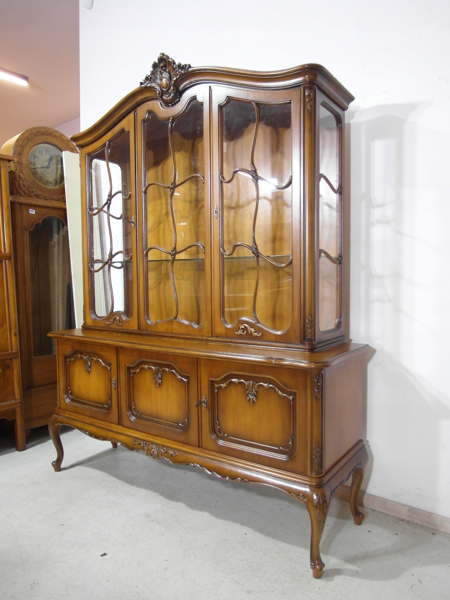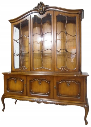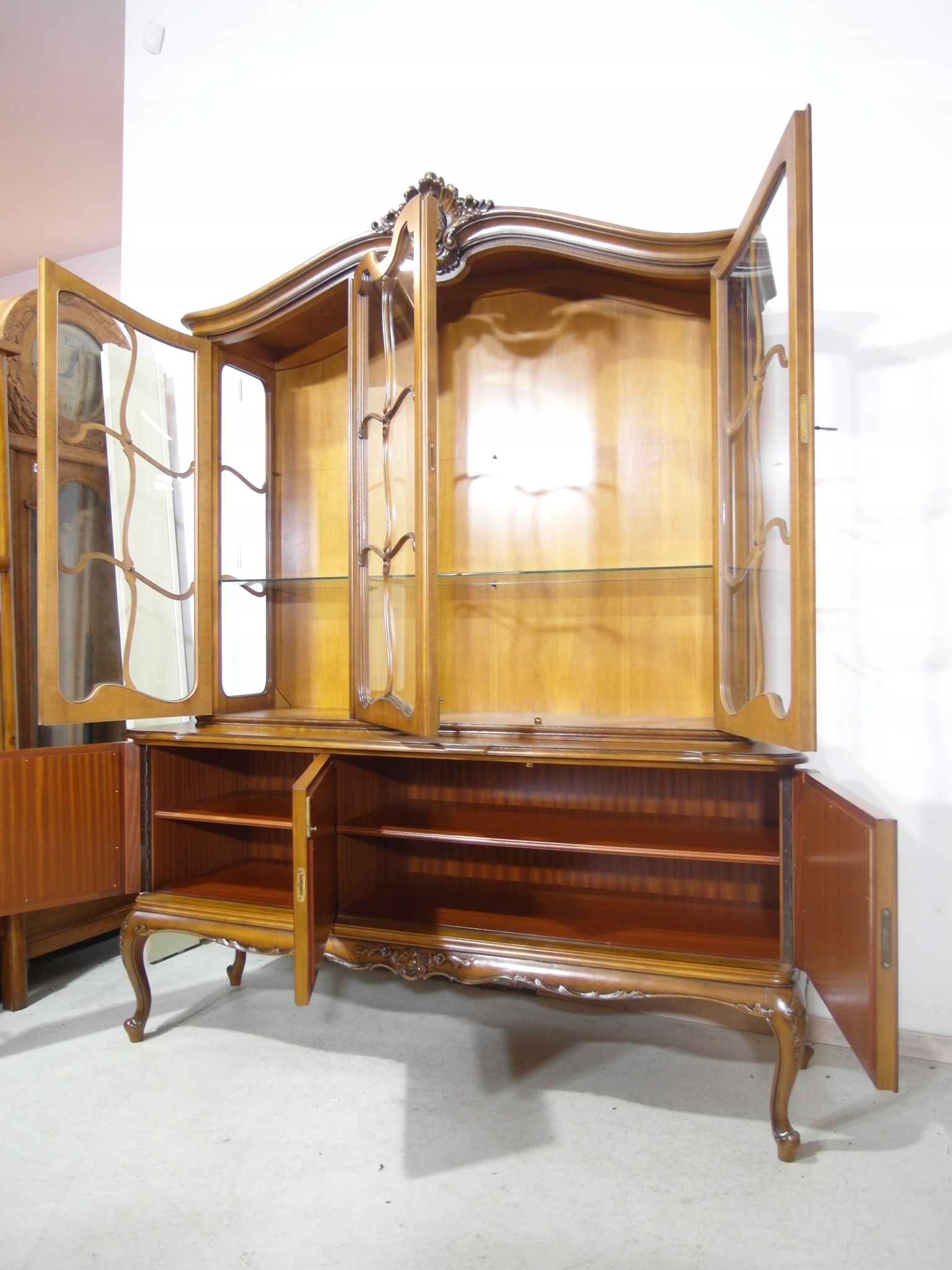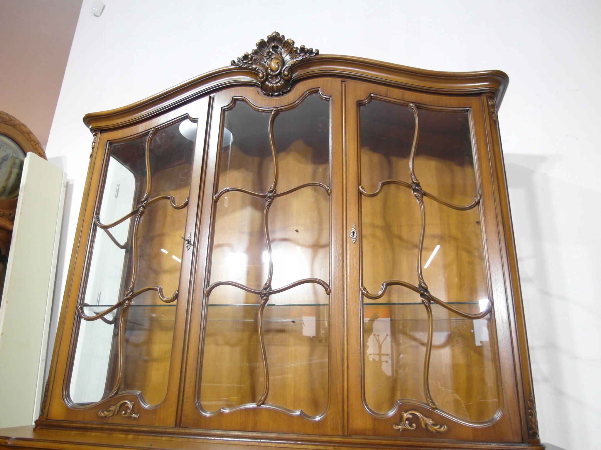 Opis: witryna przeszklona ZAMYKANA NA KLUCZ , W ŚRODKU PÓŁKI , kompletna , wszystko sprawne , oryginalne okucia, 2 klucze w komplecie